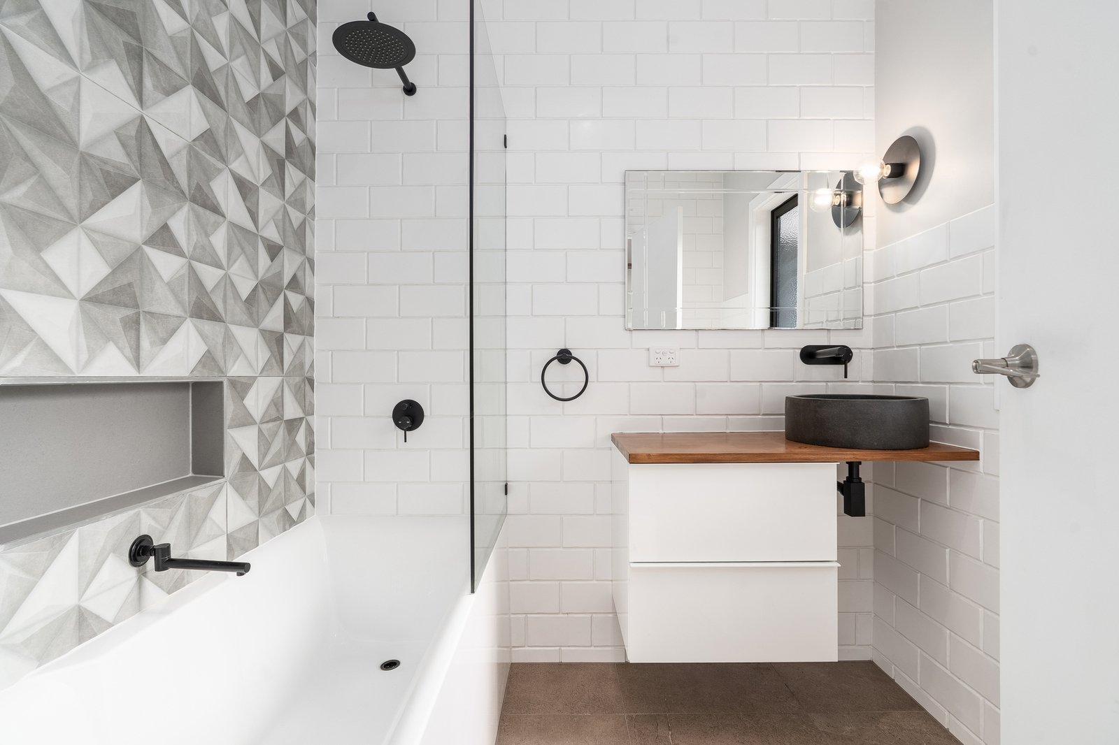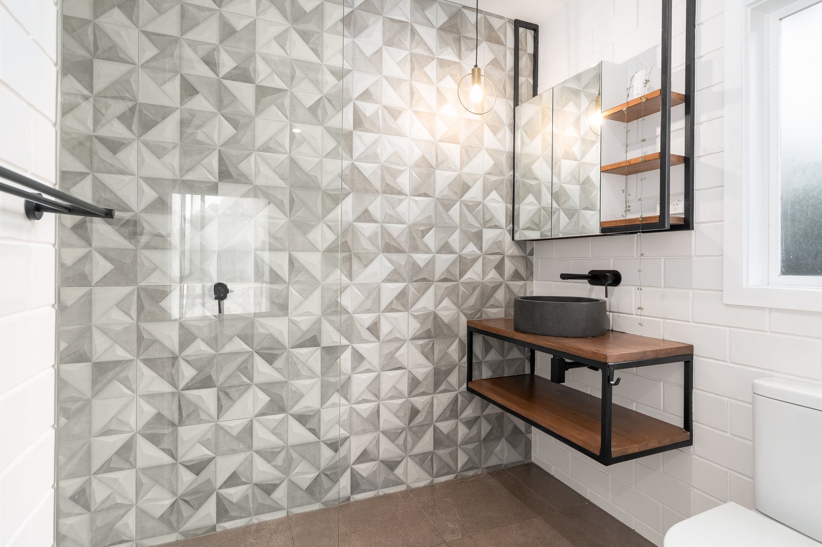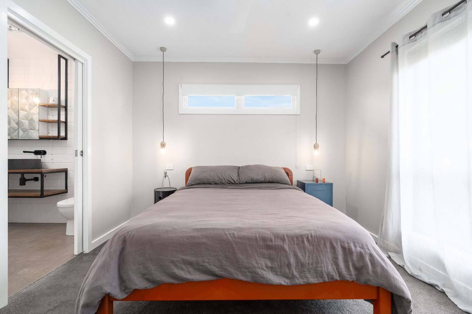 • Three bedrooms. Main bedroom with walk in robe, stylish pendant lighting and a well-appointed ensuite with tasteful dark basin and tap wear.