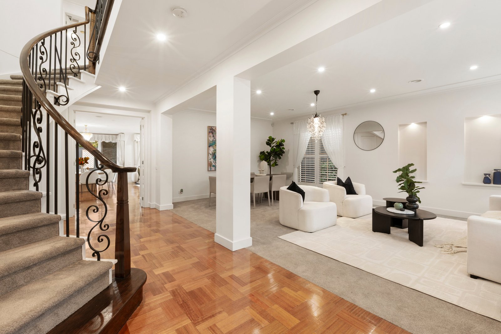 A sense of grandeur is immediately apparent as gleaming parquetry sweeps past the elegant formal domain to a vast family living zone. The gourmet kitchen is a true entertainer’s hub, featuring a stone island, quality appliances and abundant custom storage, with a huge adjoining laundry doubling as a butler’s space and providing internal access to the remote double garage.