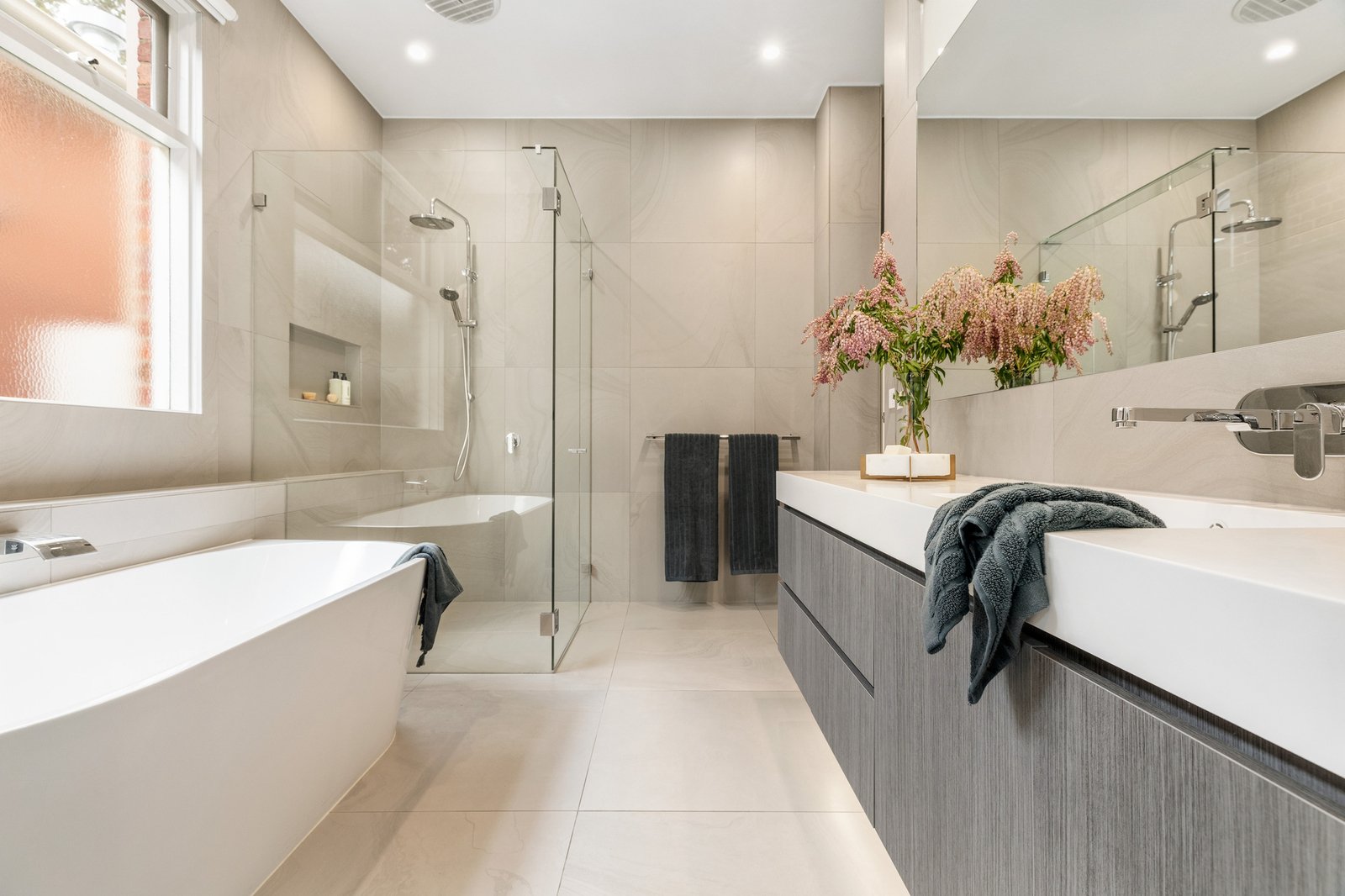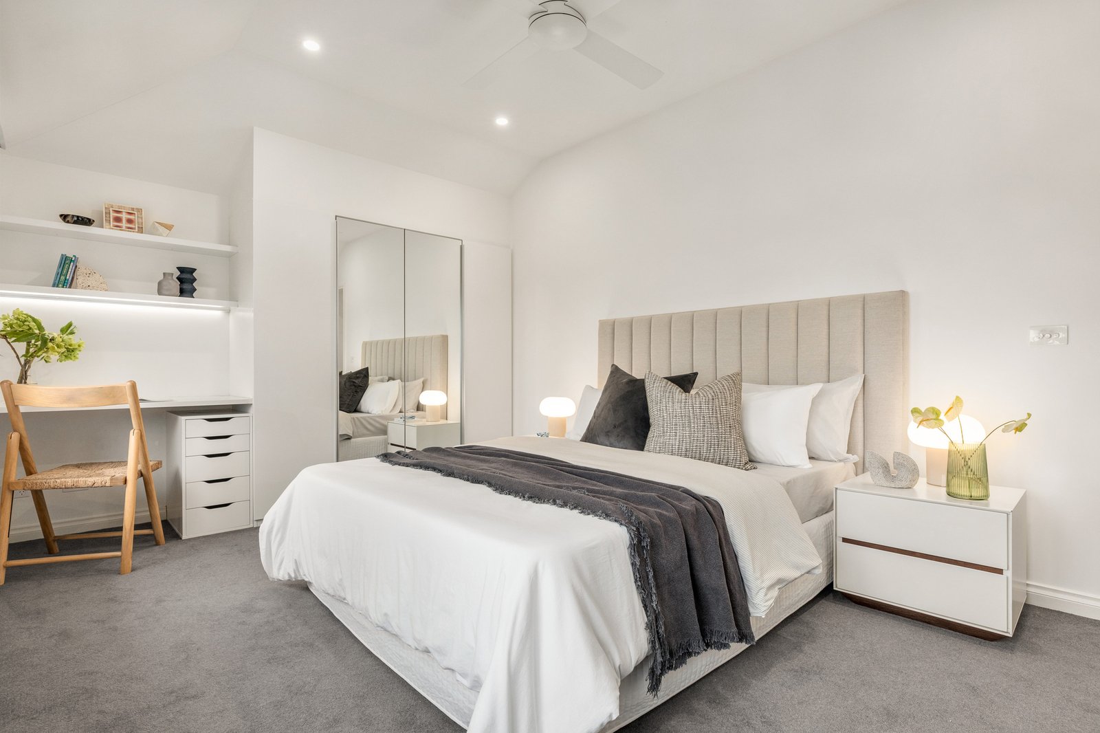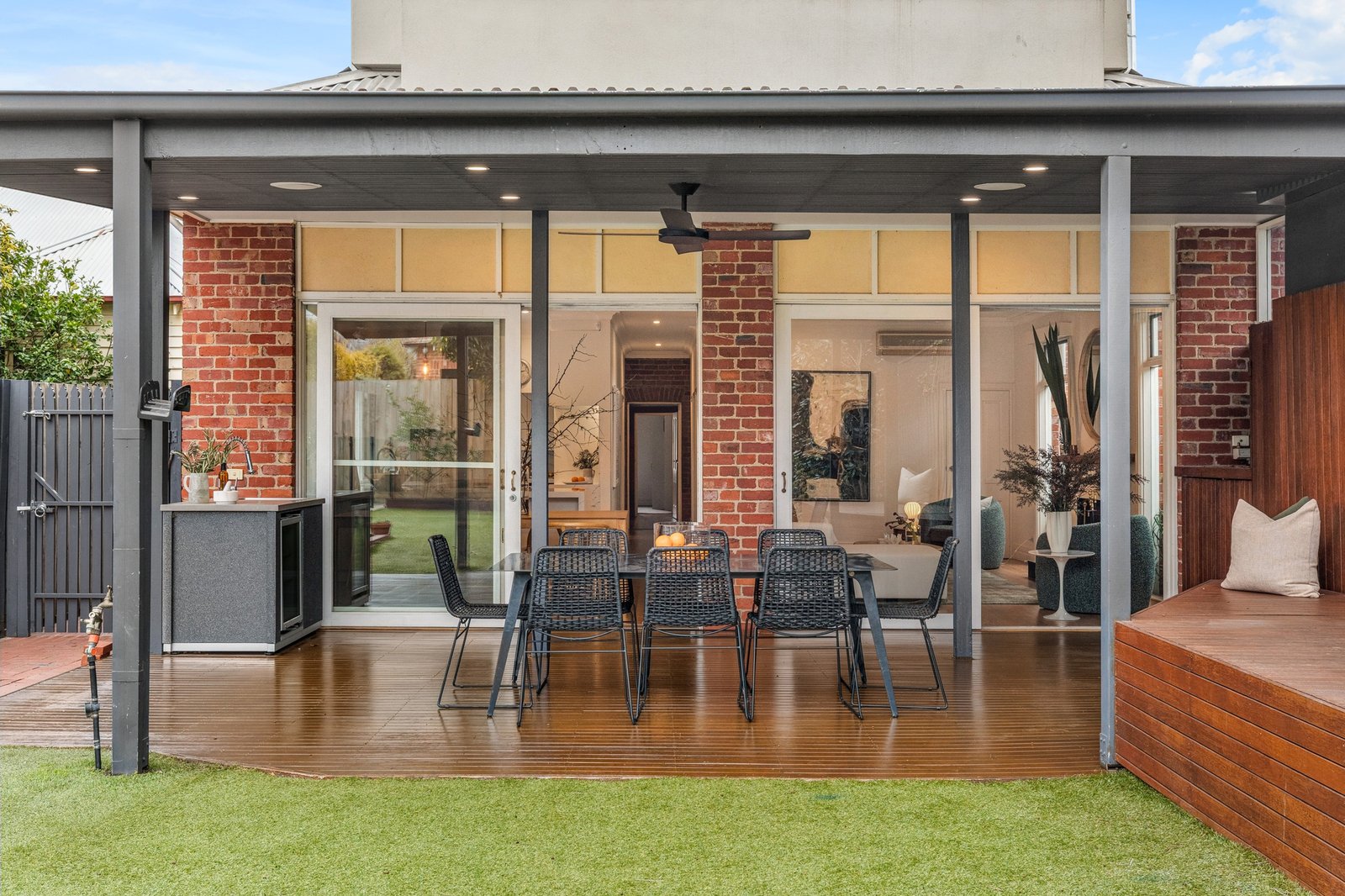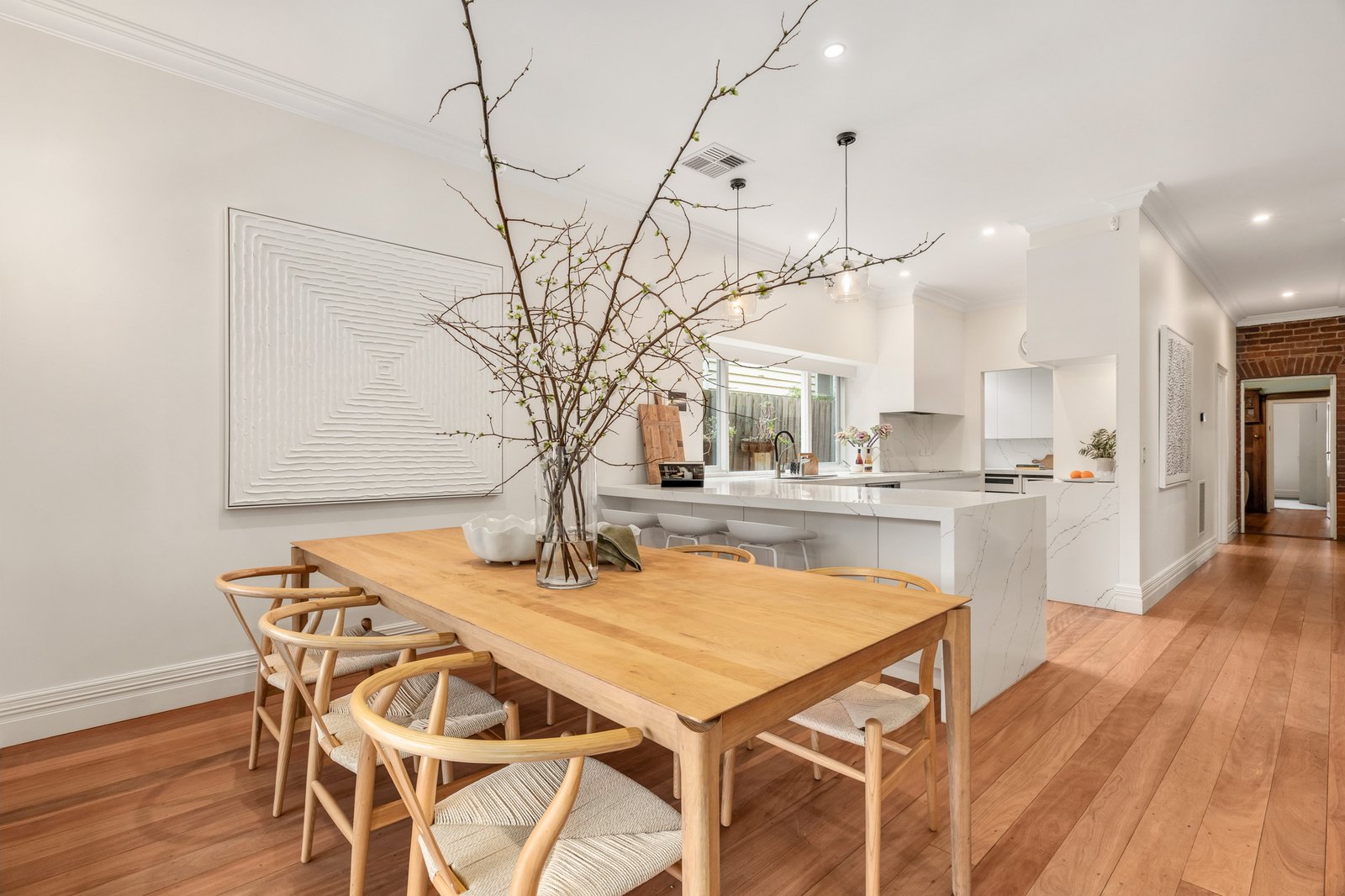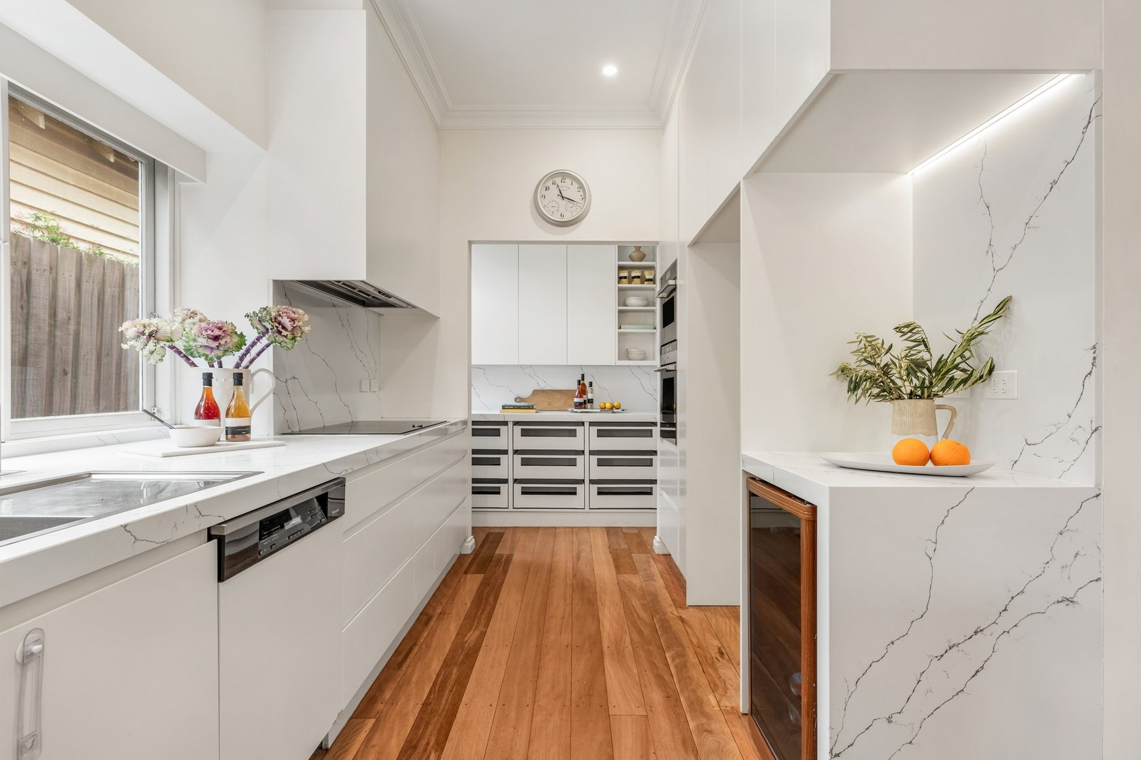 Generous original rooms have been transformed to feature a just-completed, two-person home office and two robed bedrooms each with luxe ensuite providing an ideal master alternative or guest suite. An inviting wood-panelled sitting room (open fireplace) retains all the character and charm of the 1880s with an antique bluestone doorstep signifying a seamless transition from old to new.
