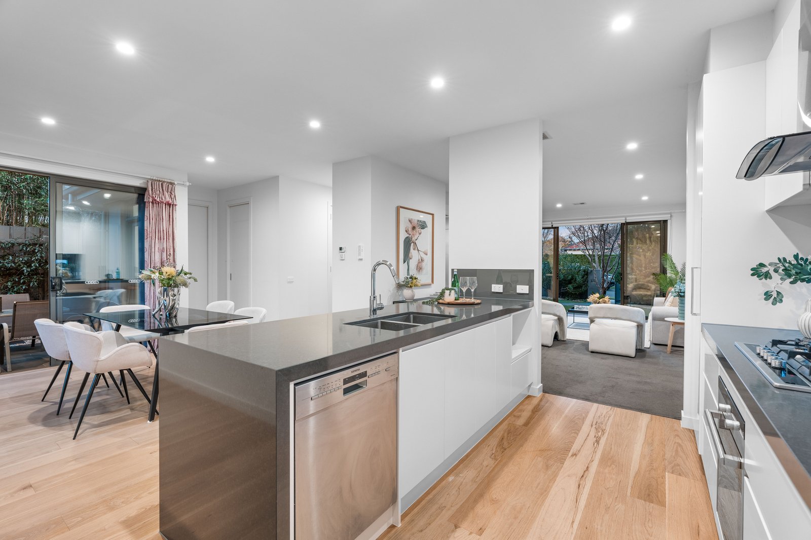 Designer detailed with plush charcoal carpets, warm timber floors, and sleek stone benchtops, the home is appointed with zoned climate-control to make life comfortable and an intercom plus an alarm to guarantee security. Even the car accommodation is well-appointed with parking for up to three cars including an auto garage.