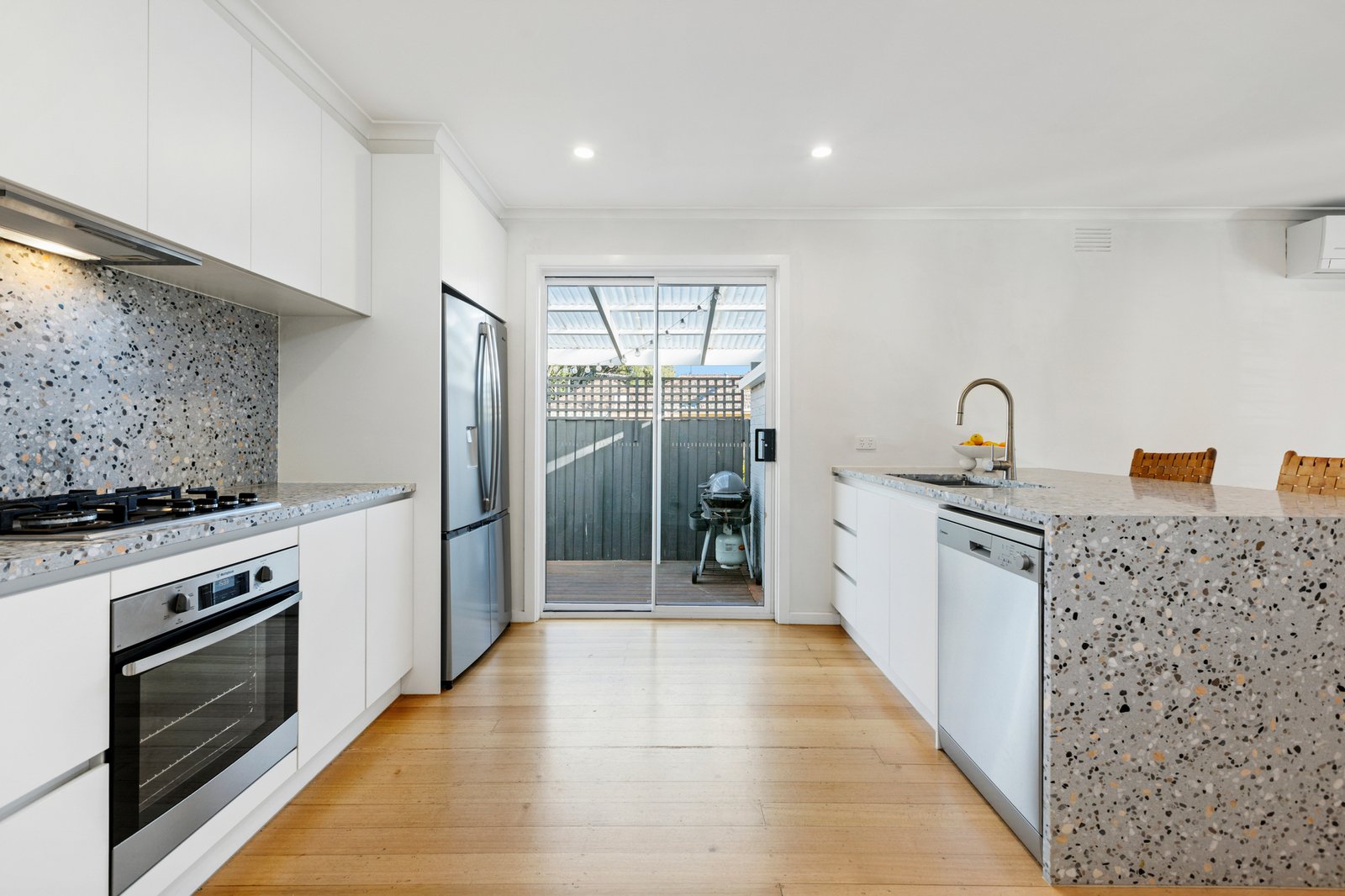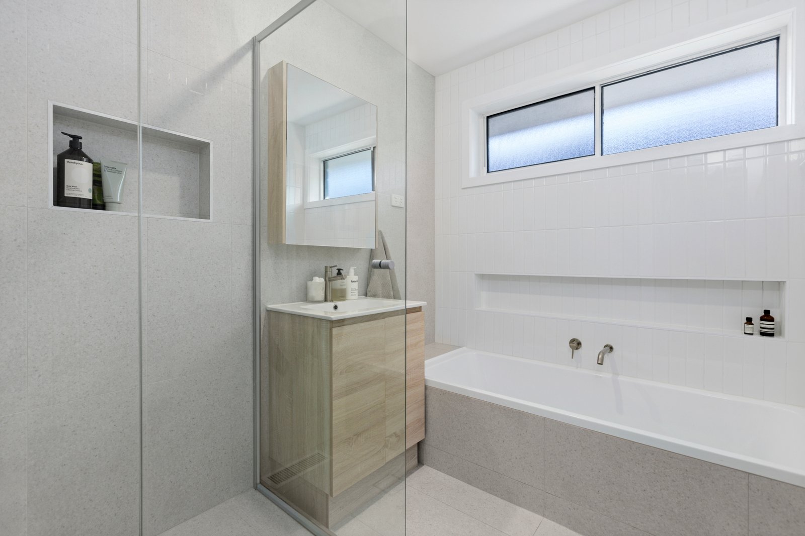 A true bonus for families is the inclusion of three spacious bedrooms, including the main room with fitted wardrobes and a contemporary fully tiled ensuite with ceiling-mounted rain shower. The remaining bedrooms are serviced by a second luxe bathroom with bath and practical separate WC, while a smart laundry offering storage and yard access is also included. Warmed by ducted heating and providing a split system and fans for summer comfort, the home is concluded by a neat secure garden and lock-up garage.