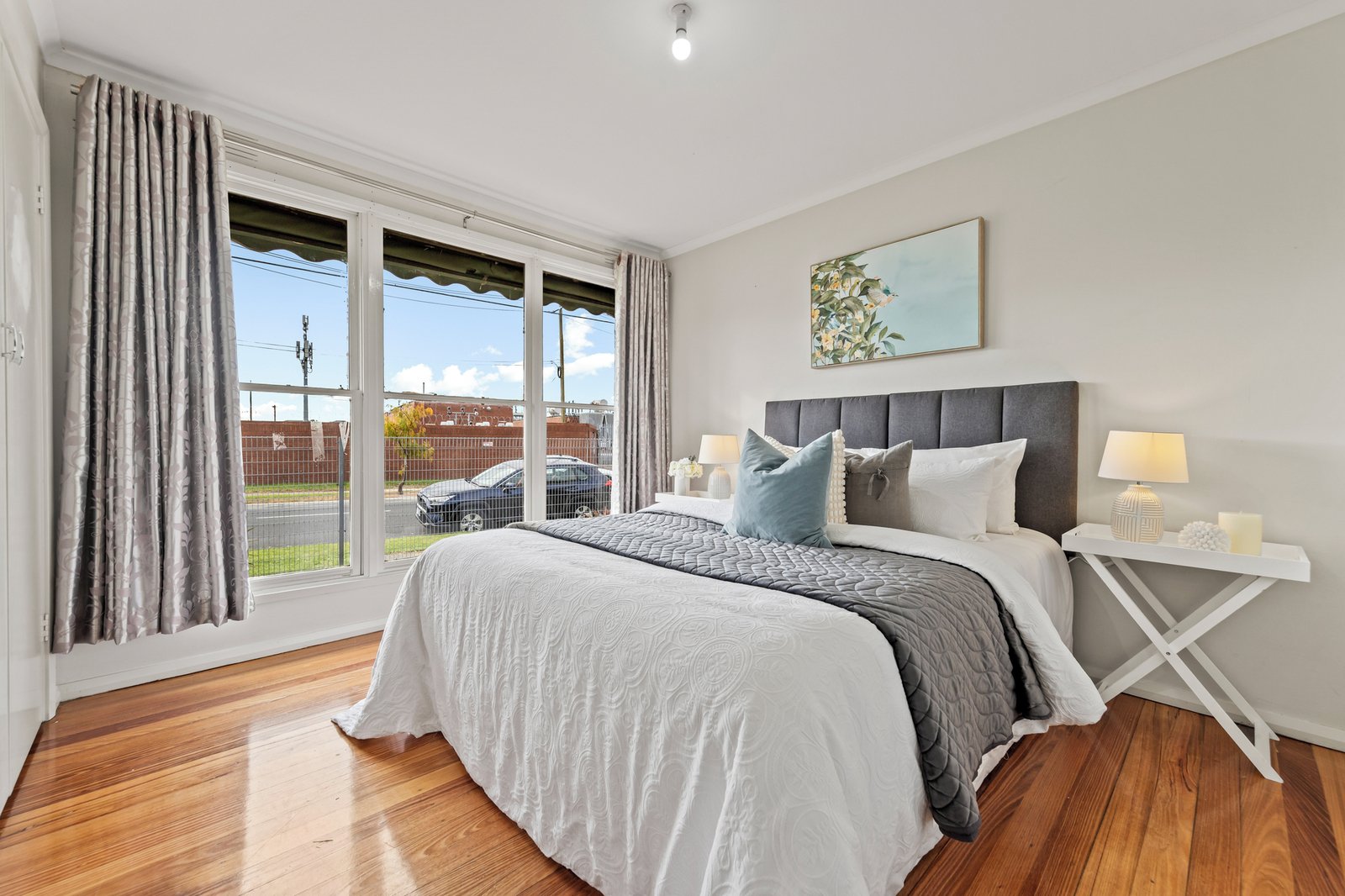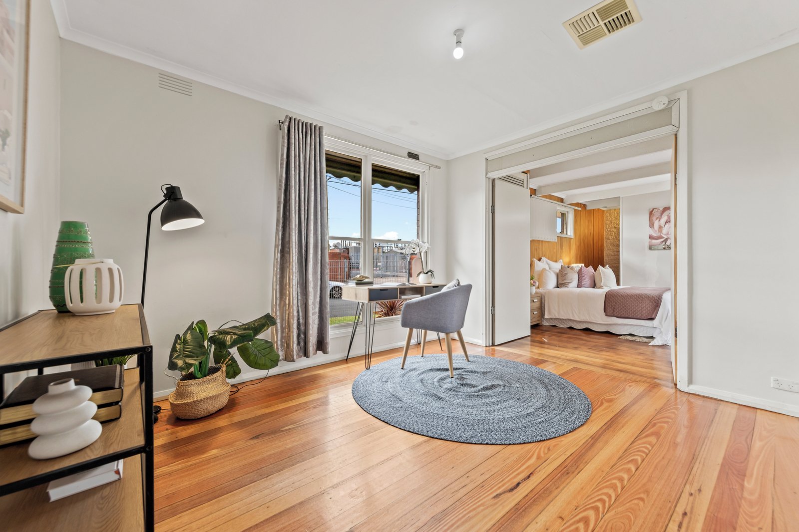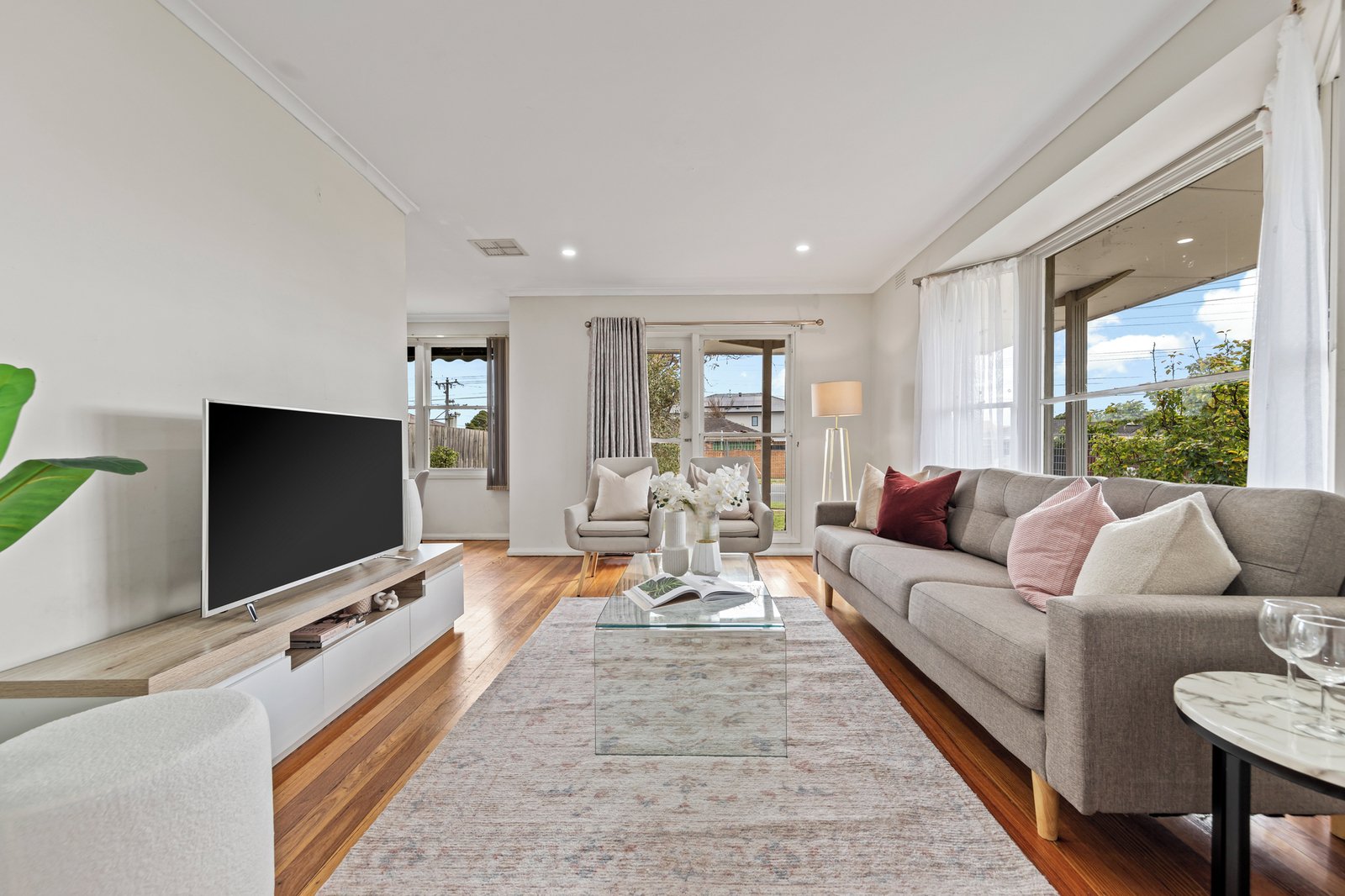 • Sunlit front living room with polished hardwood floors