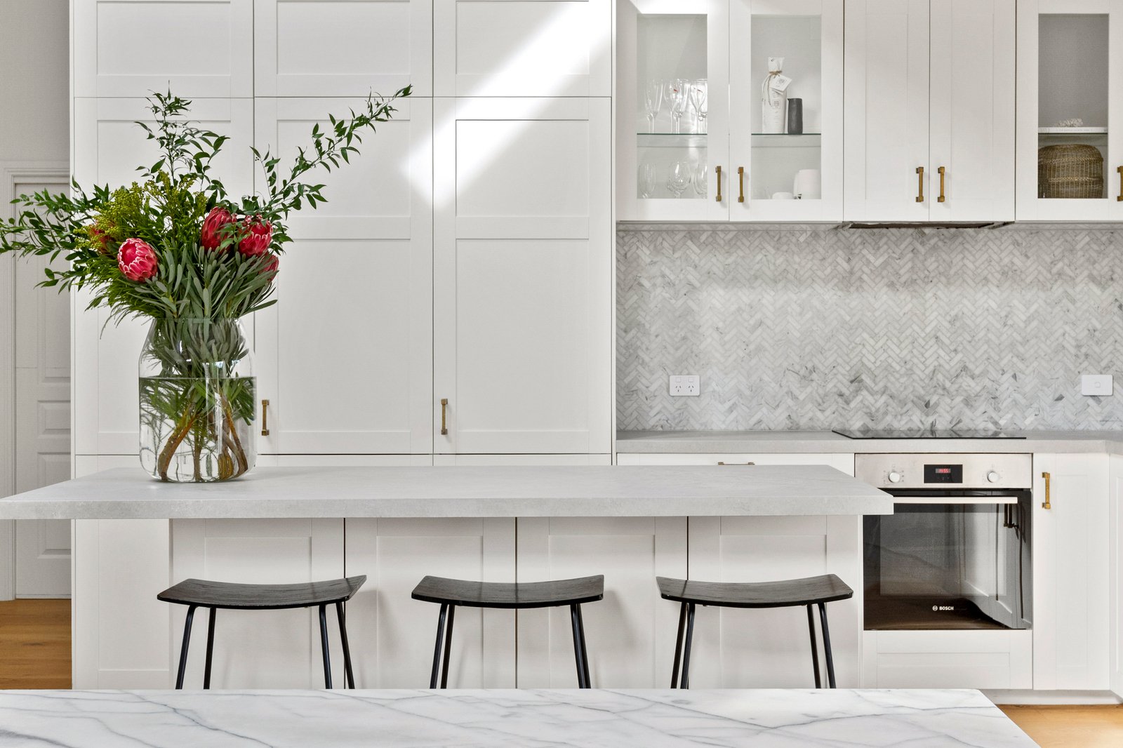 Herringbone marble, shaker cabinetry and stone surfaces in the culinary heart are underscored by integrated premium Bosch appliances including a fridge, dishwasher and induction cooktop, with a considered layout that encourages natural flow around the island and out to the oversized undercover verandah, where outdoor dining and entertaining unfolds overlooking the firepit zone and the deep sweep of the 1,596 sqm (approx) expanse.