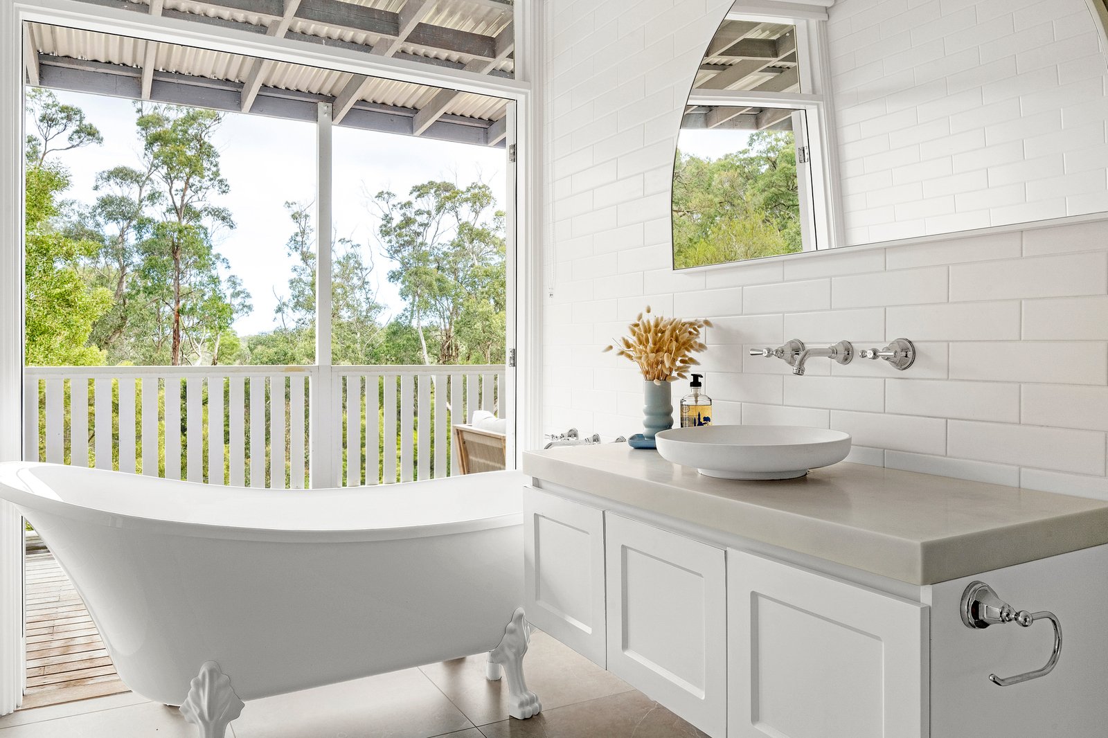 French doors open each of the three bedrooms to a verandah that traces the home’s edge, culminating in a primary suite with a walk-in robe and a dual-access ensuite, where a clawfoot bath takes pride of place, inviting light, luxury and serenity.