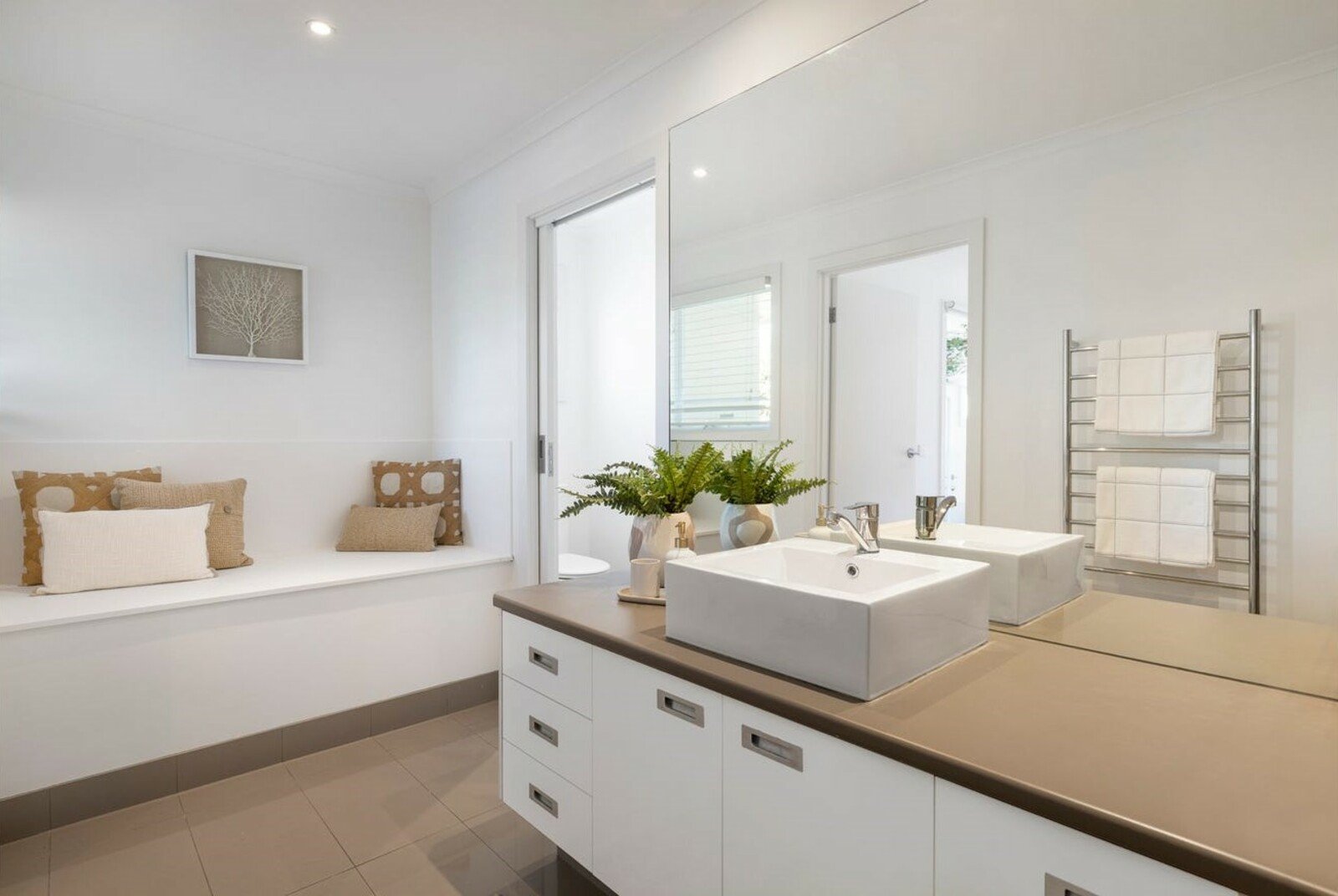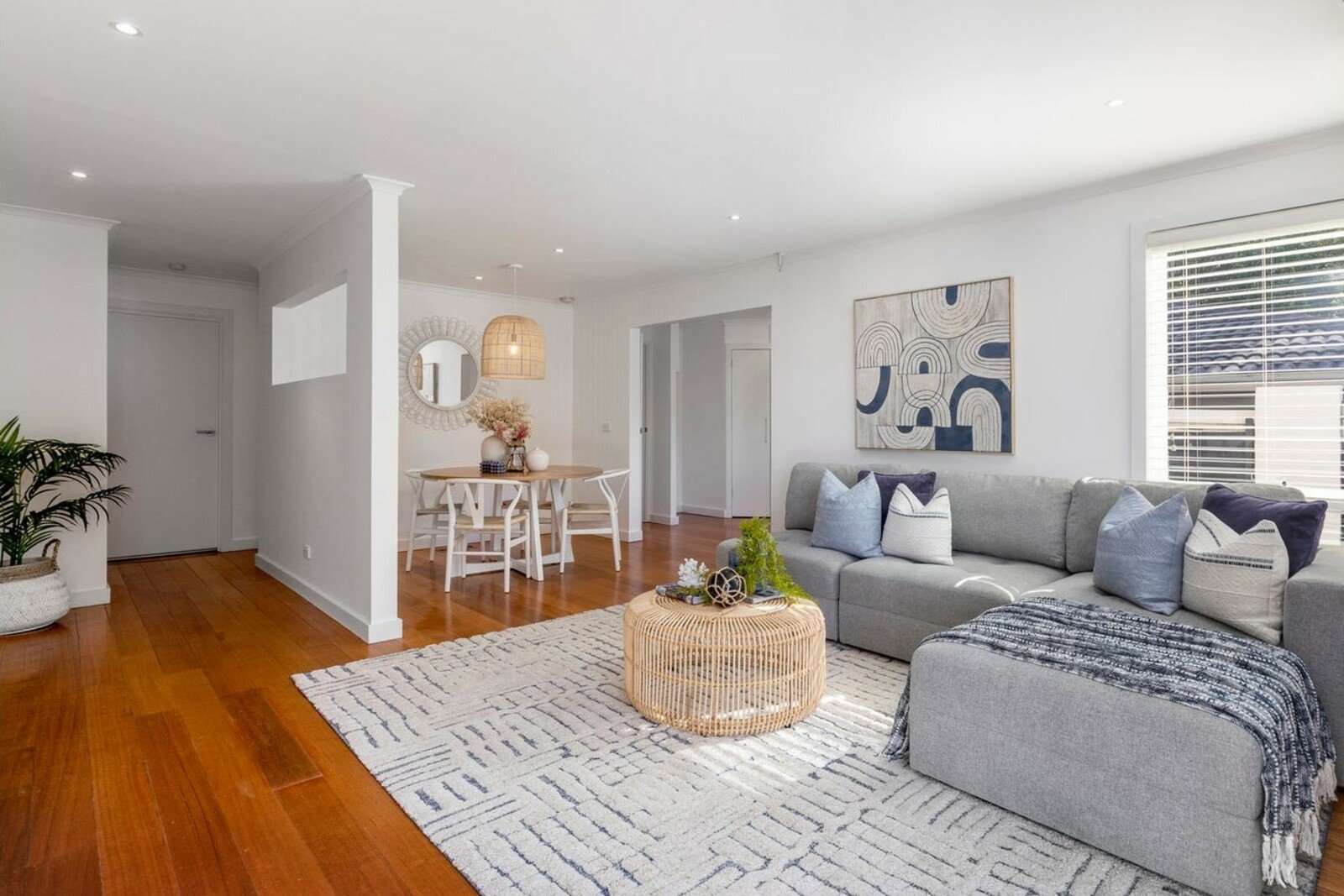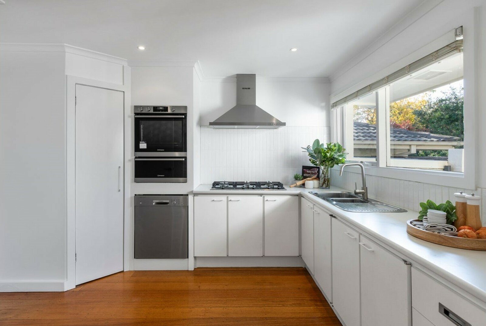 Gleaming hardwood floors sweep through the entrance foyer to a light-filled lounge with tri-fold glass doors opening to the deck. Dining is beautifully defined by an on-trend pendant light and a clever wall cut-out for a truly contemporary feel. The bright updated kitchen boasts wrap-around benches, the latest subway tiles, quality appliances (updated gas cooking and dishwasher) and a walk-in pantry.