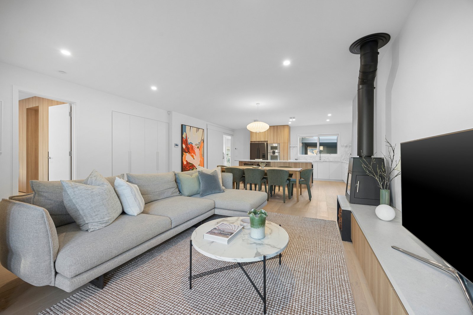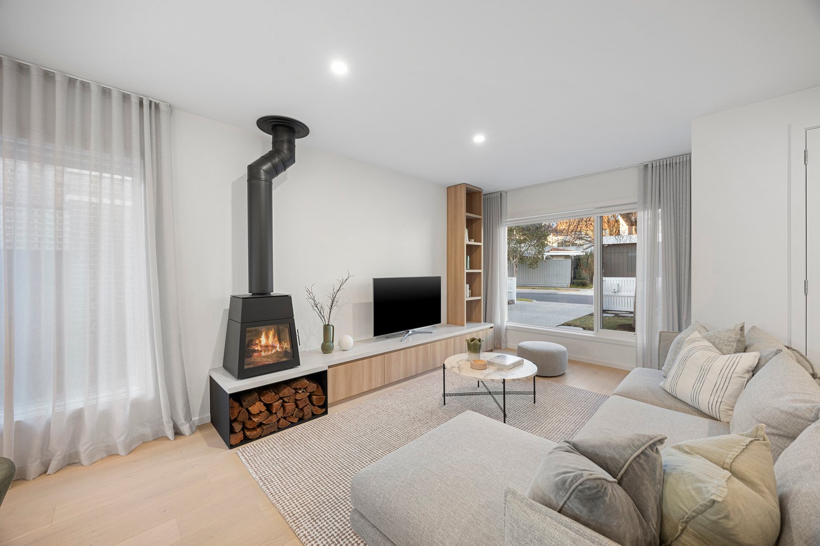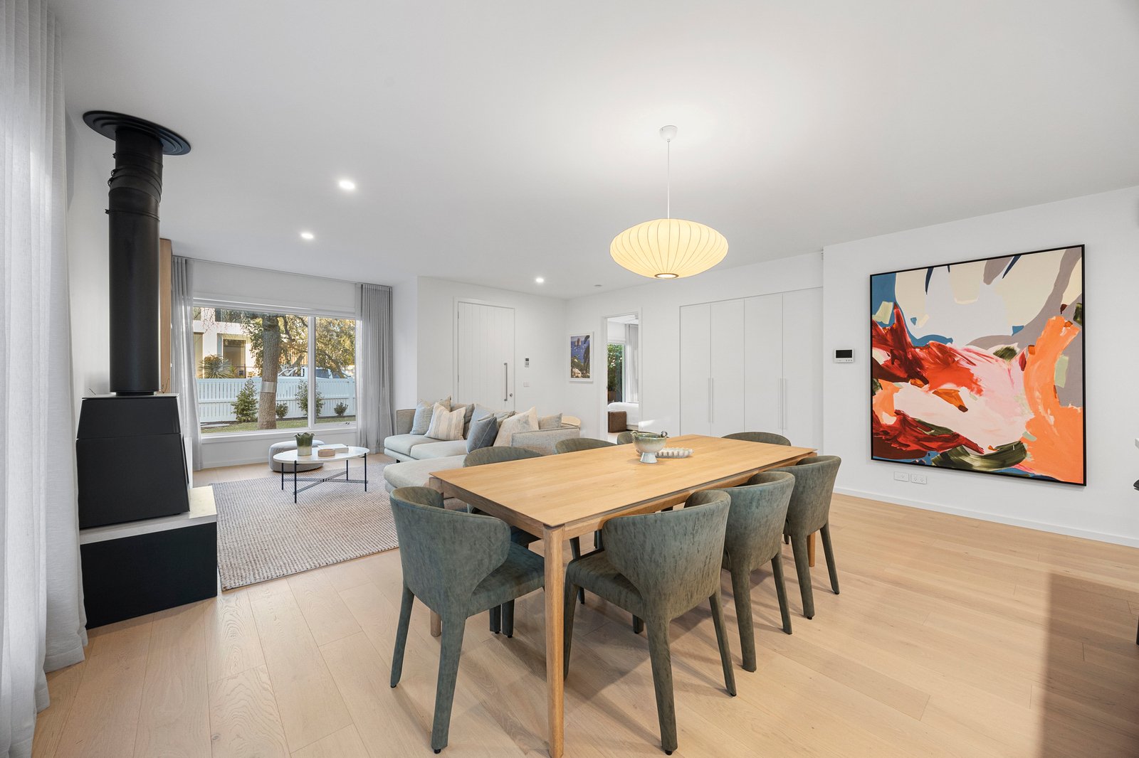The living and dining domain is infused with warmth and ambiance, anchored by a German-made Skantherm Shaker fireplace with custom firewood storage box and finely detailed cabinetry. Leafy views frame the scene, creating a setting equally suited to intimate evenings or everyday moments.