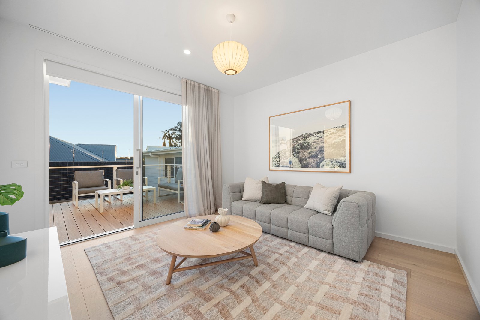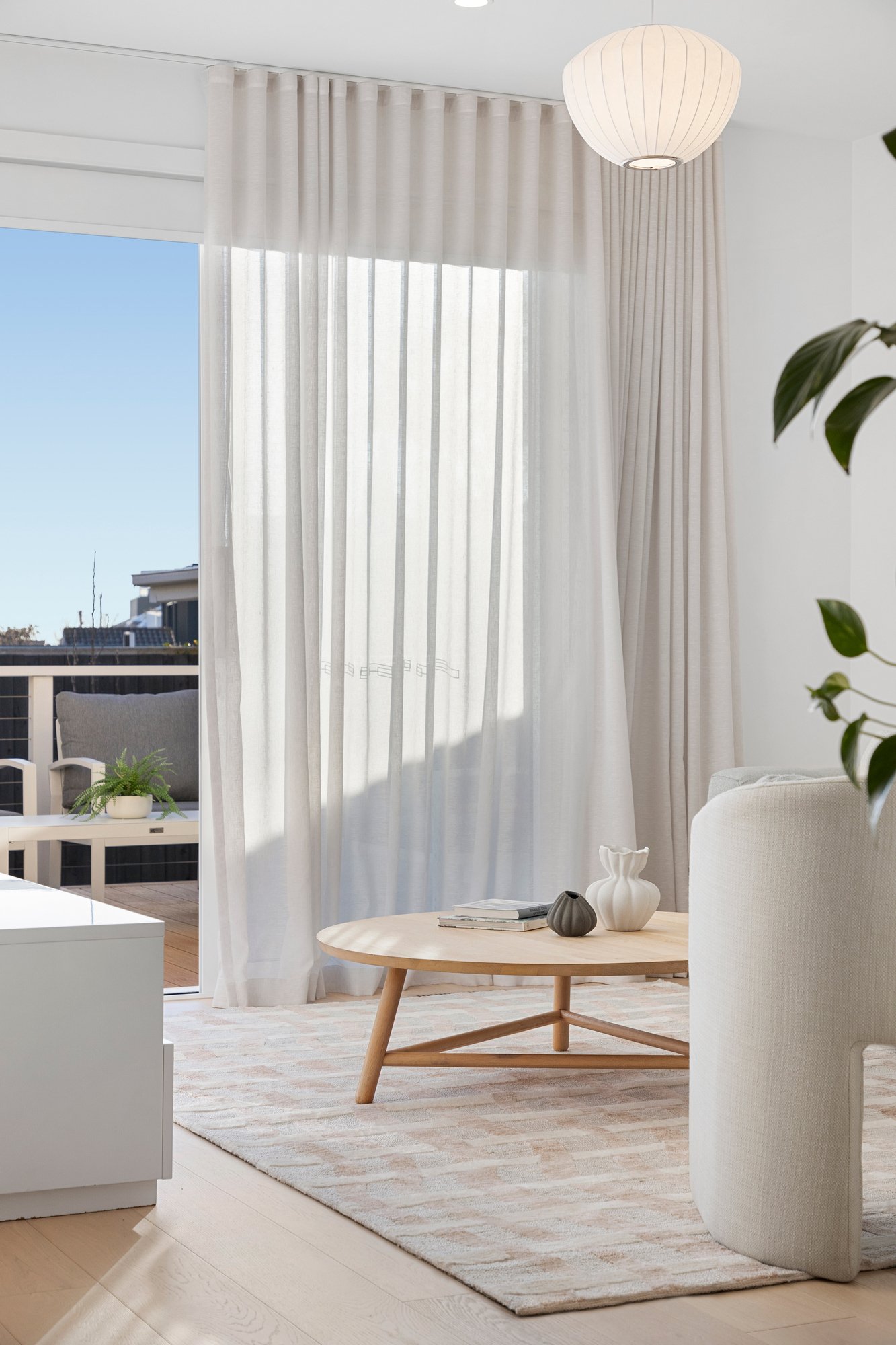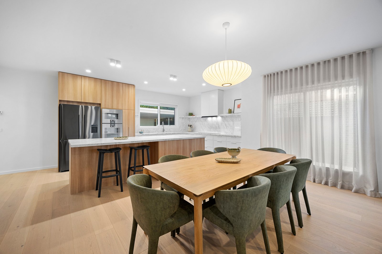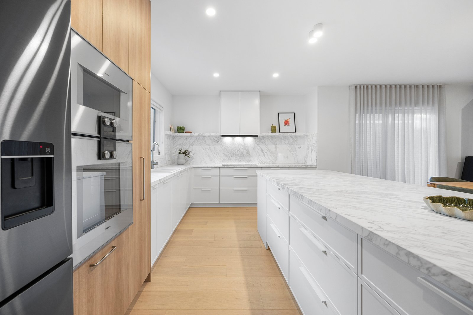 Sunlight pours across wide, high-grade engineered timber floors, their golden hues enhanced by a soothing neutral palette and soft sheer drapery that lends a sense of quiet elegance. Bespoke joinery becomes art within these walls - its clean lines and impeccable finishes shaping an atmosphere of calm sophistication that permeates each space.