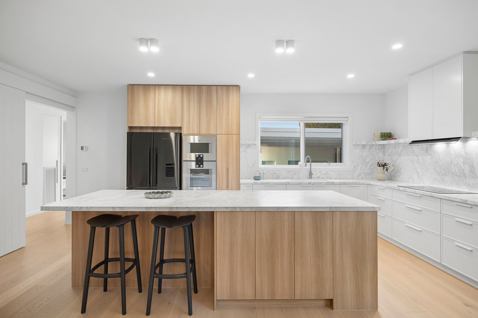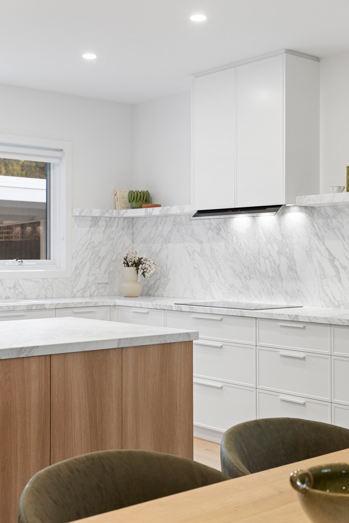 Commanding attention, the kitchen is both a chef’s stage and an entertainer’s delight. A Volakas Arabescato marble-clad island invites guests to gather while meals are prepared with precision Gaggenau appliances - dual ovens (one pyrolytic, one combi-microwave), induction cooktop, and fully integrated rangehood – complemented by a Bosch dishwasher and Vintec wine fridge. Marble benches and splashbacks meet soft-close custom cabinetry, concealing abundant storage and uniting beauty with performance in every detail.