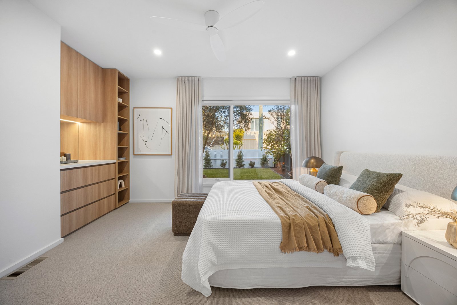 Accommodation pairs indulgence with practicality: premium wool carpet underfoot and ceiling fans for summer ease. The master suite is a serene sanctuary with garden outlooks, elegantly fitted wardrobes, and a twin-vanity ensuite. Two additional bedrooms in a separate wing share a beautifully appointed bathroom with dual vanity, deep soaker bath, and separate shower, while a fourth bedroom or study offers flexibility for evolving needs.