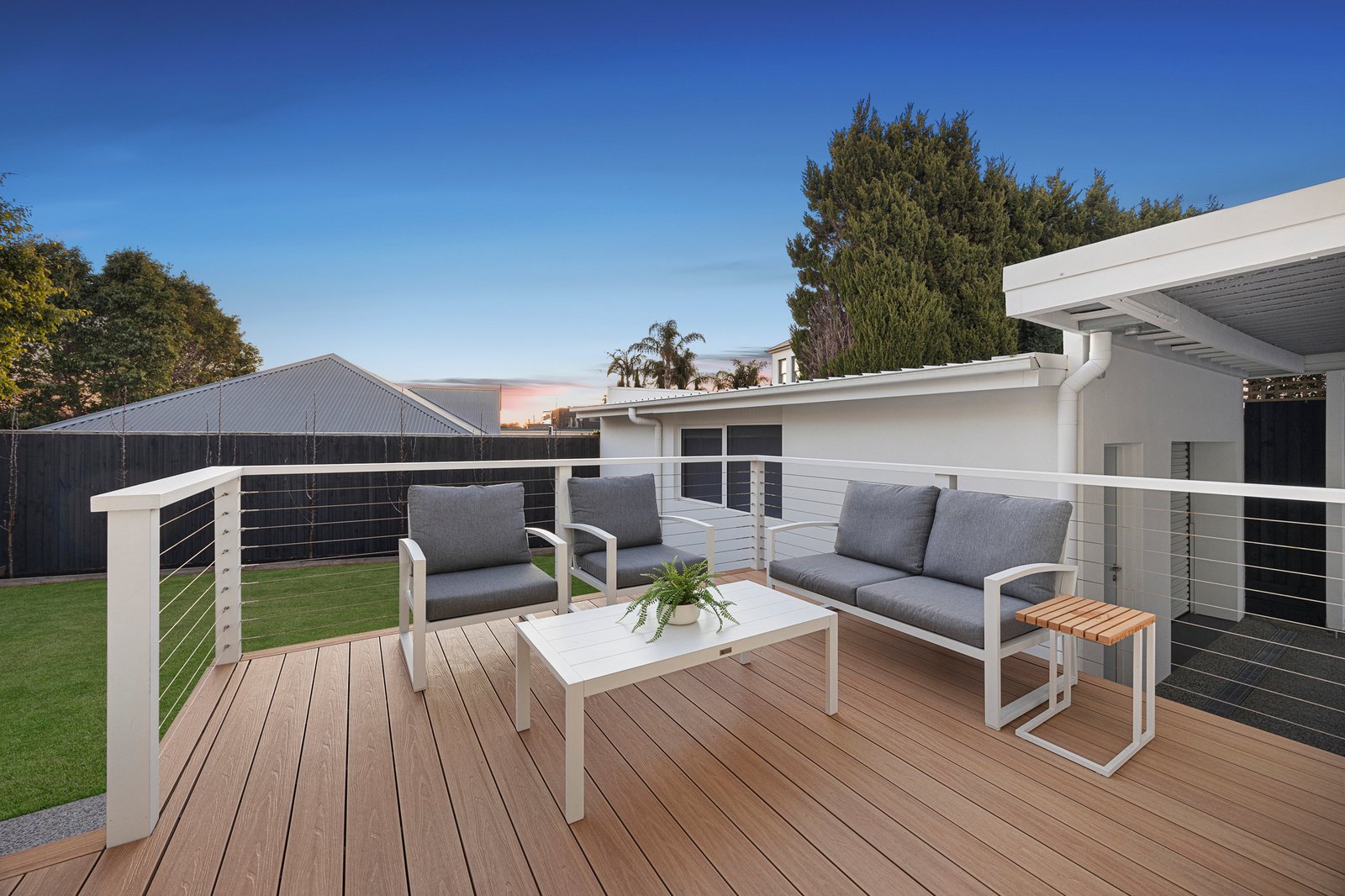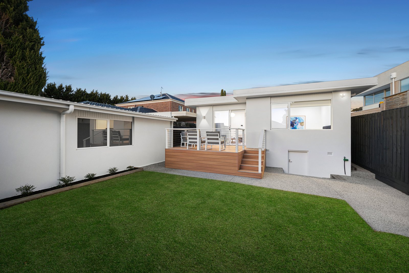 The retreat, situated at the rear, offers a secluded atmosphere for relaxation or family connection, flowing to an elevated dining deck where leafy vistas unfold and steps lead to the low-maintenance garden below.