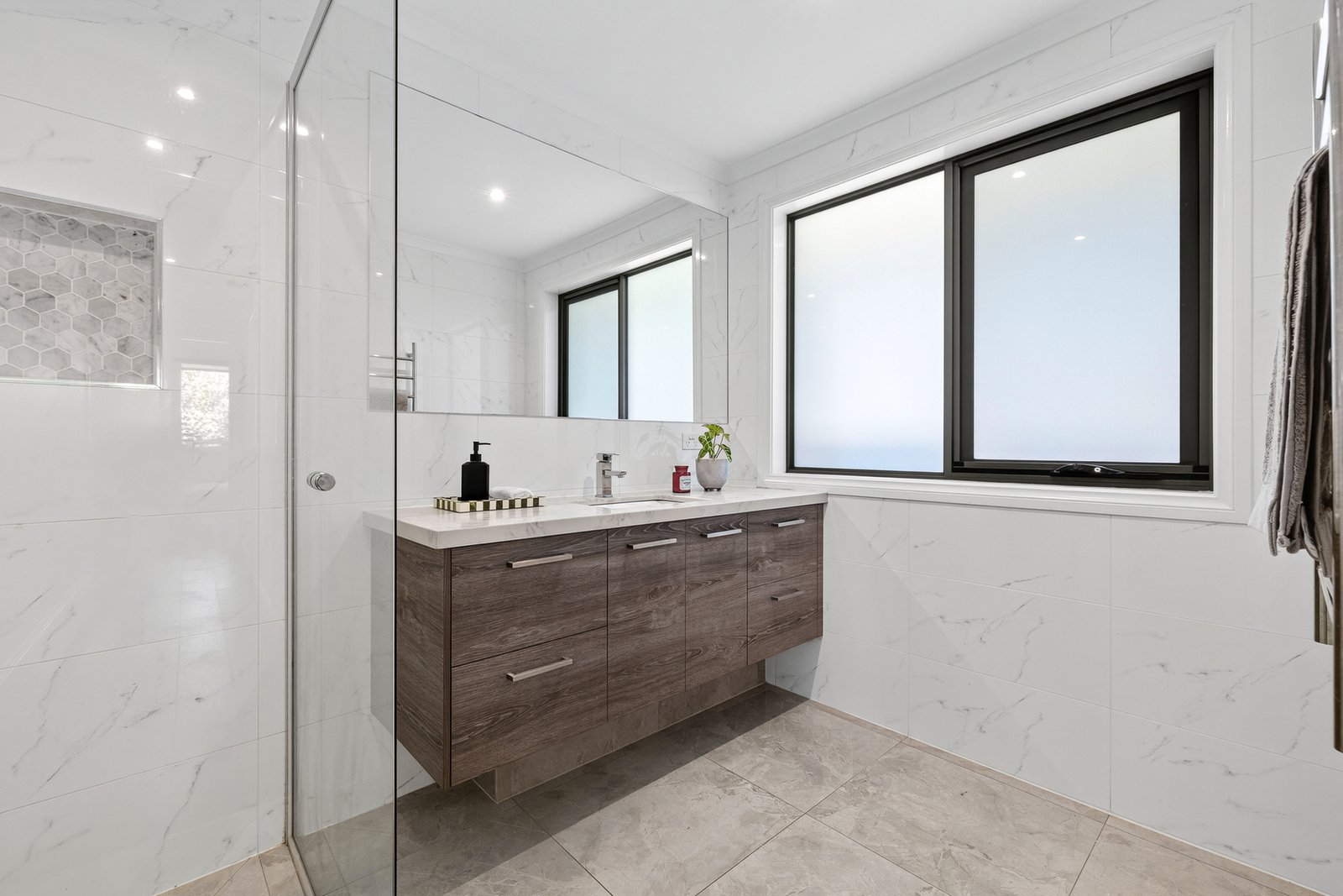The central meals area flows seamlessly into a stone-benched kitchen—textured tile splashbacks and stainless-steel appliances elevate the daily hustle into something sleek and satisfying. The master suite, complete with a walk-in robe and dual-vanity ensuite, feels like a personal retreat, while the two additional bedrooms remain generously bright, supported by a cleverly designed main bathroom.