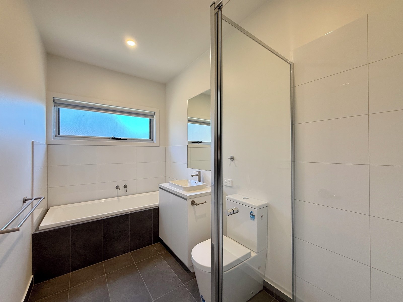 - A central bathroom with bath, toilet, shower and vanity services the home and guests