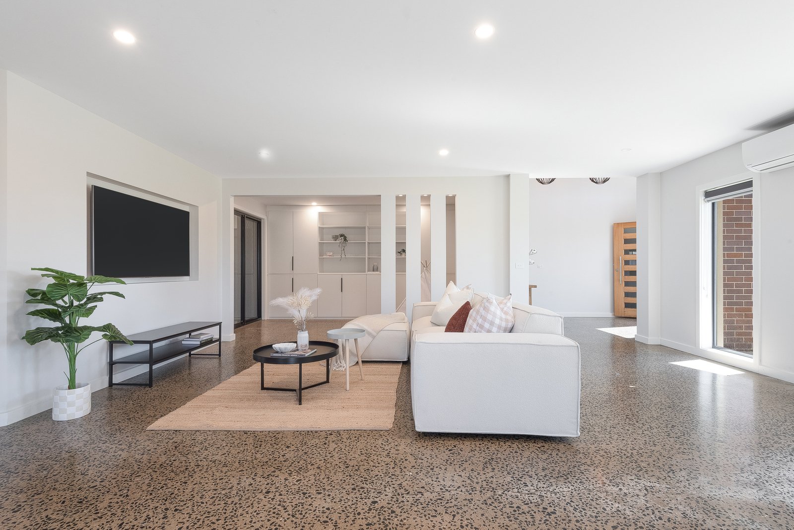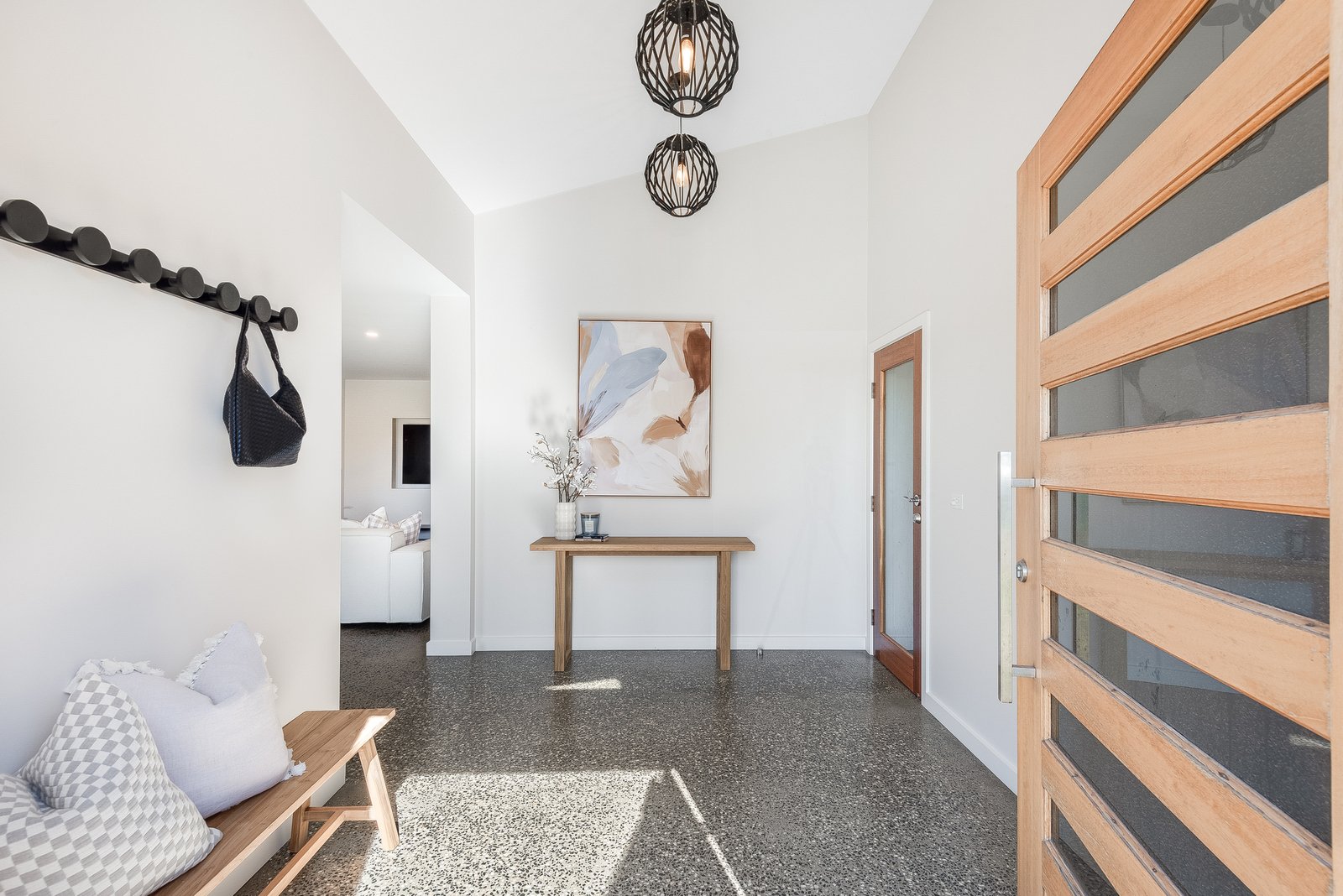 The sleek contemporary façade introduces the sophisticated theme of the home. A wide entry hall with high ceilings showcases light interiors, feature pendant lighting, clean lines and beautiful polished concrete floors. Moving into the living area, north facing windows allow natural light to flow throughout, creating a warm and inviting atmosphere within. An adjoining study features custom cabinetry, bookshelves and storage, offering a well-equipped space to work from home.