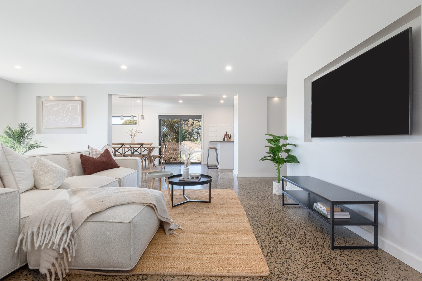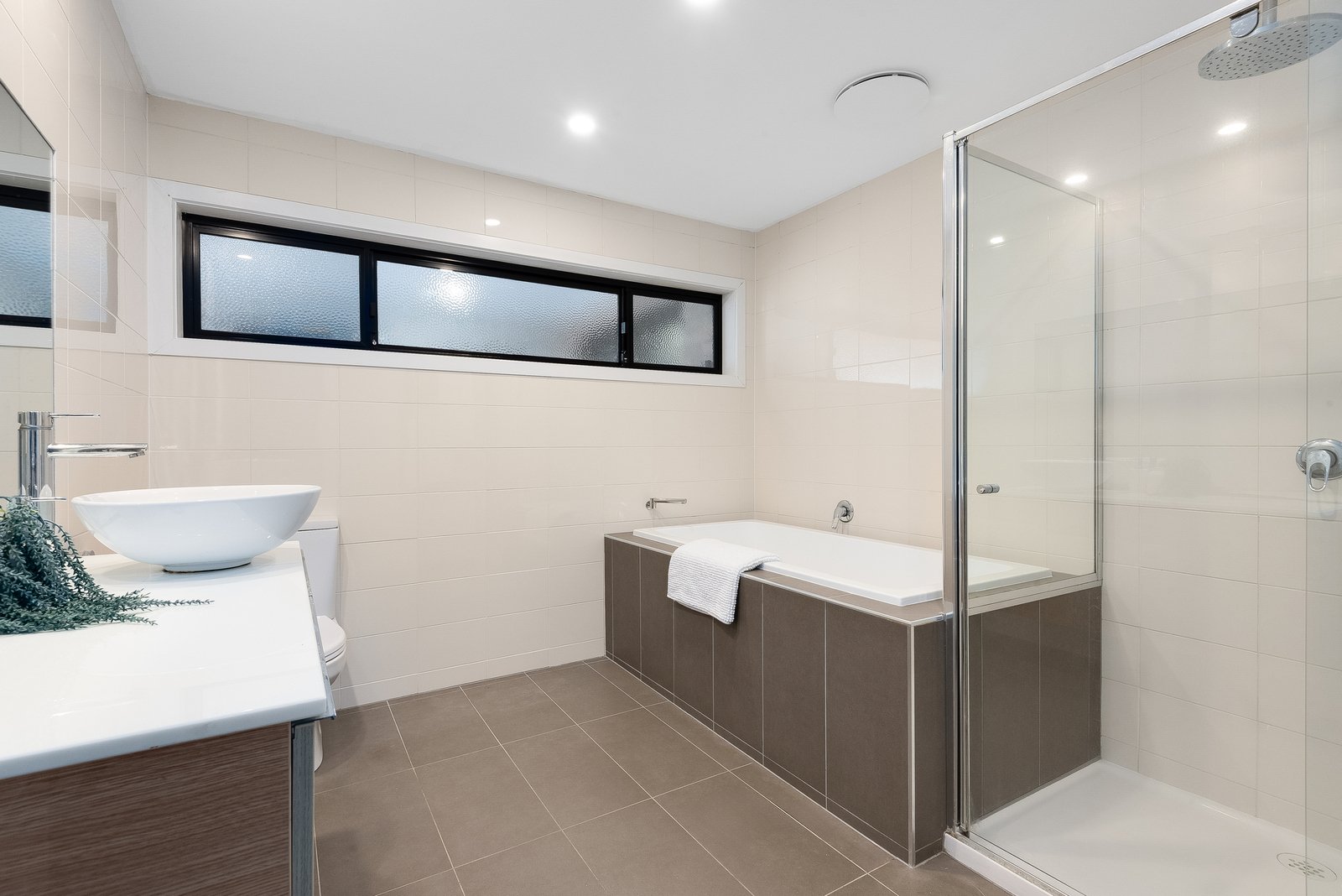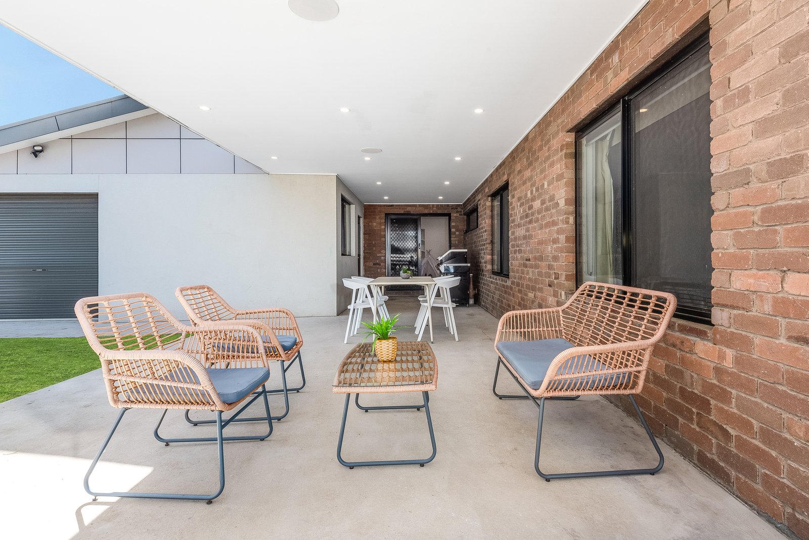 The main bedroom includes walk-in and built-in robes, plus direct outdoor access. Two additional bedrooms feature built-in robes. The spacious family bathroom is finished in floor-to-ceiling tiles, with a luxurious bath, separate shower and modern vanity. A large laundry with extensive workspace and storage, also serves as a mudroom, adding to the fantastic functionality of the home.