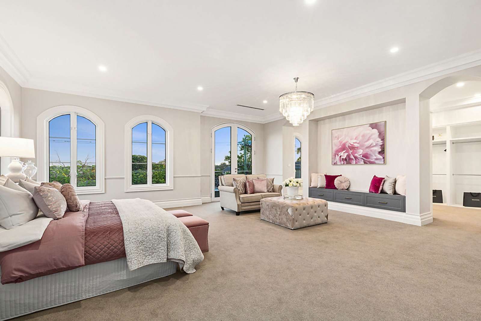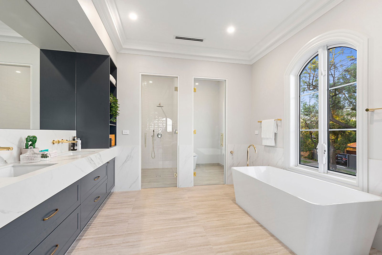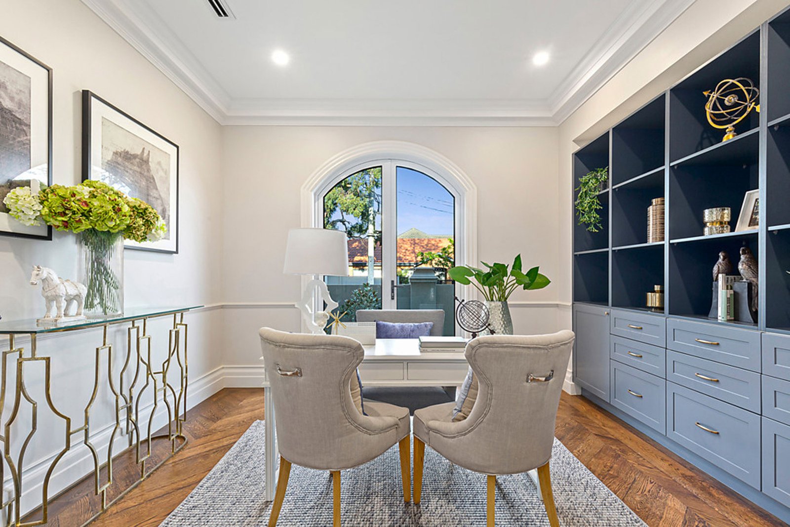 Upstairs, the sense of indulgence continues with a luxurious master suite that boasts a dressing room, spa-inspired ensuite and a private balcony overlooking the streetscape. Three additional bedrooms, each with their own ensuite, ensure comfort and privacy for the whole family, while a central retreat adds flexibility as a quiet escape or an additional living area. Every element has been considered, from bespoke cabinetry to the abundance of natural light filtering through arched windows, creating an atmosphere of understated sophistication.