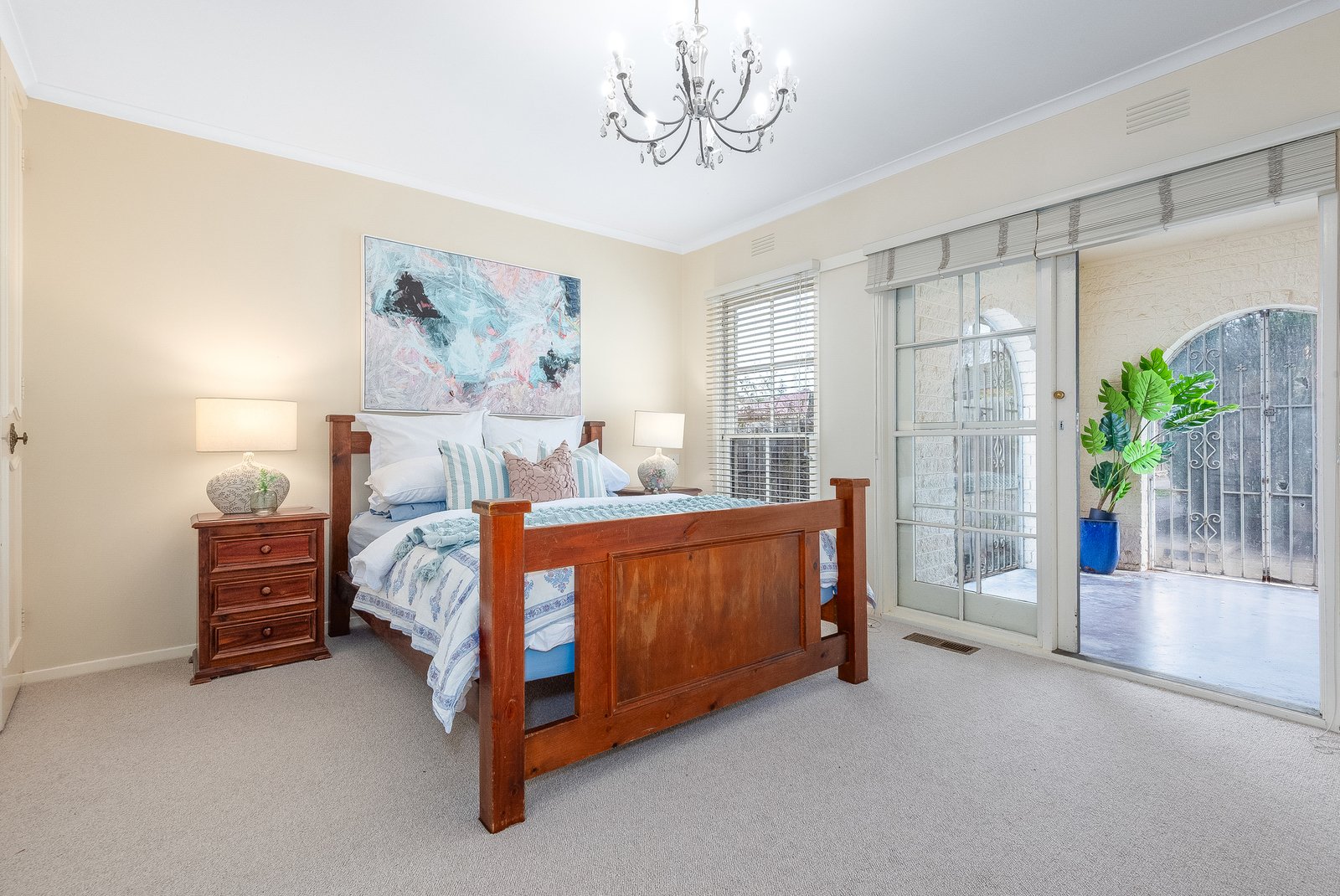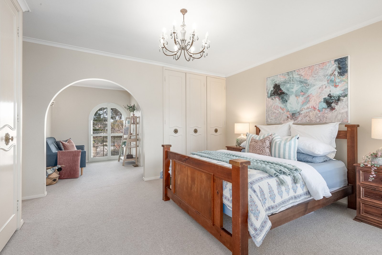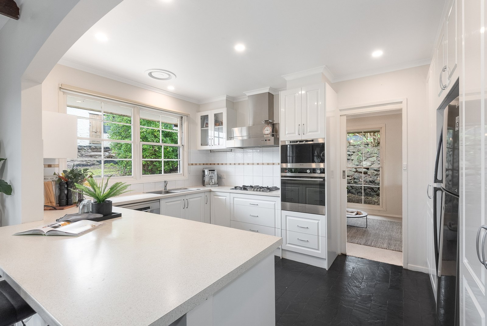 The grand two-storey façade is timeless in appeal, featuring magnificent arched windows and a Mediterranean-inspired veranda. From the entry, a formal lounge introduces the classic theme of the interiors, with a marble fireplace and chandelier lighting. An adjoining sitting area offers a quiet space to retreat with a tranquil garden outlook. At the heart of the home, the well-appointed kitchen features quality appliances including dual Miele and Fisher and Paykel ovens, gas cooktop, dishwasher, and generous storage. The connecting dining space features exposed beams, a brick feature wall, modern pendants, and direct access to the alfresco, completing an impressive indoor-outdoor entertaining zone.