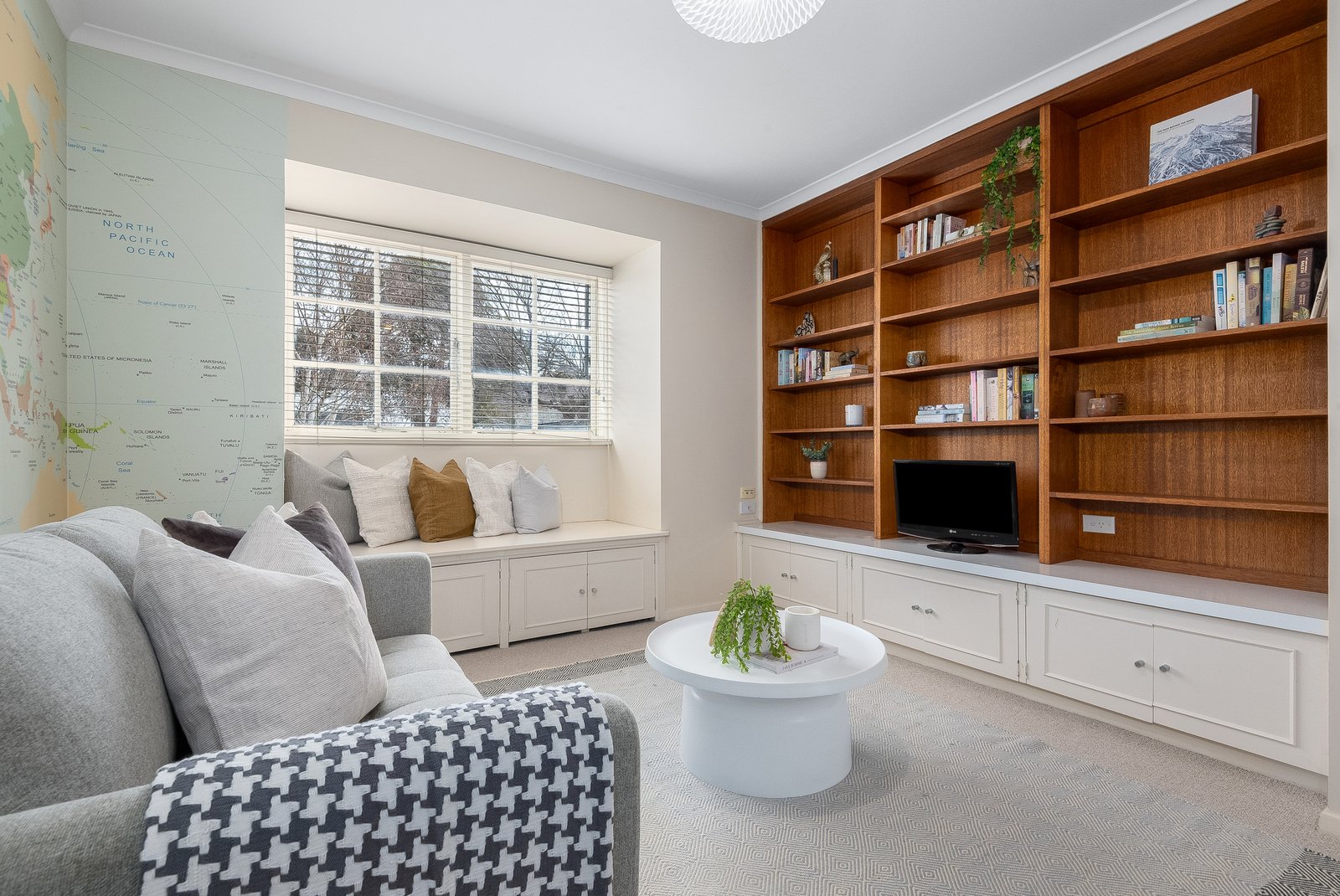 The ground floor main bedroom is privately zoned, with an adjoining retreat, dual built-in robes, a tastefully presented ensuite, and sliding door access to the alfresco. Upstairs, three further bedrooms include built-in robes and desks, serviced by a modern family bathroom and separate wc. A second living area on this level includes a box bay window with built-in seating, custom joinery with storage and bookshelves, offering both style and functionality. A study on the ground floor provides a versatile space for a home office or fifth bedroom.