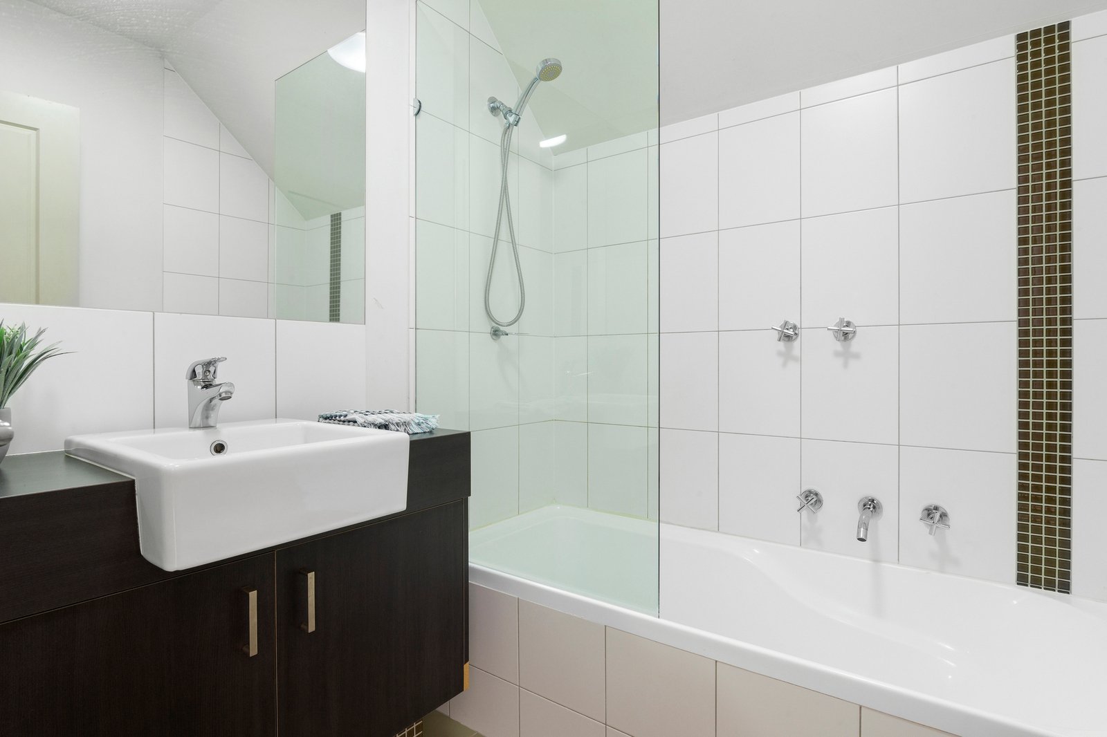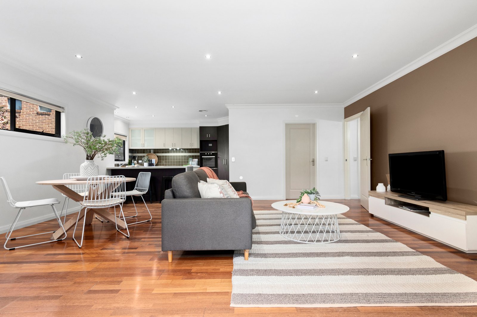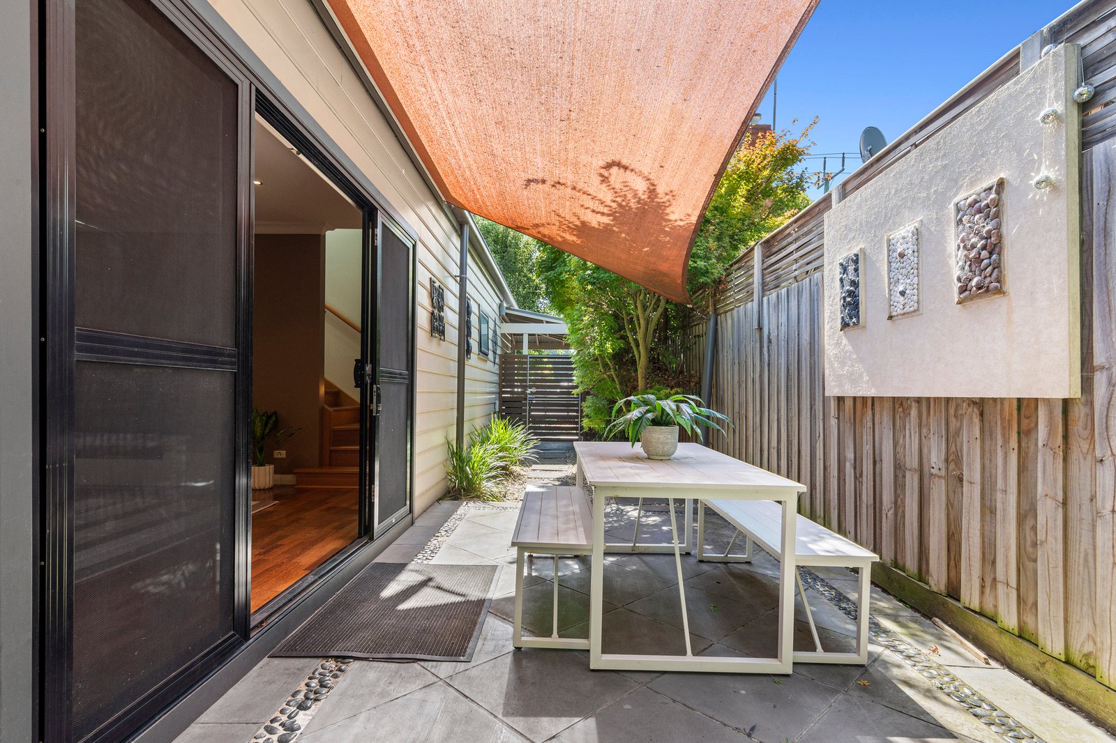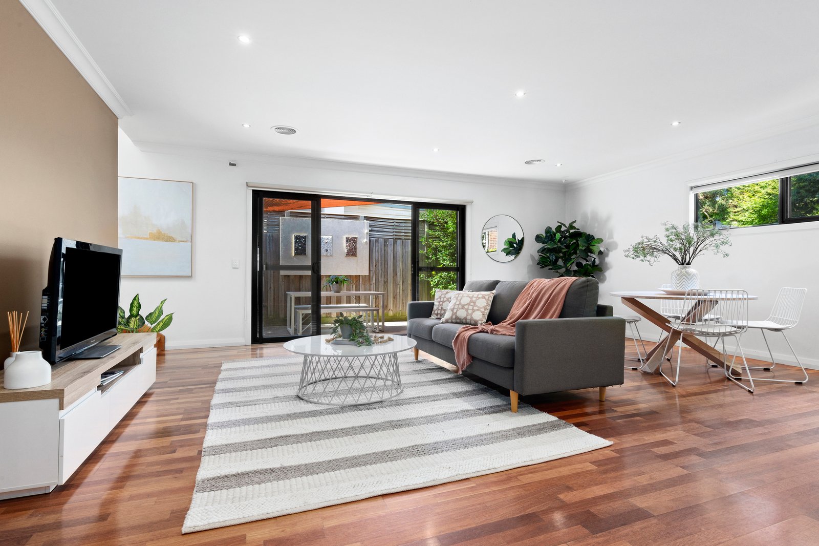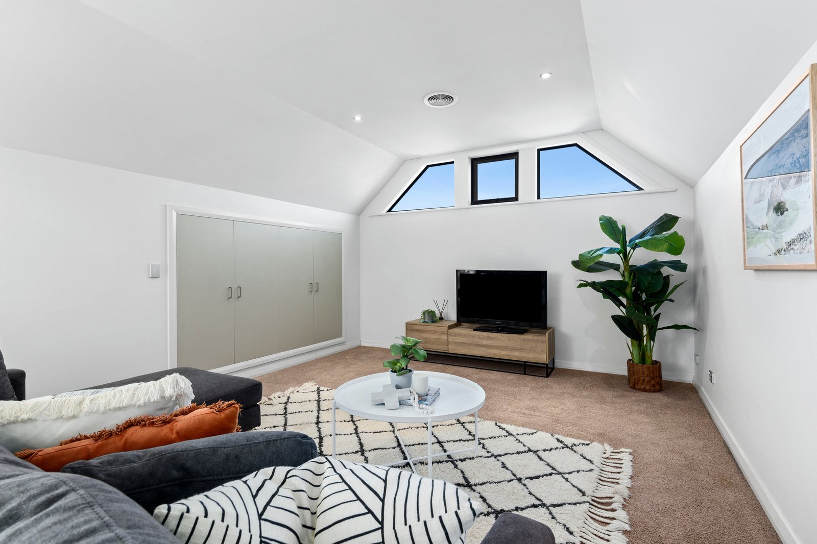 The spacious ground floor master features a beautiful bay window with garden outlook, walk-in robes and stylish ensuite with stunning mosaic feature tiles. A second bedroom upstairs includes built-in robes and is accompanied by a well-appointed second bathroom, with a large second living offering a versatile space that could also be utilised as a third bedroom or guest room with enough space to add a home office or study area including built-in storage. Pitched ceilings throughout the upper level add a sense of light and space within.