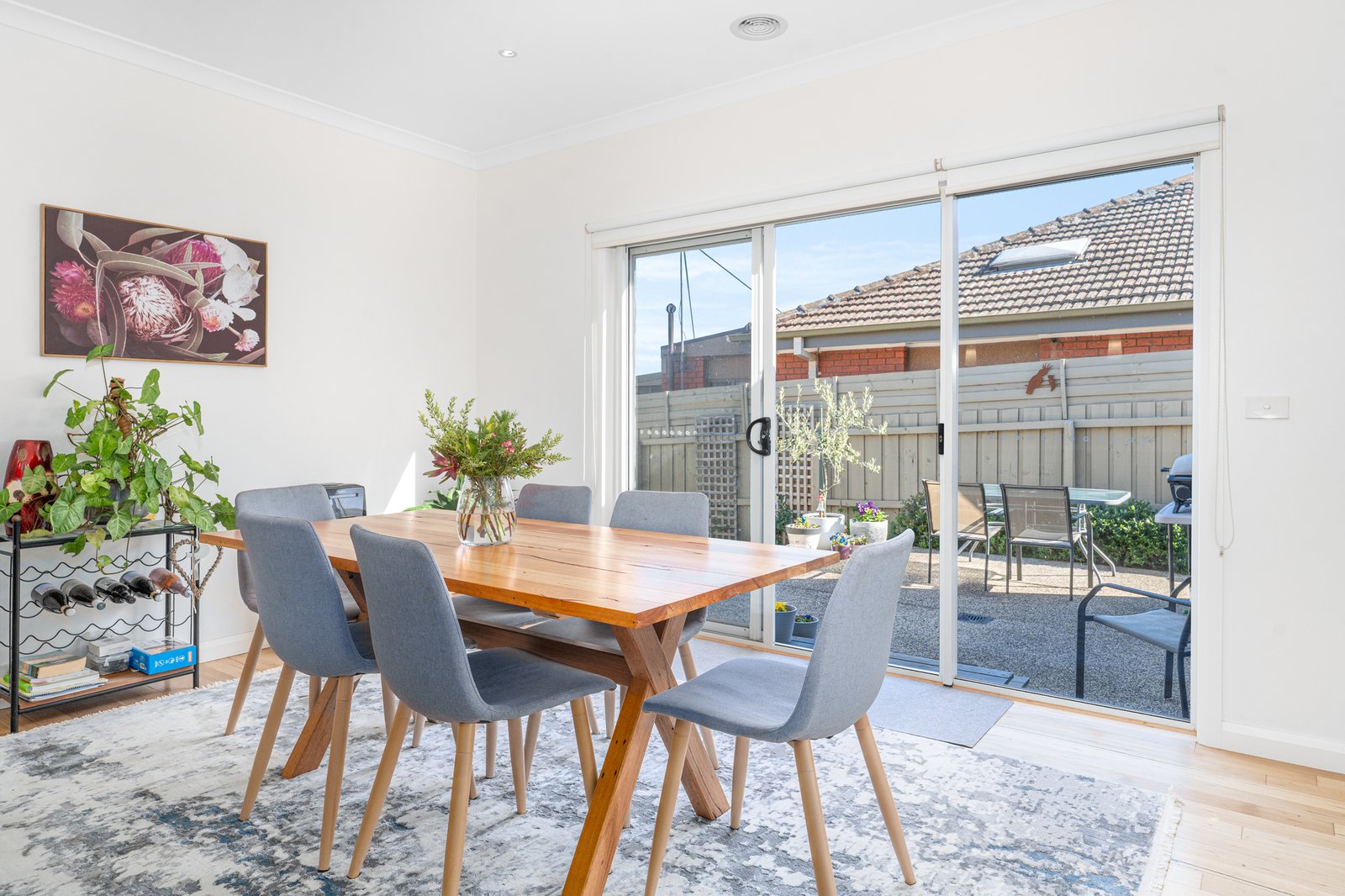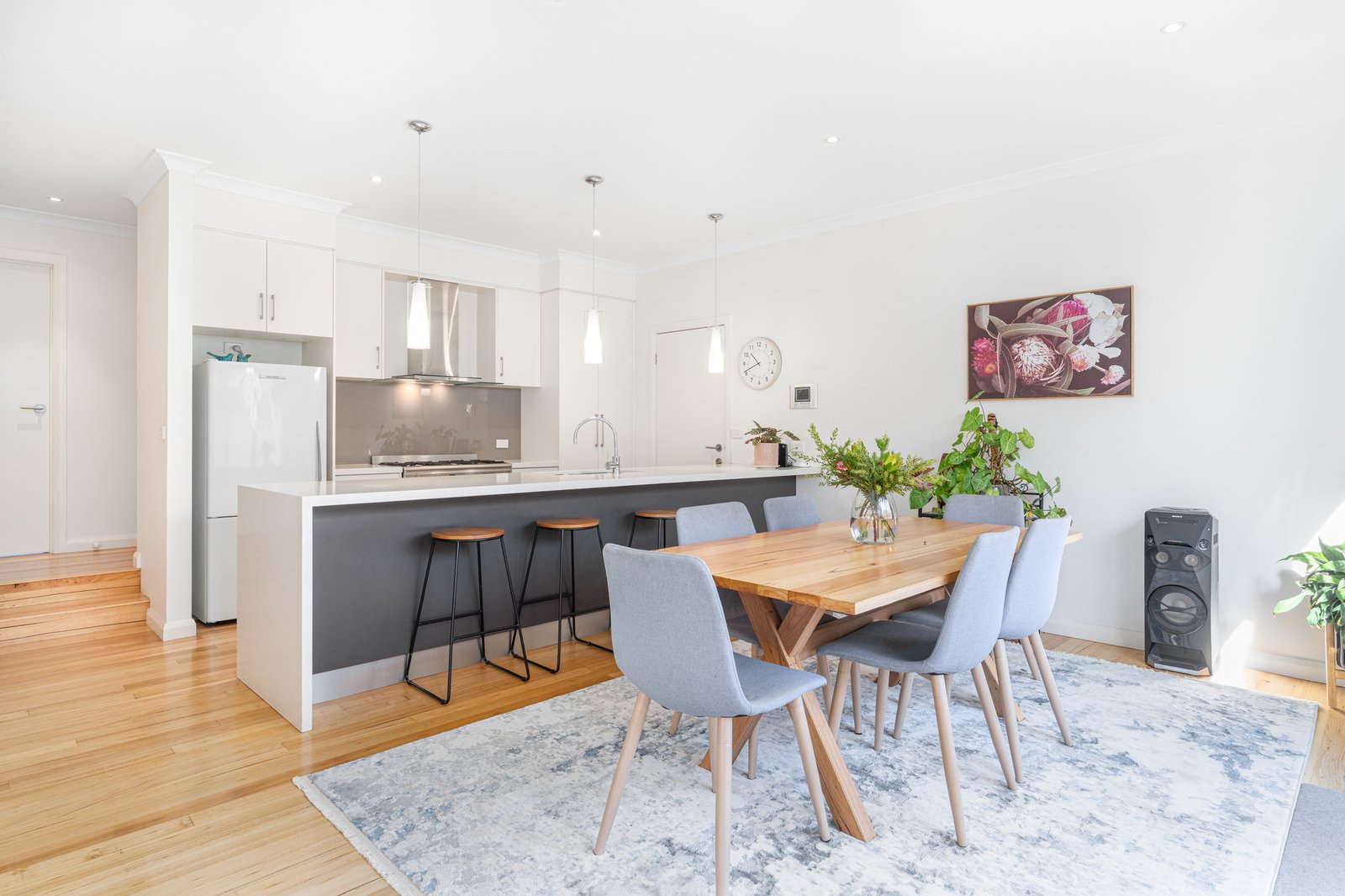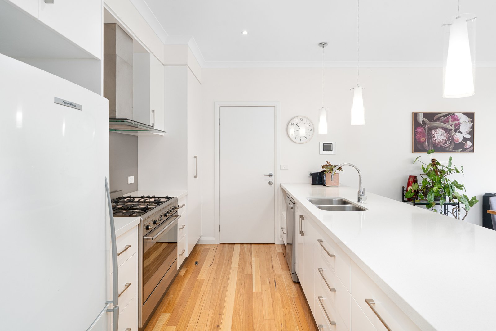 Set behind a picket fence and established cottage gardens, the traditional façade is timeless in style. Entry into an inviting living room reveals light-filled interiors and polished timber floors, with ducted heating plus split system heating and cooling for year-round comfort. The open plan layout flows through to the dining area and kitchen which features waterfall stone benchtops, Smeg 900mm oven and cooktop, dishwasher, generous storage and classic pendant lighting. The dining area opens up to the north facing courtyard, allowing for effortless indoor-outdoor entertaining.
