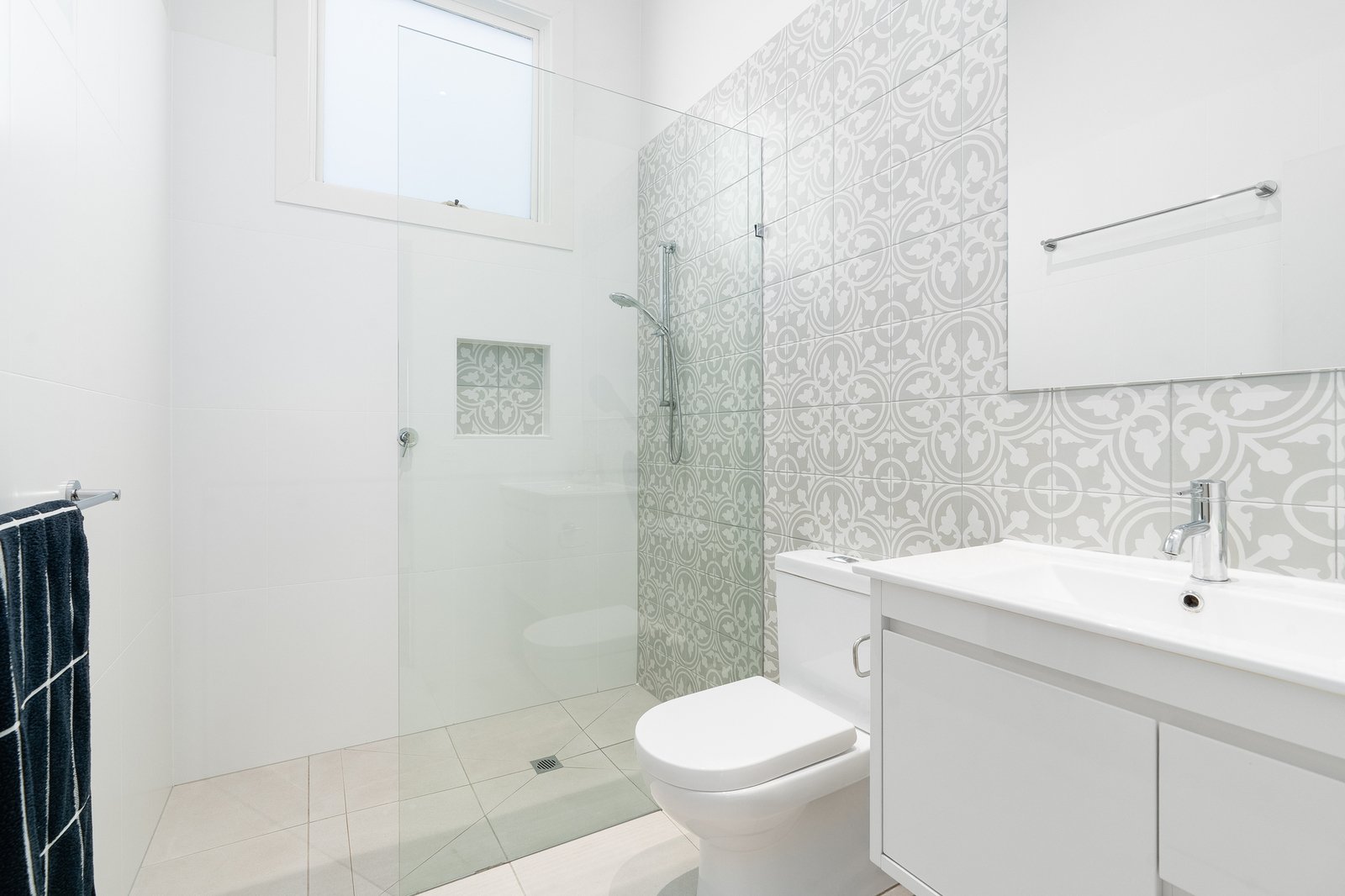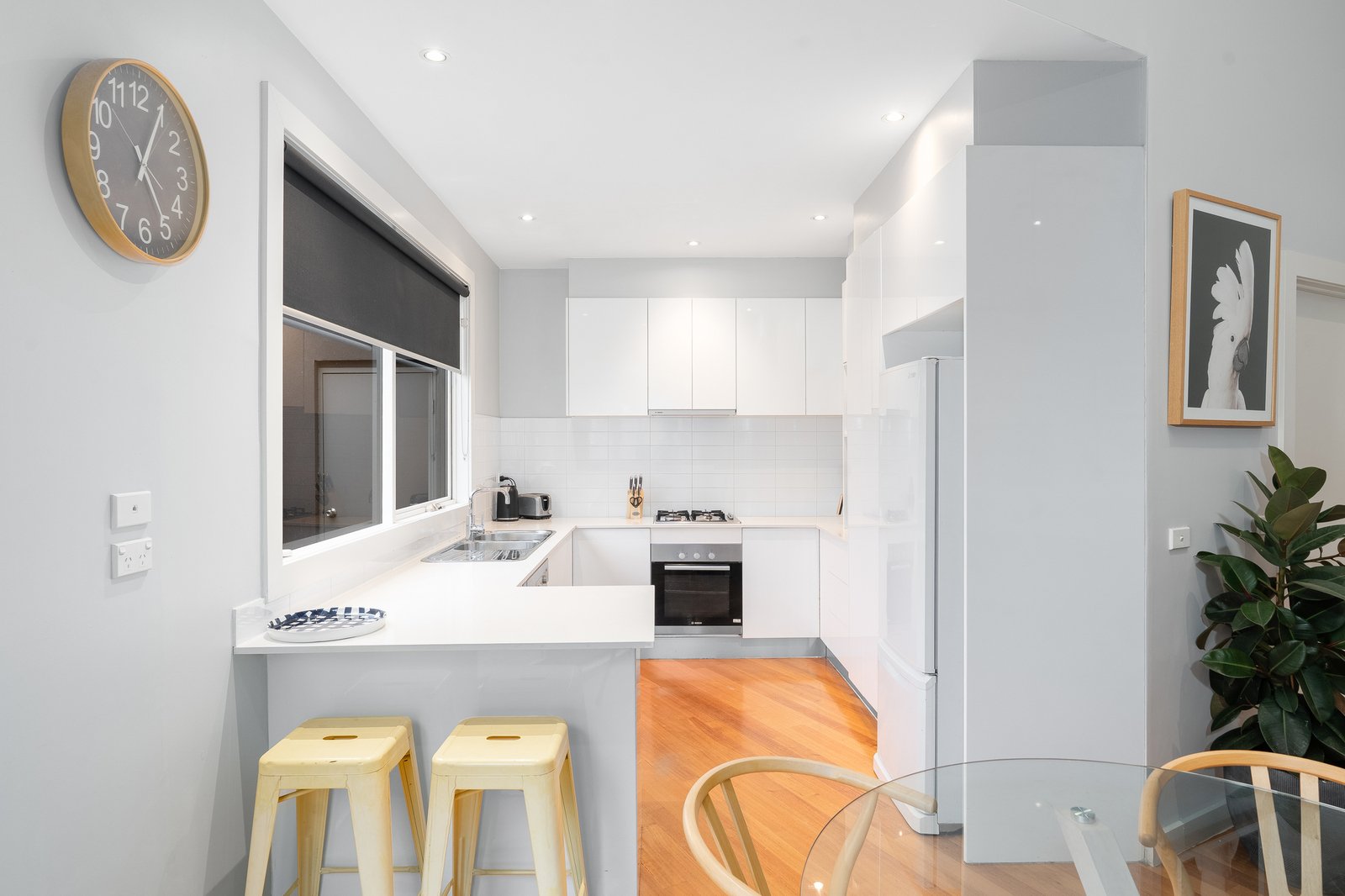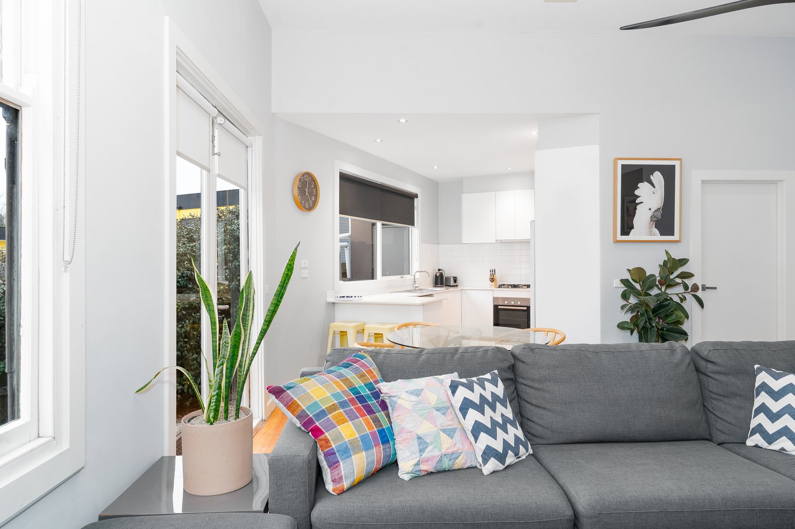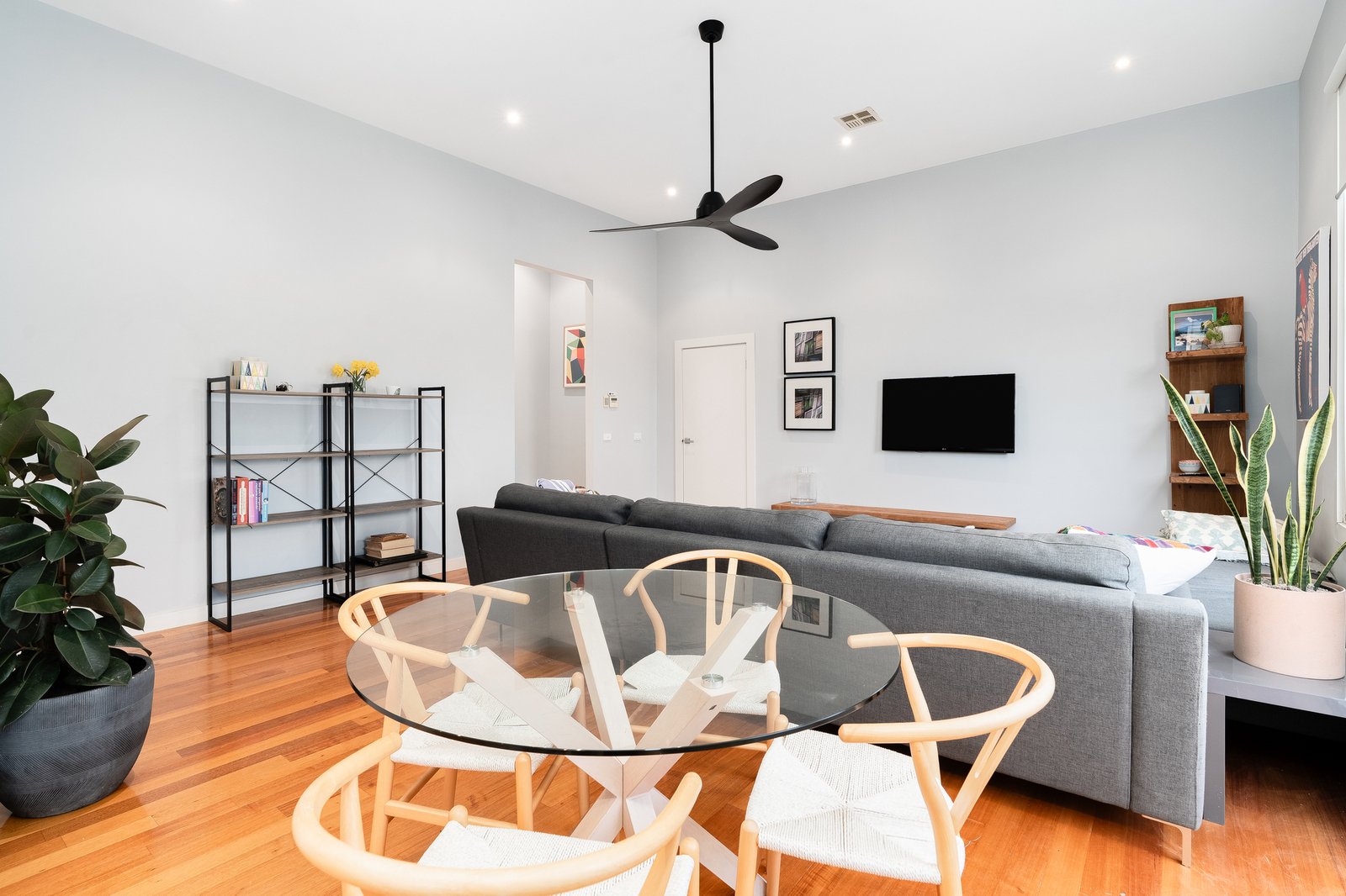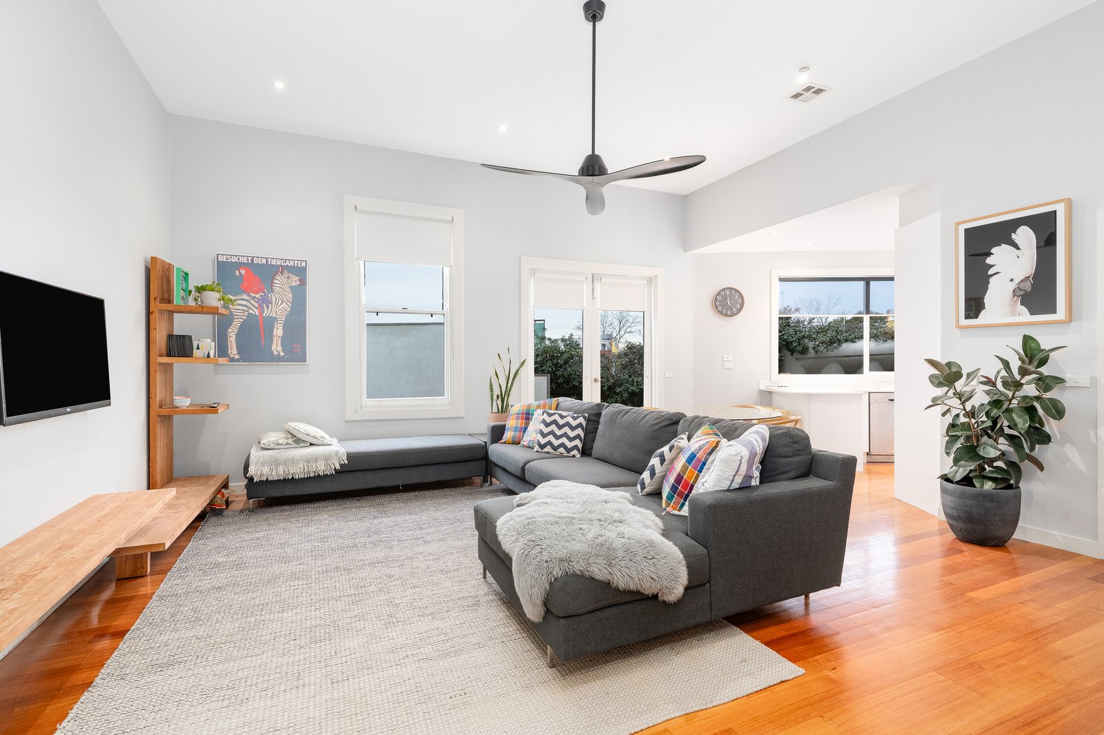 Showcasing soaring ceilings, polished timber floorboards, and an abundance of natural light, you will feel at home from the moment you arrive. Accommodation includes three generous bedrooms, the master complete with a beautifully designed ensuite, while the central family bathroom services the remaining rooms. The spacious open-plan living, dining, and kitchen area seamlessly connects to the outdoor deck through elegant French doors, creating the ideal setting for entertaining or relaxed family living. The well-appointed kitchen features a gas cooktop, electric oven, dishwasher, and ample storage. The home offers year-round comfort with ducted heating and refrigerated cooling throughout.