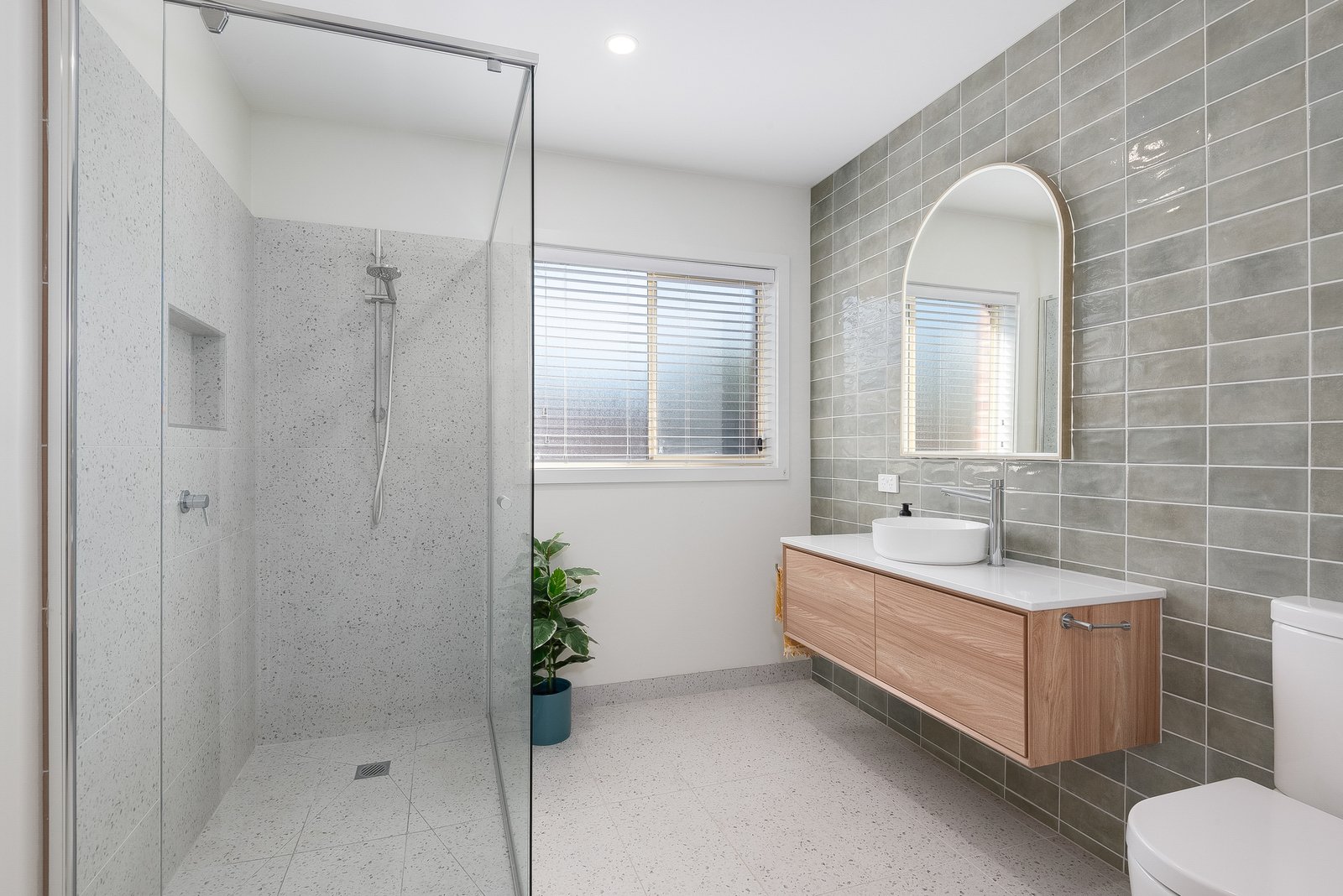 Comprising two bedrooms, both are generous in size, with built-in robes, serviced by a stunning central bathroom with a beautiful floor-to-ceiling feature tile, modern vanity with stone benchtop, heated towel rail and contemporary fittings. A well-appointed laundry completes the highly functional floorplan, and solar panels ensure energy efficient living.