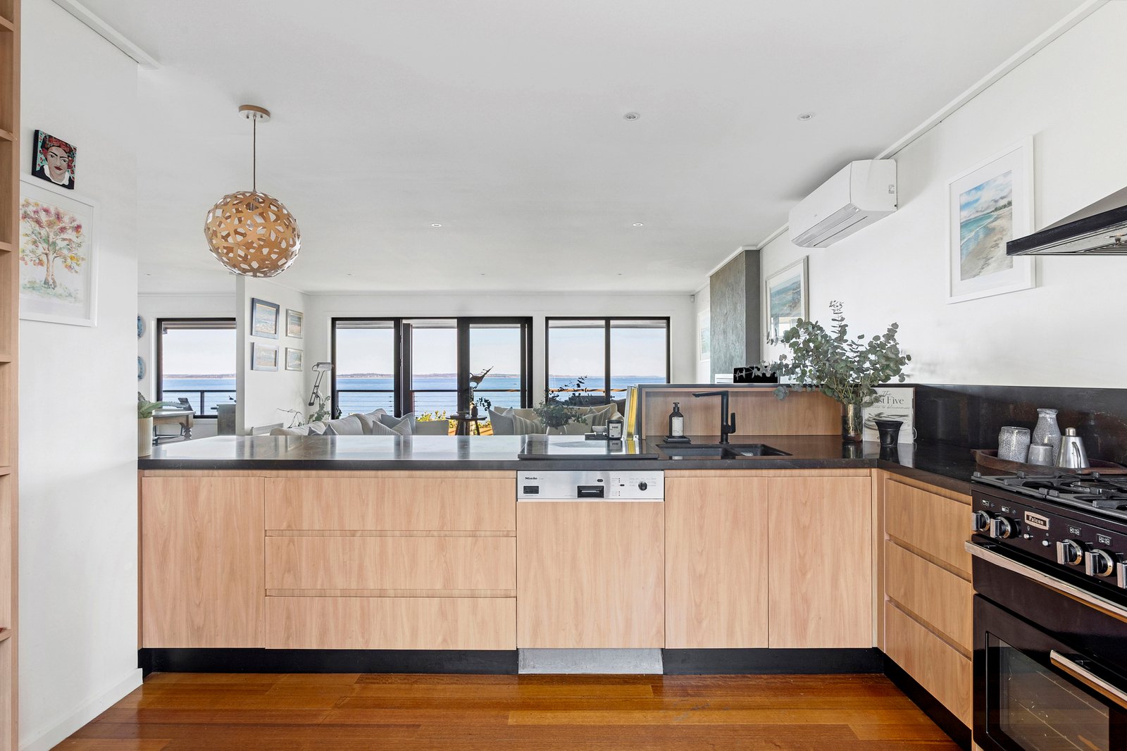 On the entry-level, the open-plan living and dining domain is a showstopper framed by wall-to-wall glazing that draws the eye to spectacular water vistas. A gas fireplace brings warmth and style, while the expansive kitchen complete with a butler's pantry, Falcon stove and integrated Miele dishwasher, embraces poolside outlooks through floor-to-ceiling windows, forming the centrepiece of this waterfront oasis.