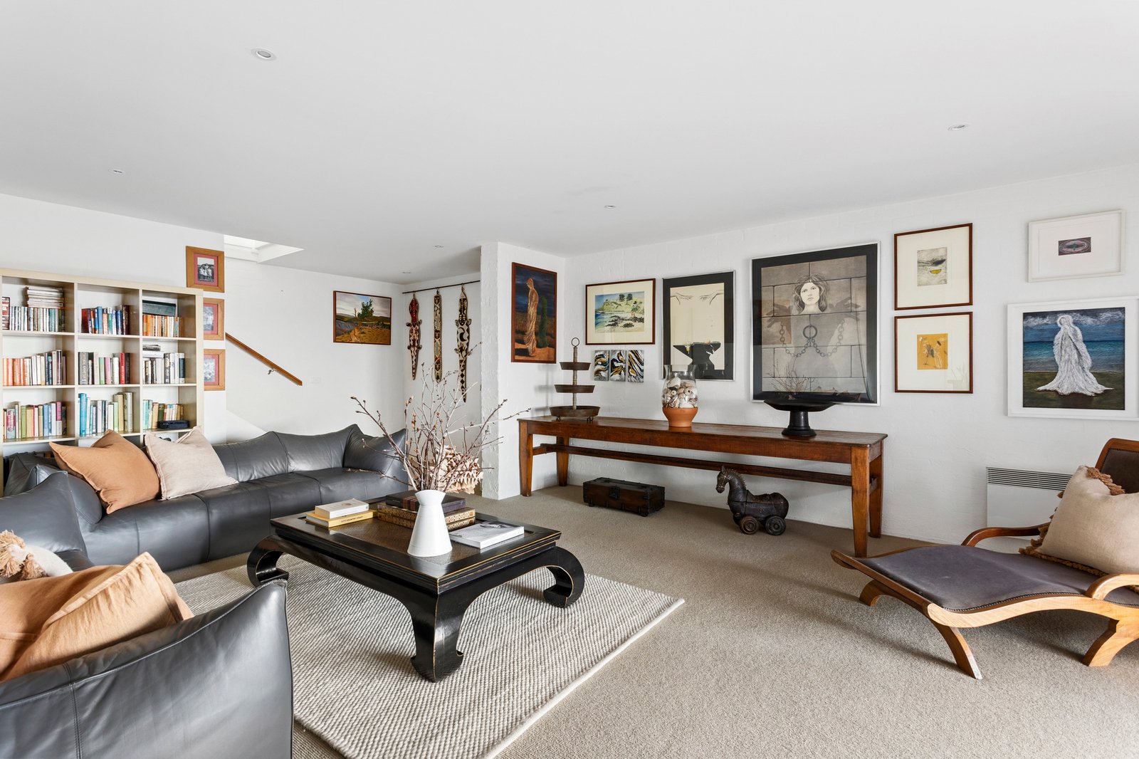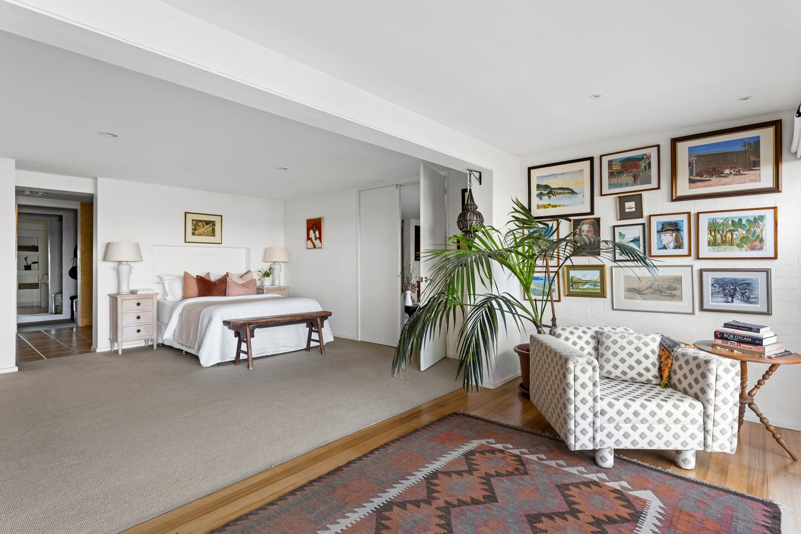 On the ground floor, a serene parent's retreat is accompanied by a private study, studio, and sunroom with a Murphy bed for extended accommodation, offering flexible family spaces or casual beachside entertaining. The generous main bedroom features an expansive ensuite with a bath and walk-in robe, while four additional bedrooms are thoughtfully divided, two on each floor.