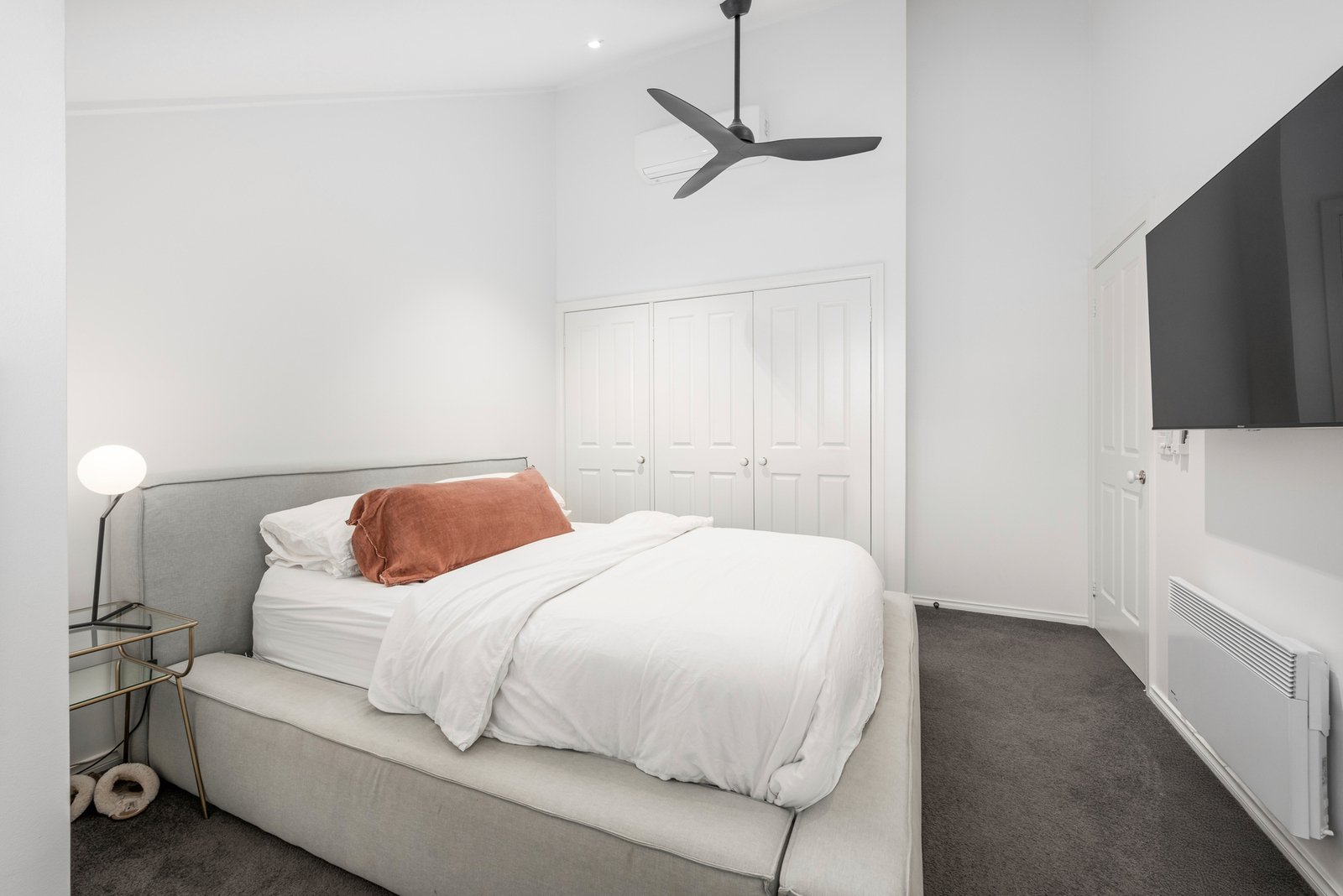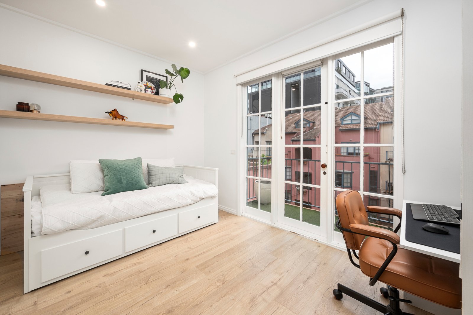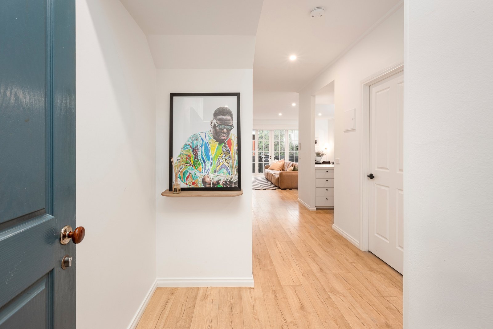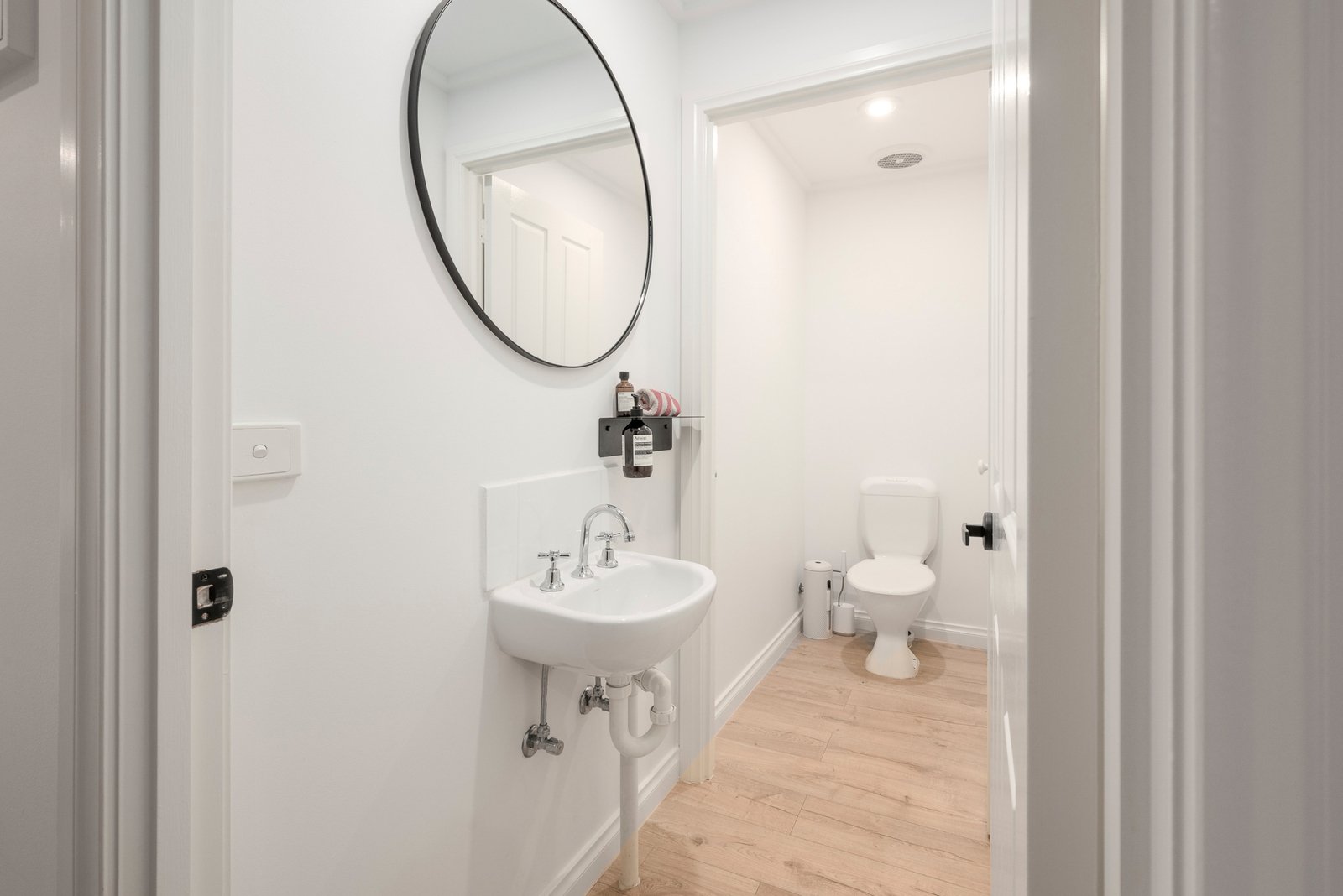 Retreat upstairs to find two bedrooms with built-in robes sharing a family-sized bathroom, while downstairs, a sunlit study—a potential third bedroom—opens onto a small balcony overlooking the piazza, accompanied by a convenient powder room and dedicated laundry. Elegant wide‑board timber floors, intercom security, undercover parking, plus access to a resident’s pool and gym, complement the refined interior.