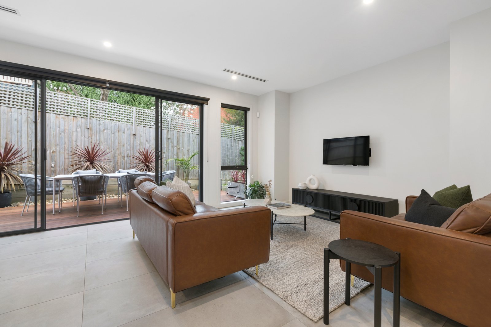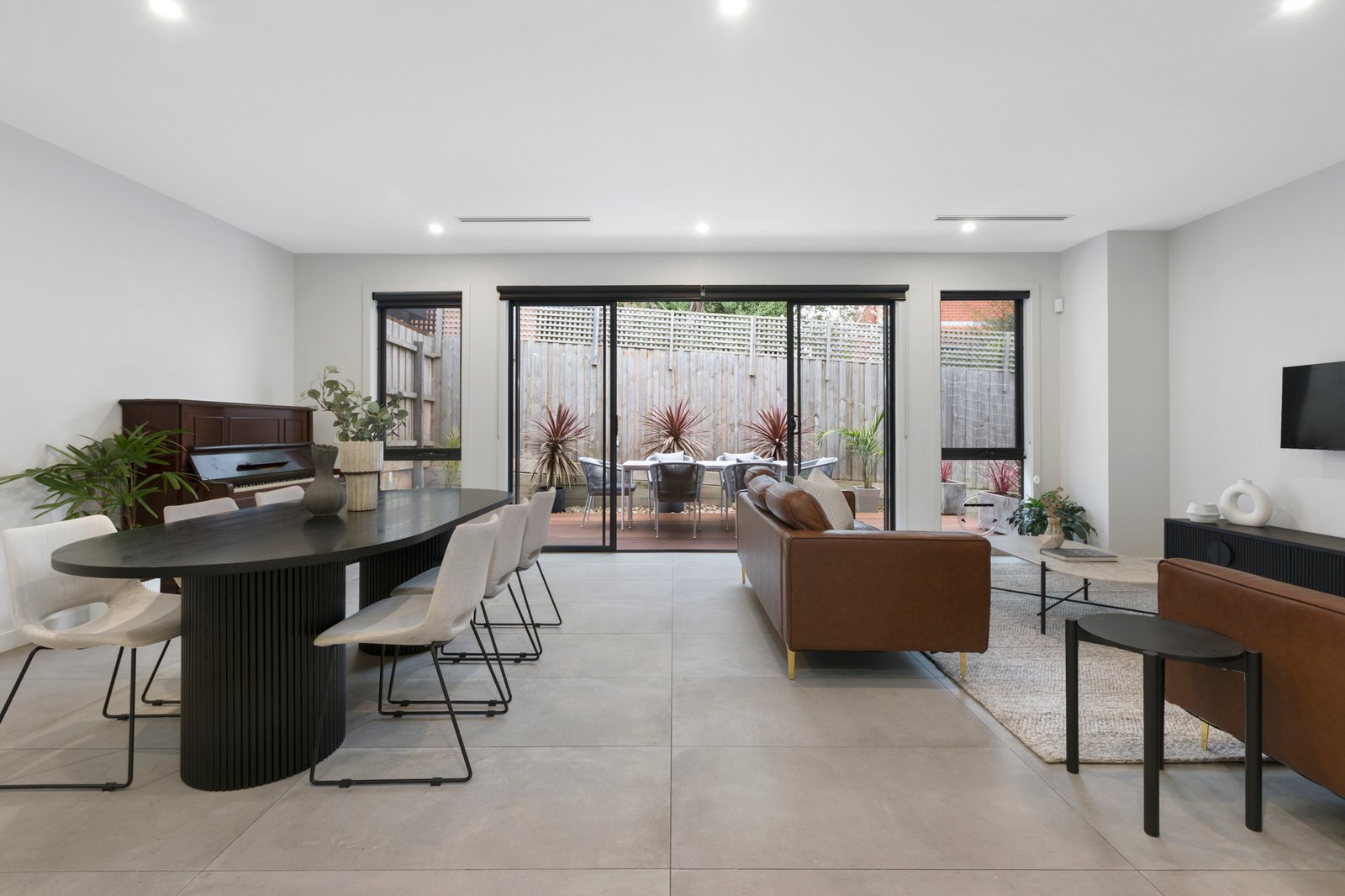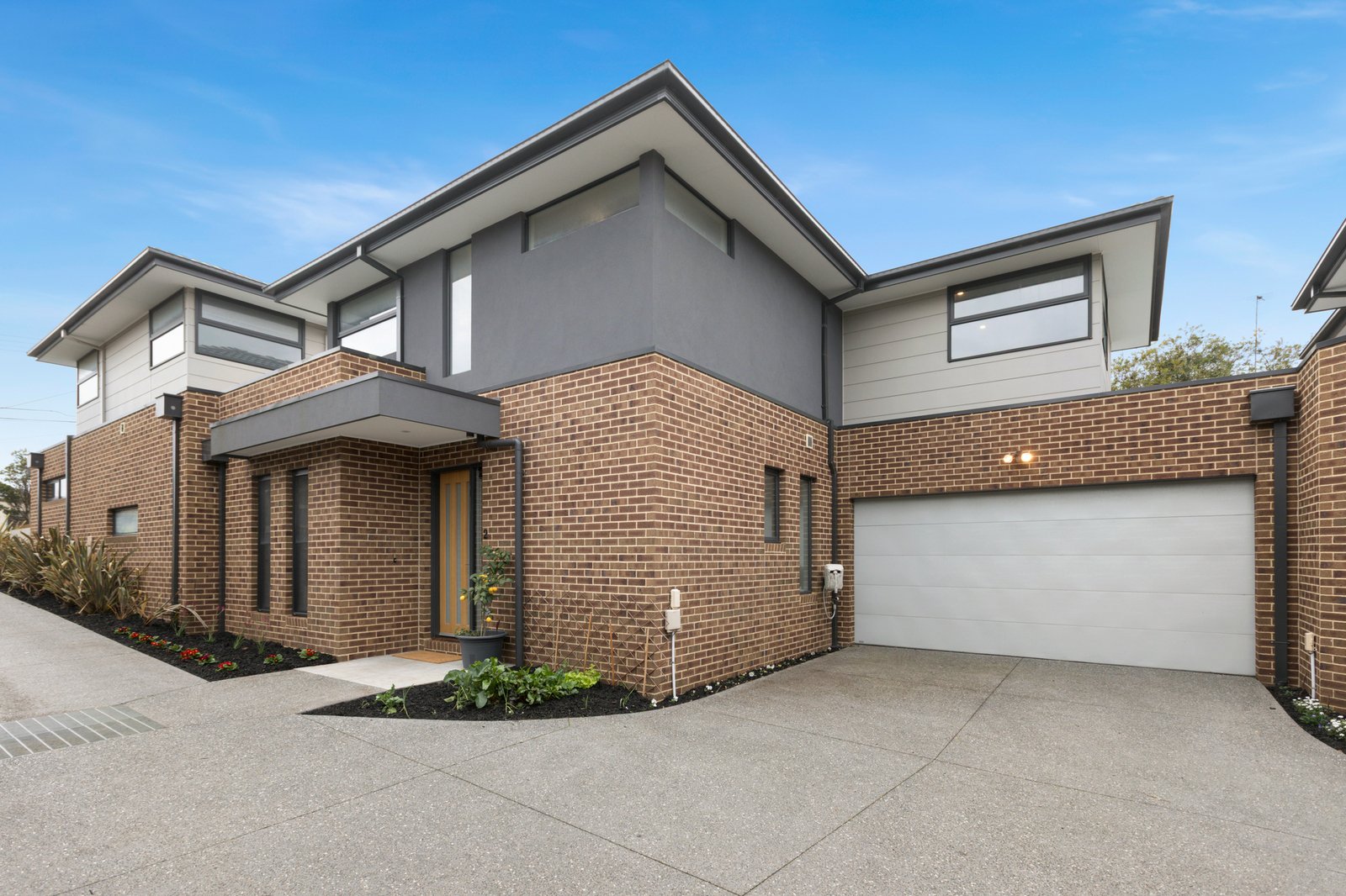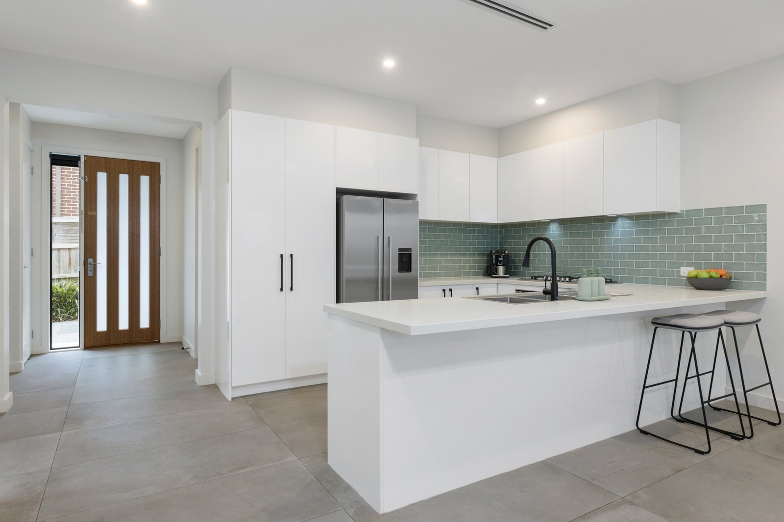 Nestled at the heart of a quiet group of just three, the sophisticated two-storey townhouse opens to stunning interiors enhanced by a raft of quality finishes including chic grey floor tiles, stone surfaces, high ceilings and fashionable matte black fixtures.