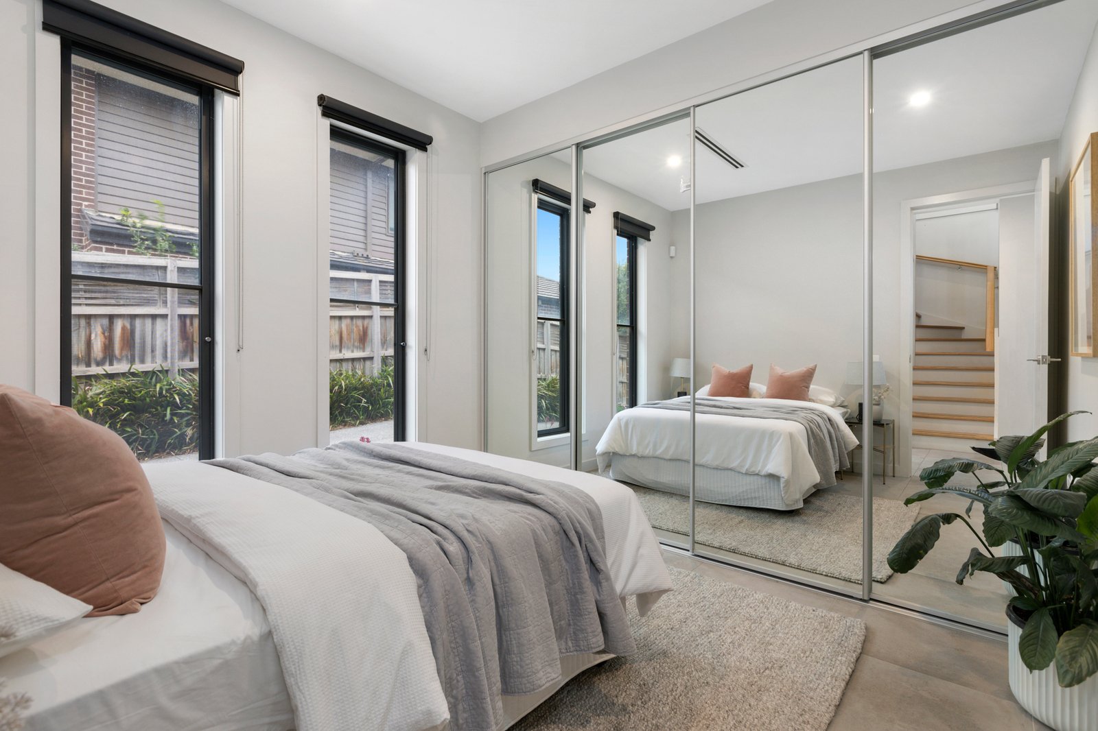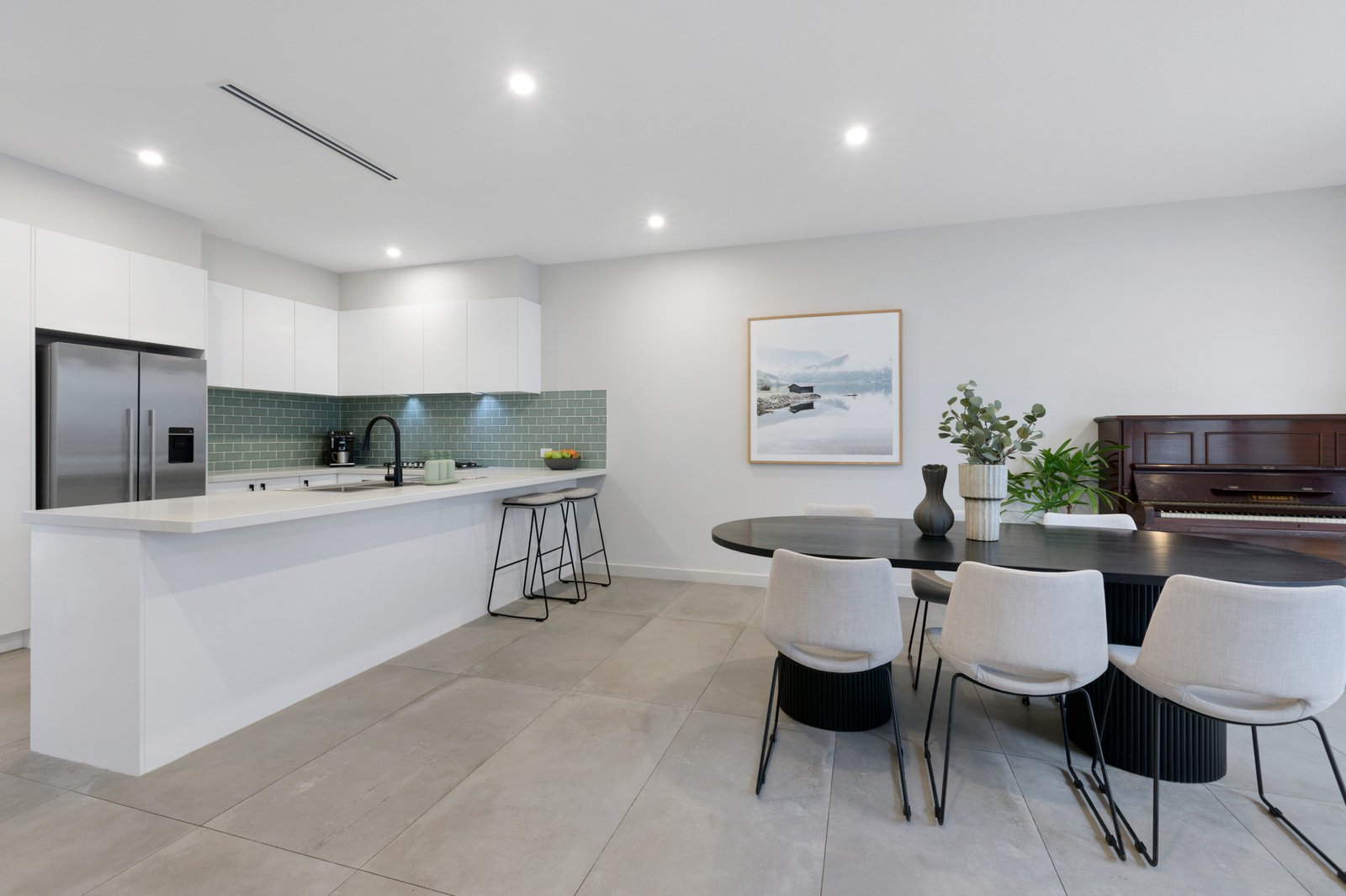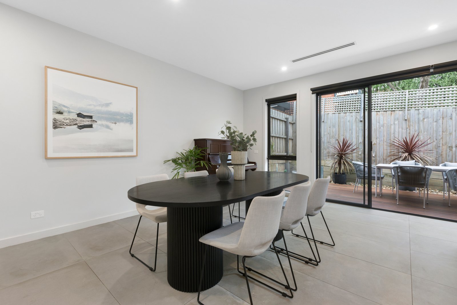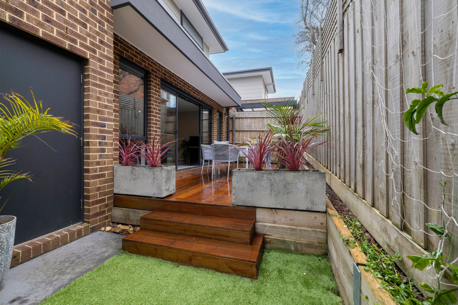 Nestled at the heart of a quiet group of just three, the sophisticated two-storey townhouse opens to stunning interiors enhanced by a raft of quality finishes including chic grey floor tiles, stone surfaces, high ceilings and fashionable matte black fixtures.
