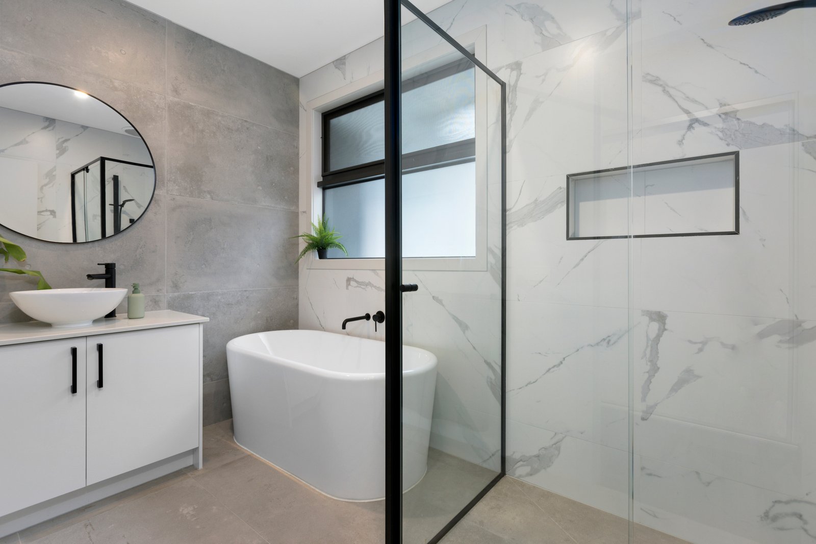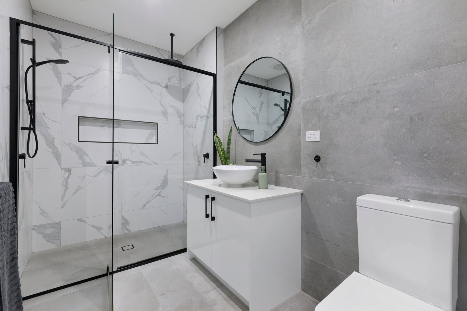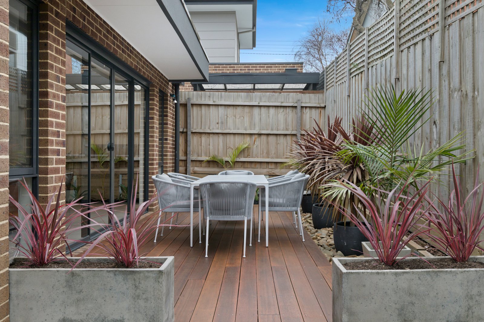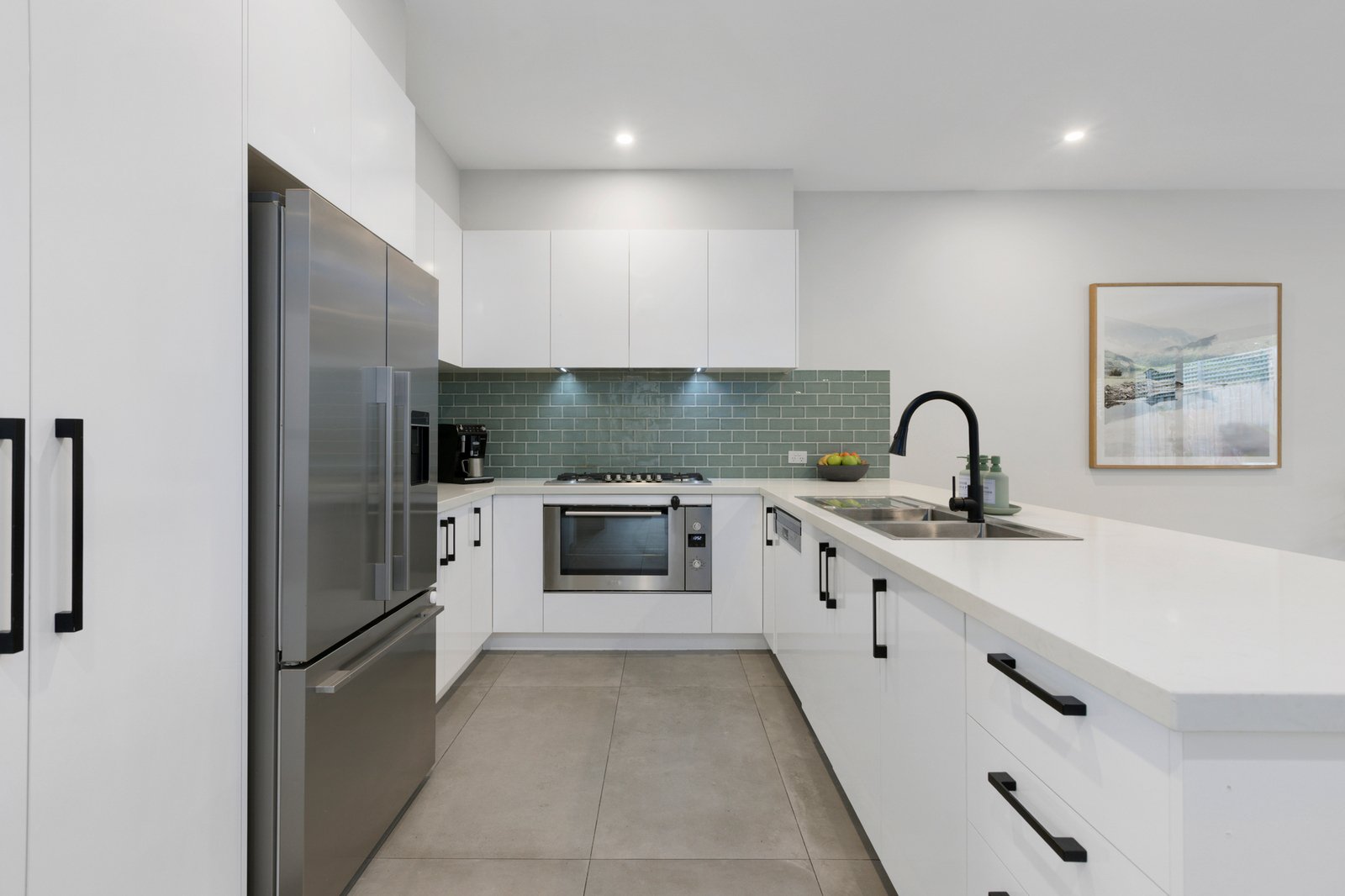 Nestled at the heart of a quiet group of just three, the sophisticated two-storey townhouse opens to stunning interiors enhanced by a raft of quality finishes including chic grey floor tiles, stone surfaces, high ceilings and fashionable matte black fixtures.