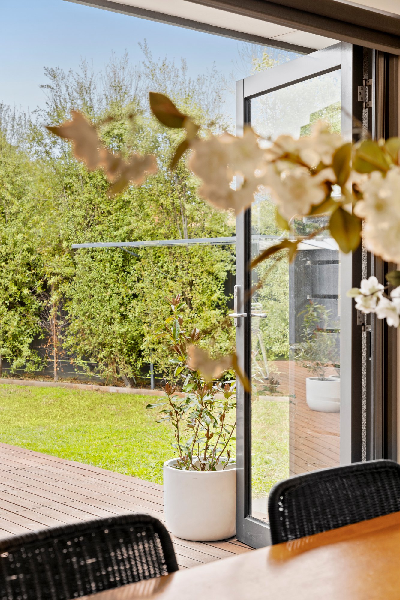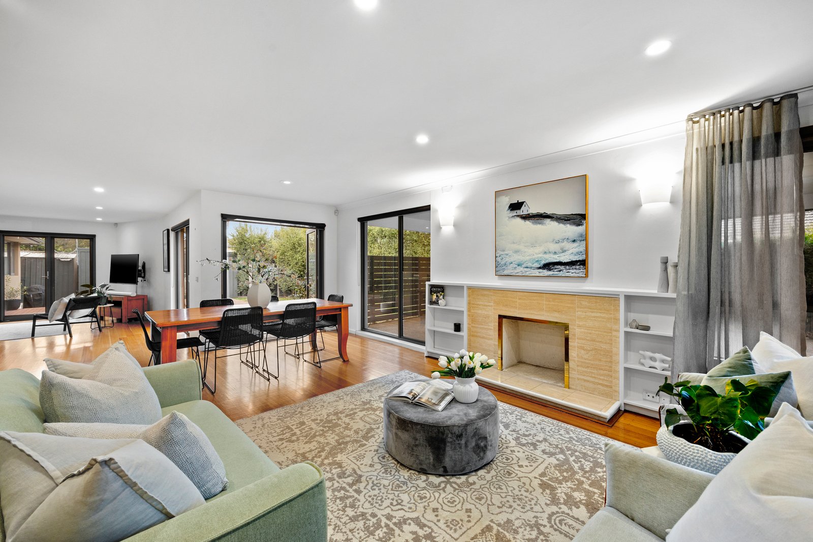 At its heart, an expansive open-plan living and dining zone—enhanced by an open fireplace and bathed in glorious northern light—connects seamlessly through walls of glass to a wraparound alfresco entertaining deck and generous rear garden, offering a tranquil retreat for everyday living and entertaining alike.