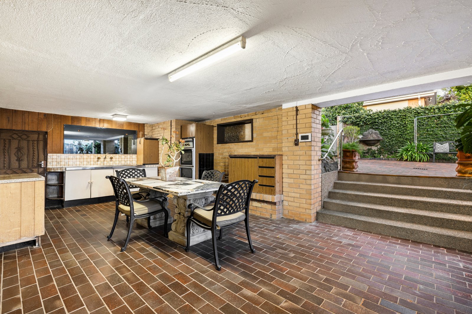 Elevated in a highpoint position beyond a high auto-gated brick-fenceline, this spectacularly solid home showcases the most substantial solid-brick, suspended-slab construction of its time across a view-focused split-level design. Opening with vast separate lounge and dining rooms off a wide terrazzo-tiled hall, the home steps up to an elevated family-room with panoramic treetop views and flows out and down to a sub-floor al fresco entertainment zone with extensive cellaring and poolside BBQ terrace.
