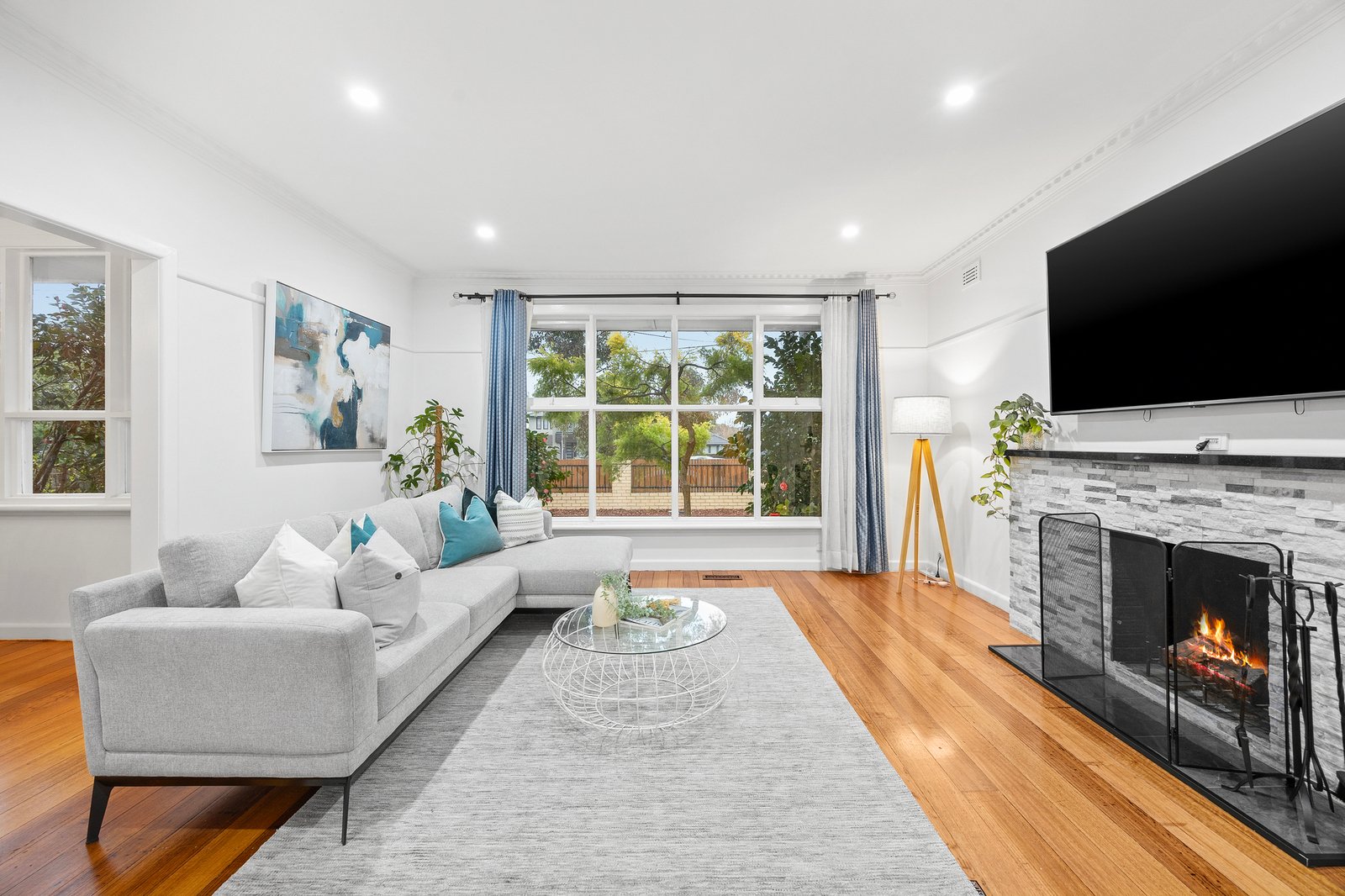 Ready to simply move in and enjoy, the home shines with timeless Shaker-style cabinetry paired with timber benchtops and a gas cooktop, and designer bathrooms featuring concrete-style tiles, including a stunning main with a dual vanity. Quality is evident throughout, from the solid hardwood floors and big built-in robes to the statement stone mantel framing the roaring open fire.