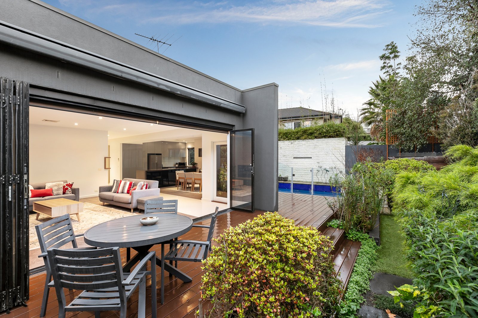 Beyond a striking façade Bayside's 'Most Creative Design' winner unfolds like the pages of an interiors magazine. With superb custom design, perfect Feng Shui and family zoning, this home has been transformed into a brilliant entertainer. Showcasing a spectacular living domain (gas open fireplace) extending out to an al fresco haven with bi-fold doors, 3 automatic awnings, exotic gardens and a swim-spa.
