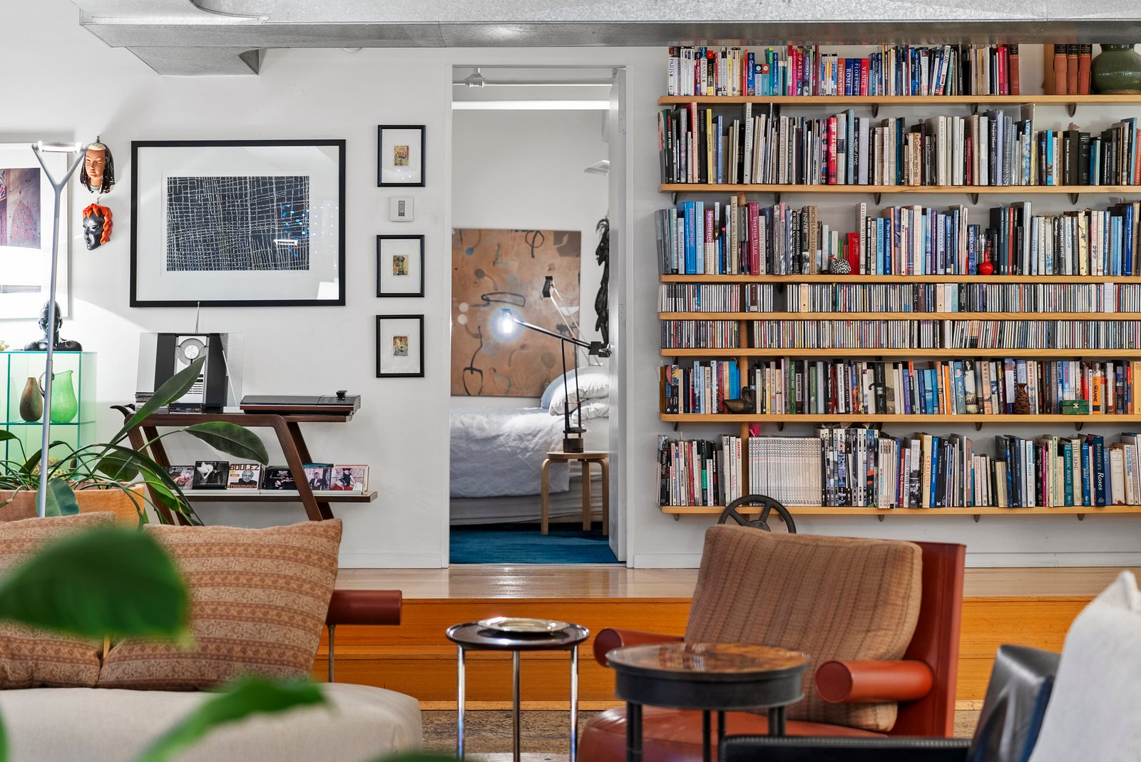 A raised study and library, with the possibility of transforming it into a 3rd bedroom, is adorned with custom bookshelves and set on warm timber floors, offering a quiet sanctuary for homework days.