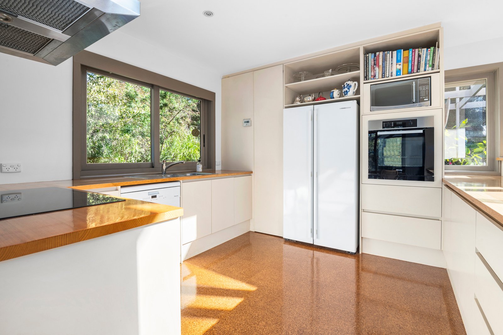 Expansive glazing crowns the main dining and living areas capturing northern light, while hydronic heating and a wood burner deliver radiant warmth, (fuelled by wood sourced directly from the property). The adjoining kitchen appointed with a Miele oven and dishwasher maintains a visual connection to the outdoors. External blinds, a grapevine covered pergola and a split system cool the home in summer.