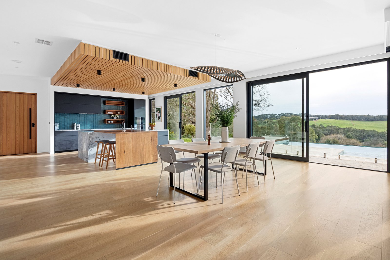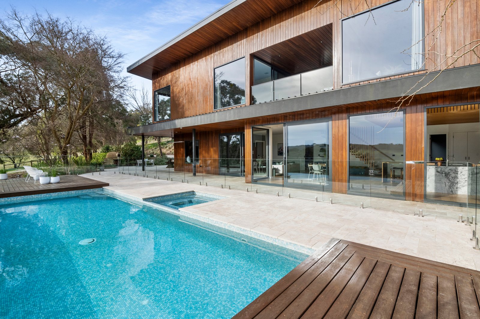 Striking marble benchtops, a filtered water system and dual V-Zug ovens and stovetop bring both drama and precision to the high-impact kitchen, including Blum soft-close drawers and cupboards and butler’s pantry, crowned by a timber-battened ceiling. Adjoining spaces, including the living/dining domain and home theatre, are drawn together by the ambience of a dual-sided gas fireplace, while walls of operable glass promote a seamless indoor–outdoor connection to the infinity pool, spa, in-ground trampoline and a French-paved travertine courtyard with pizza oven, offering a resort-style playground for all ages.