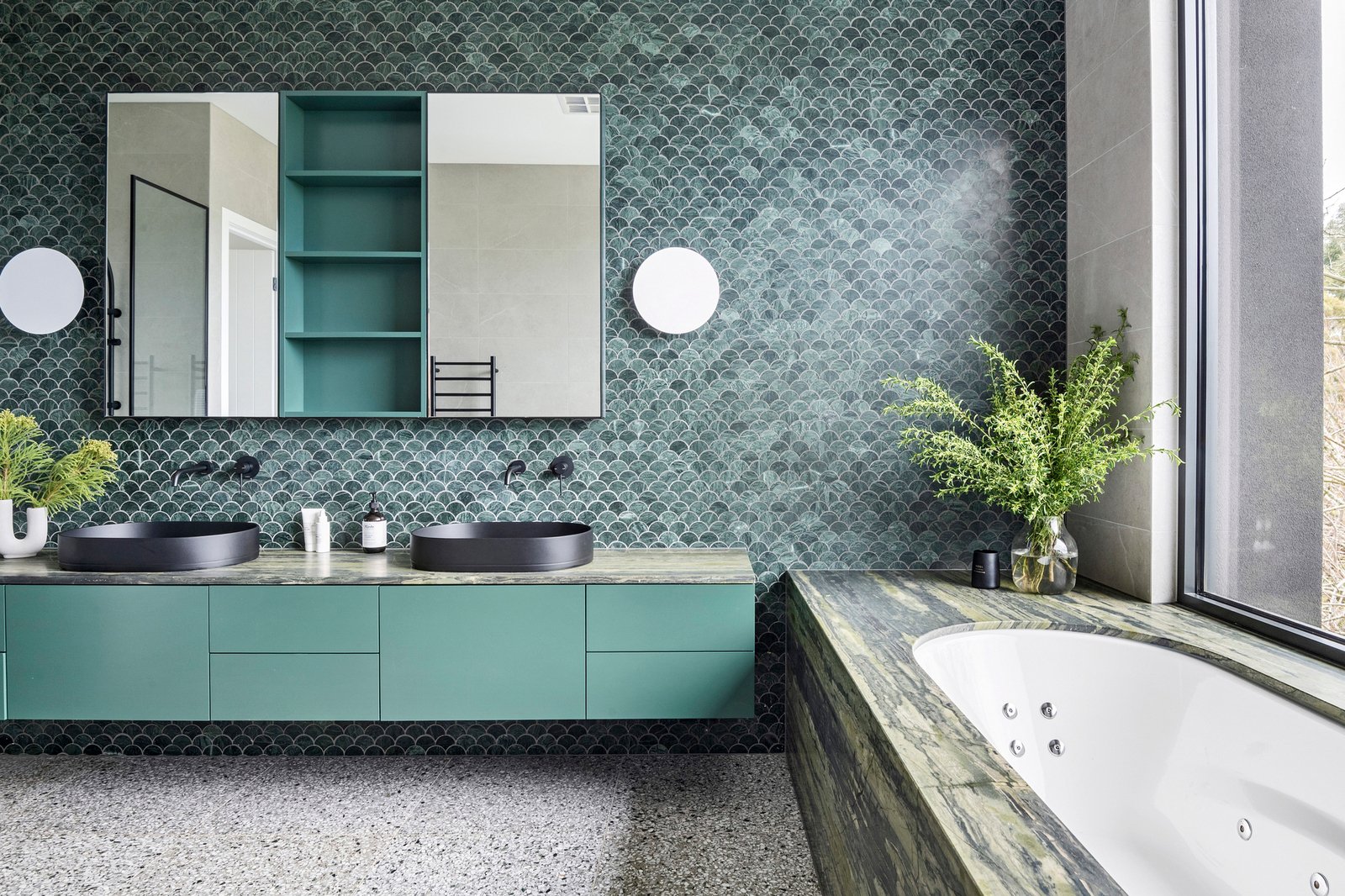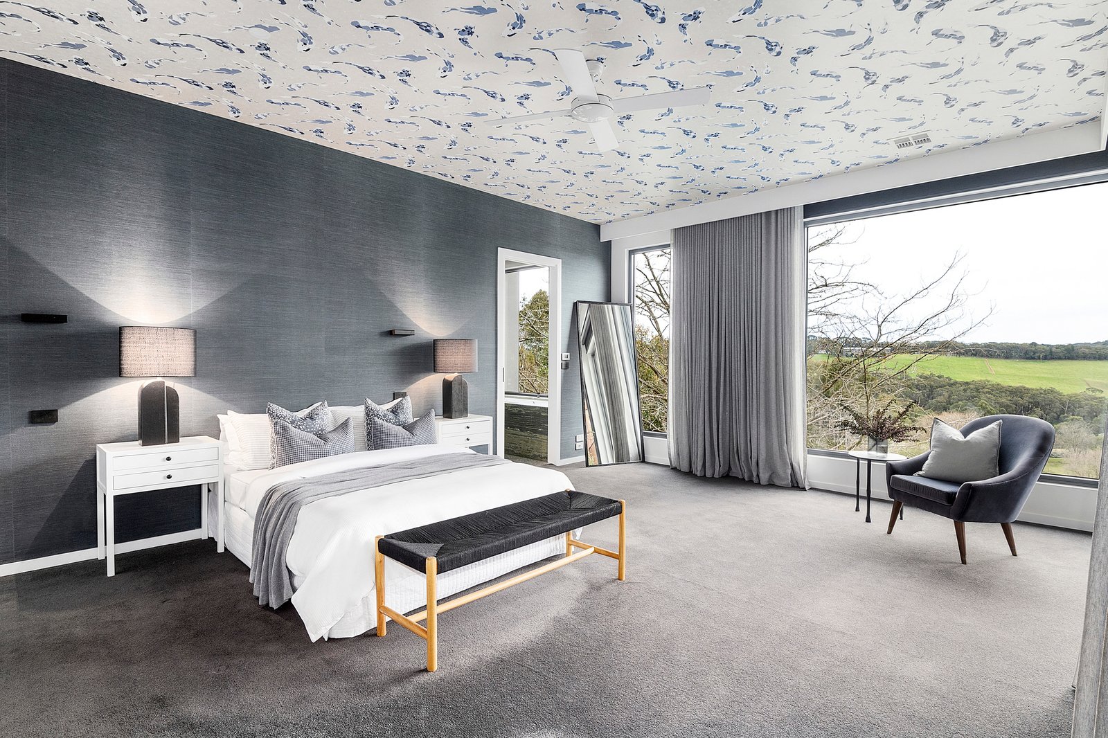 Grand in proportion, the primary suite claims its own private wing on the upper level, complete with a walk-in dressing room and a sumptuous ensuite. An artistic composition of sculptural green tiles defines the ensuite, where a double vanity and marble-wrapped spa bath enjoy outlooks of the property via a picture window. There is balcony access to all three upstairs bedrooms, with two further bedrooms downstairs and bathrooms thoughtfully arranged across both levels. A separate studio/6th bedroom with ensuite and living area enhances the accommodation, presenting as an independent retreat with private entry.