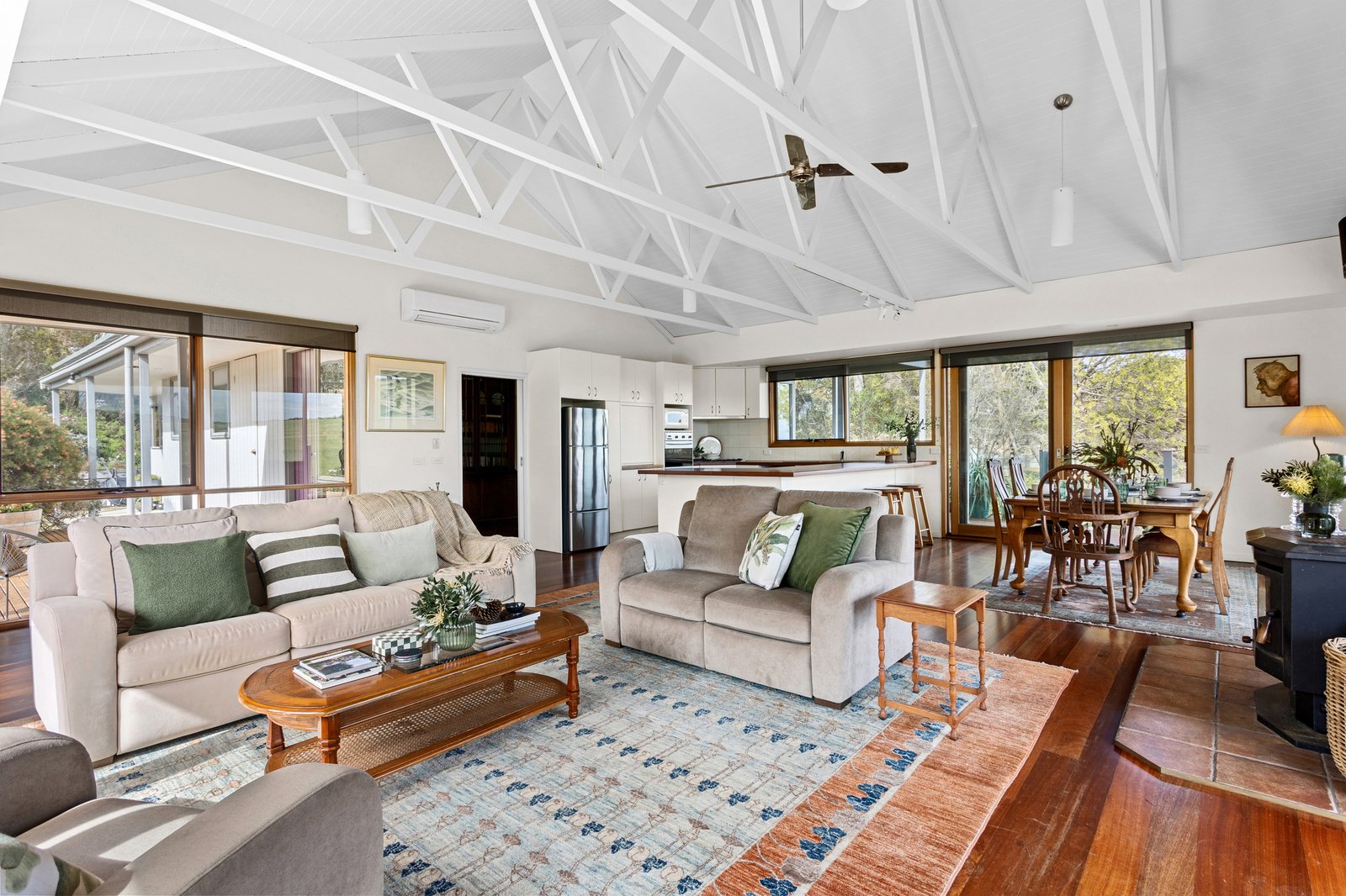 Family life is centred around the main living domain, where reclaimed timber flooring and benchtop set a natural tone for the kitchen while a wood burner brings warmth to the open plan, all beneath soaring ceilings with exposed timber trusses shaping proportions that never feel crowded. A series of five sliding doors open to the wrap-around deck, framing breathtaking scenes and setting the stage for entertaining, admiring the native bird life or watching incredible sunsets over rolling farmland.