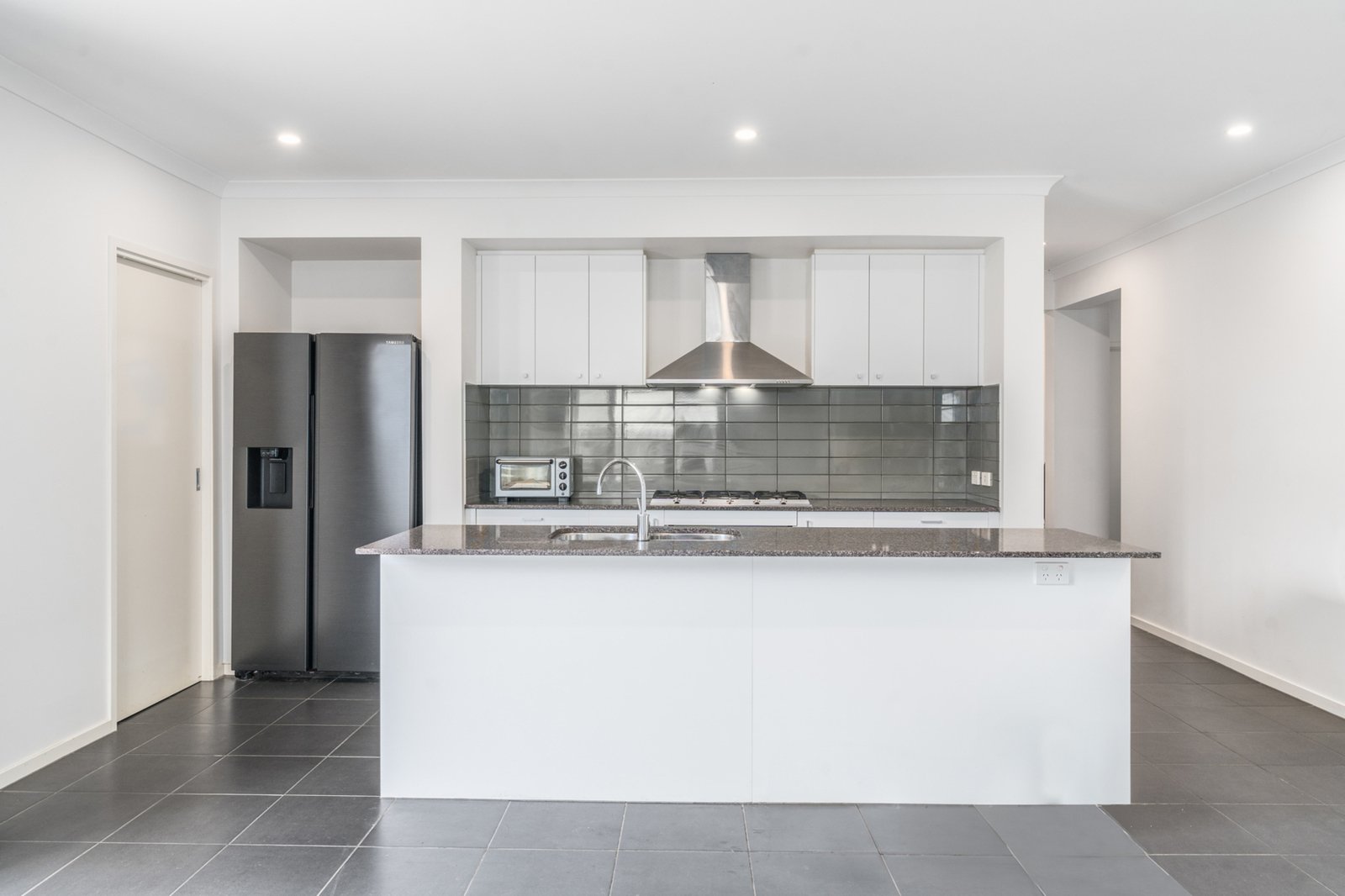 This modern façade showcases an open plan well-equipped kitchen, dining, and living area which provides a warm and welcoming space for family gatherings, featuring sleek stone benchtops with ample bench space, stainless steel appliances, and a walk-in pantry with plenty of storage, making everyday living effortless. Natural light fills the space, complemented by sliding doors that open seamlessly onto the covered alfresco area and generous backyard ideal for year-round entertaining.
