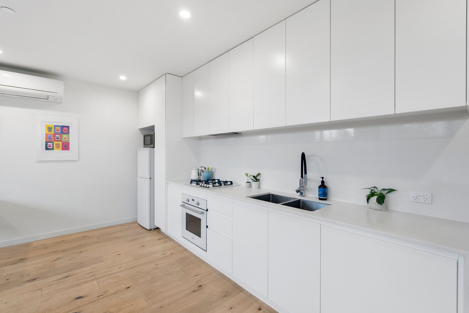 Designed for comfort and style, this home boasts a light-filled open-plan living and dining area that flows seamlessly to a full-width balcony through dual sliding glass doors — perfect for morning coffees or evening entertaining. The sleek white galley kitchen comes complete with a gas cooktop, oven, and integrated dishwasher, while timber floors enhance the modern feel of the living spaces.