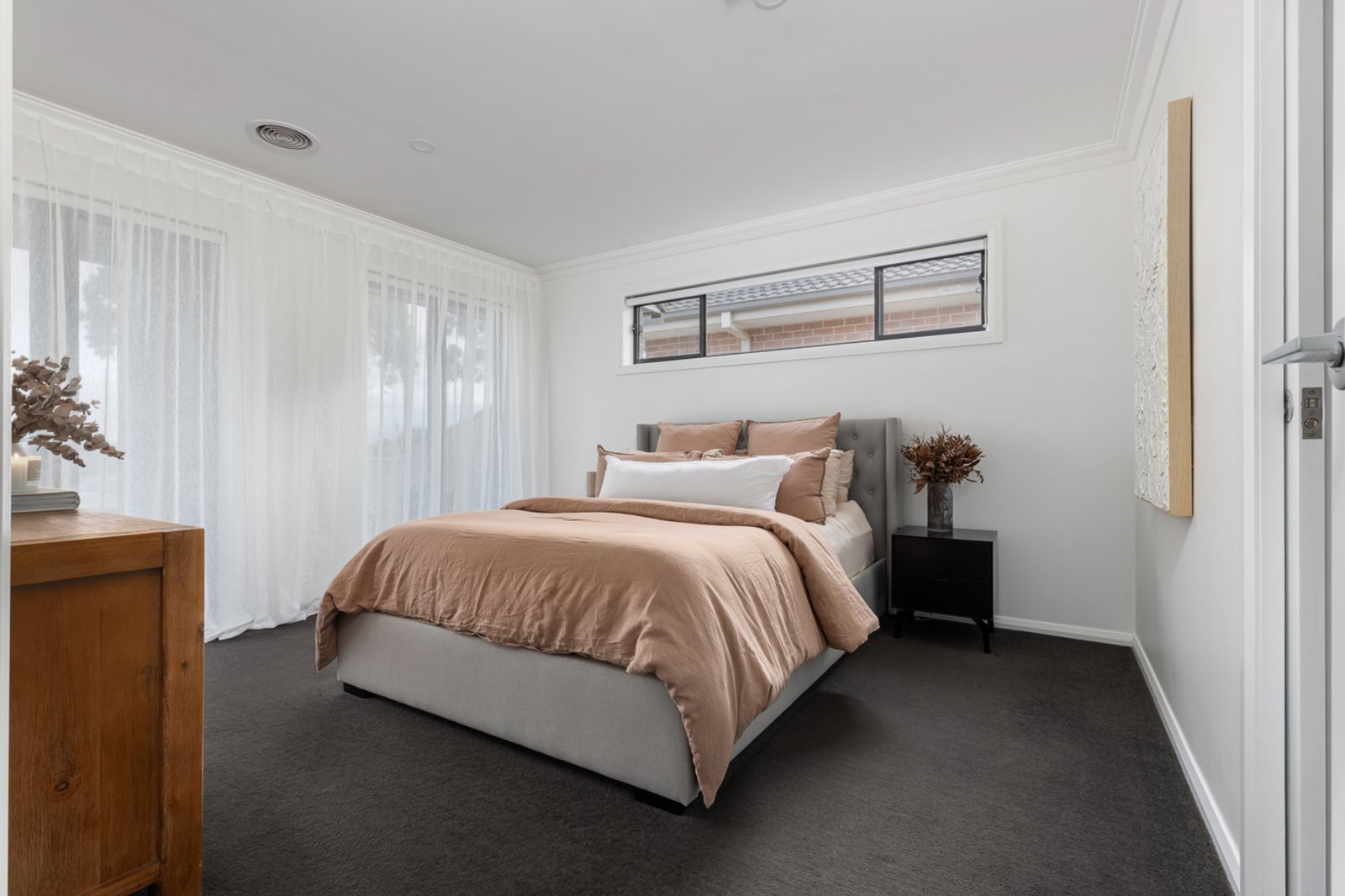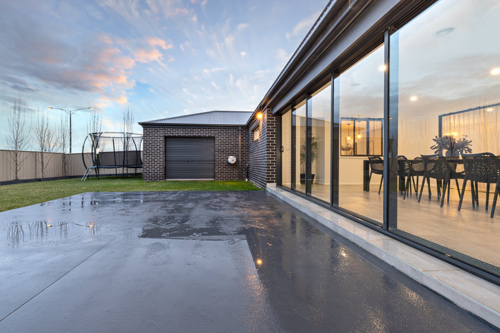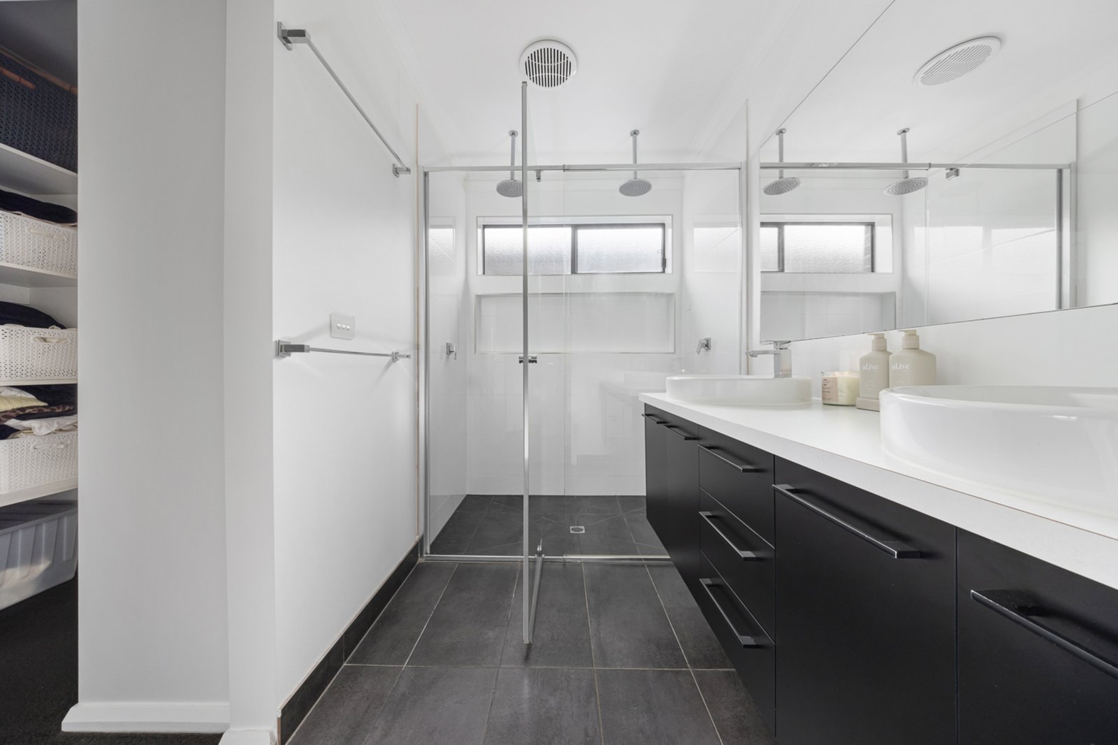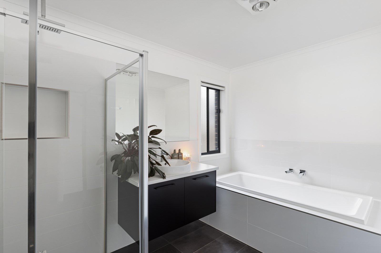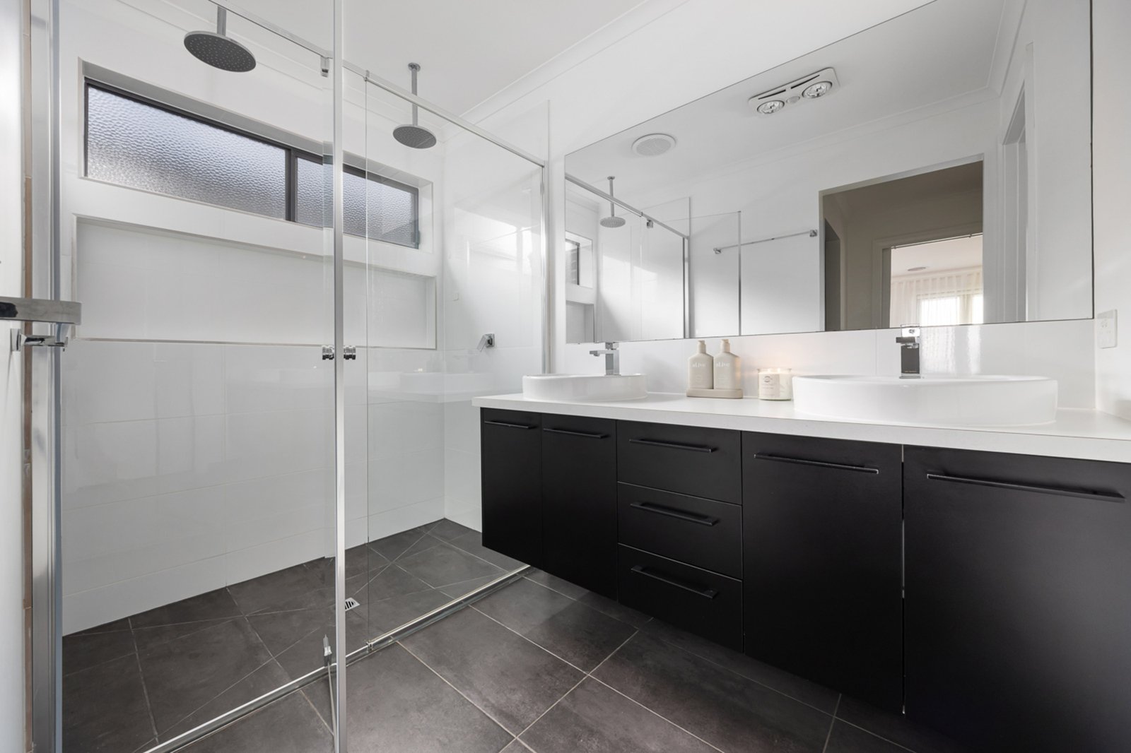 The main bathroom is sleek and family-friendly, complementing the home’s modern design and thoughtful layout. Gas central heating and evaporative cooling provide year-round comfort, while high-quality finishes enhance the overall appeal.