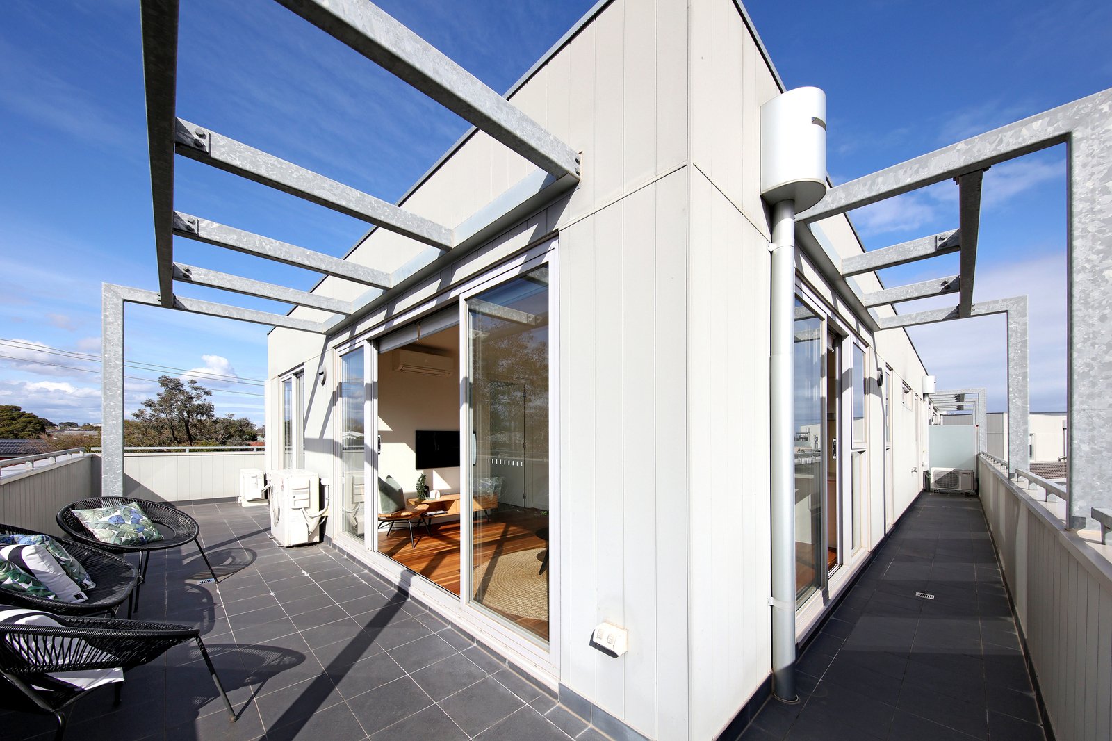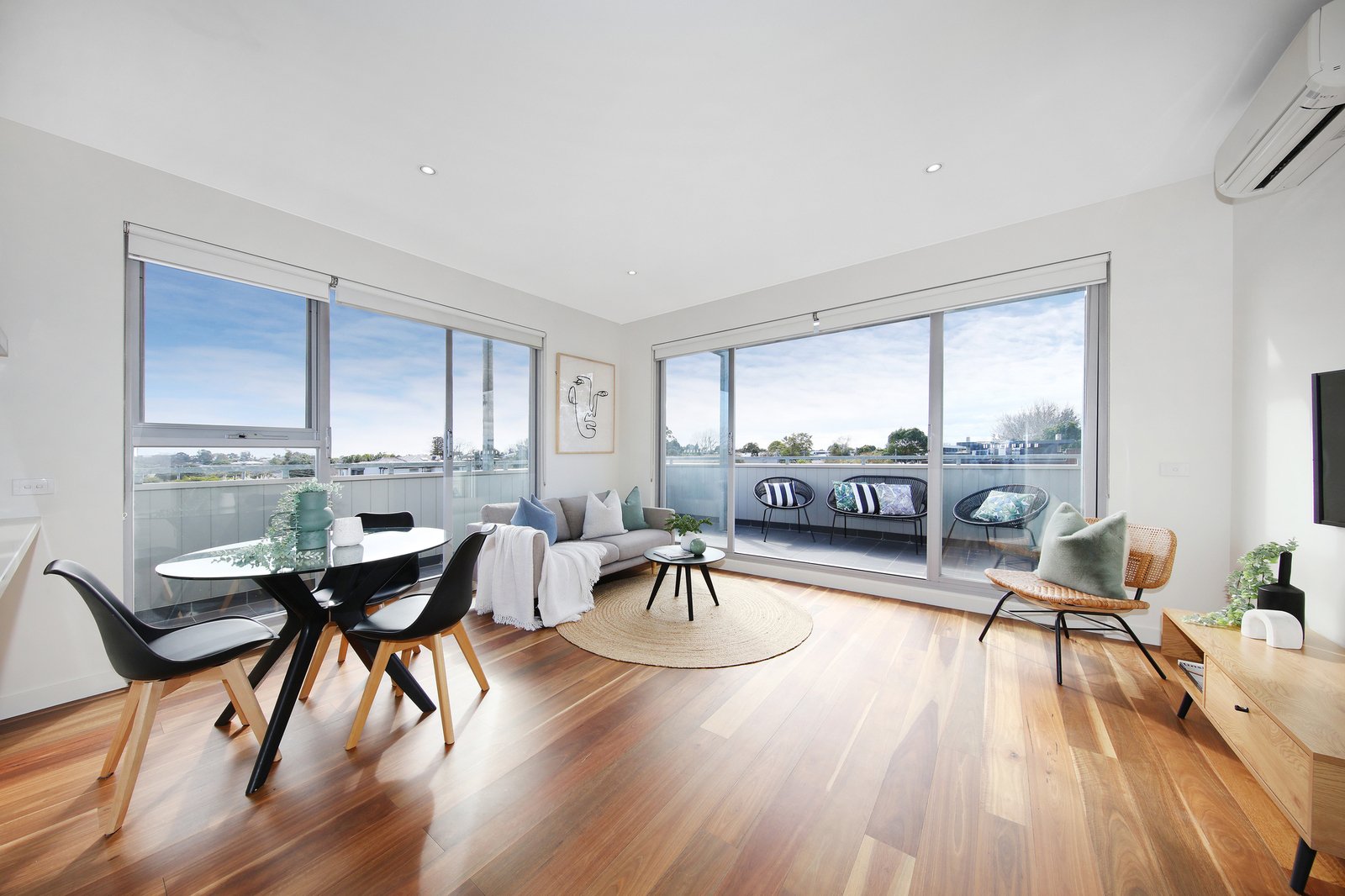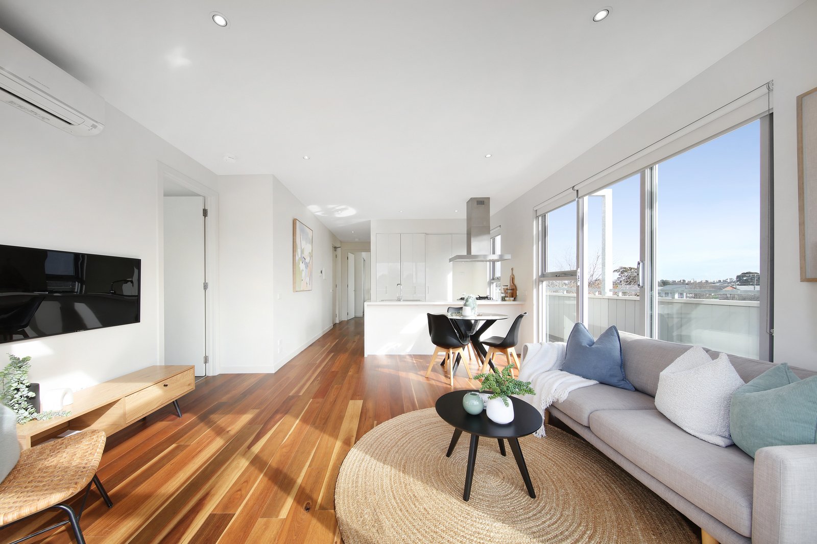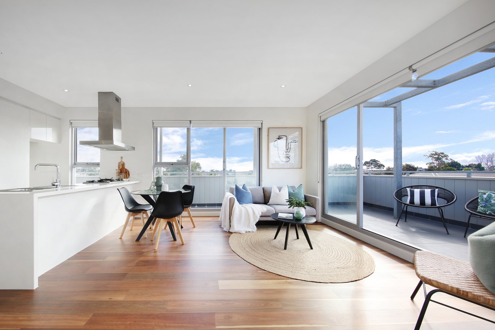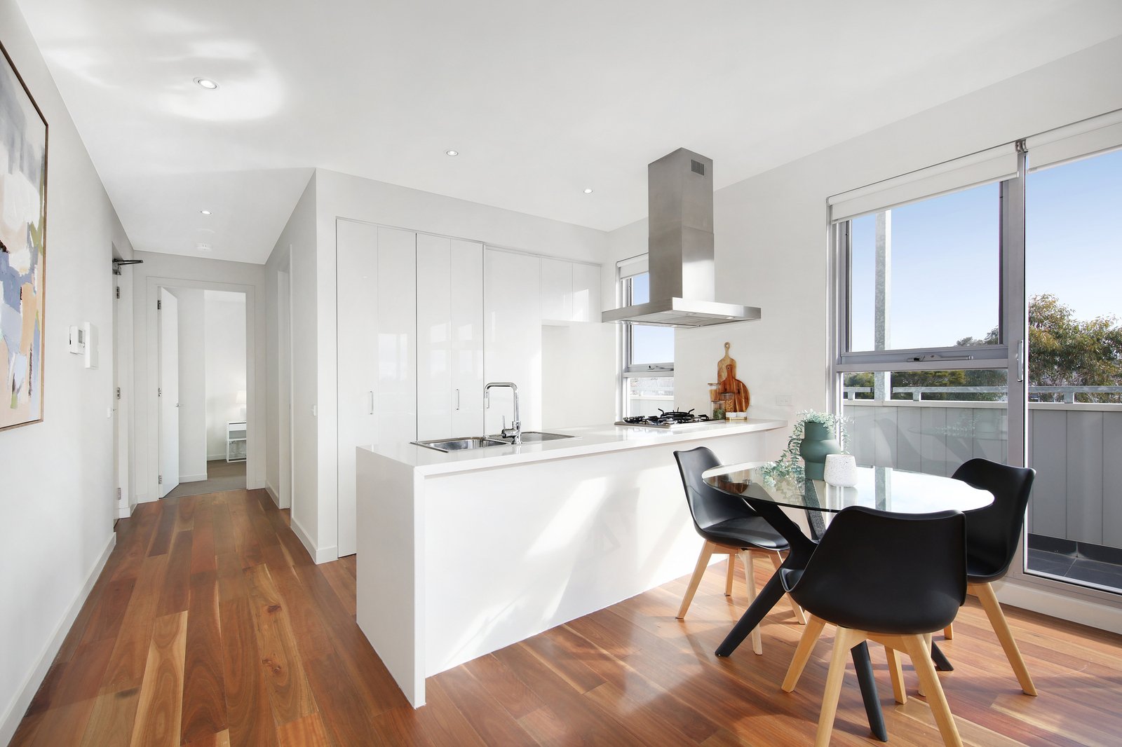 Take the lift to the top-floor, step out to a common area shared with just two neighbouring apartments, and live a penthouse life with a European appliance kitchen catching north-west sun across living-dining, and a wraparound balcony catching views across the treetops - from city-sparkle to the Dandenongs!