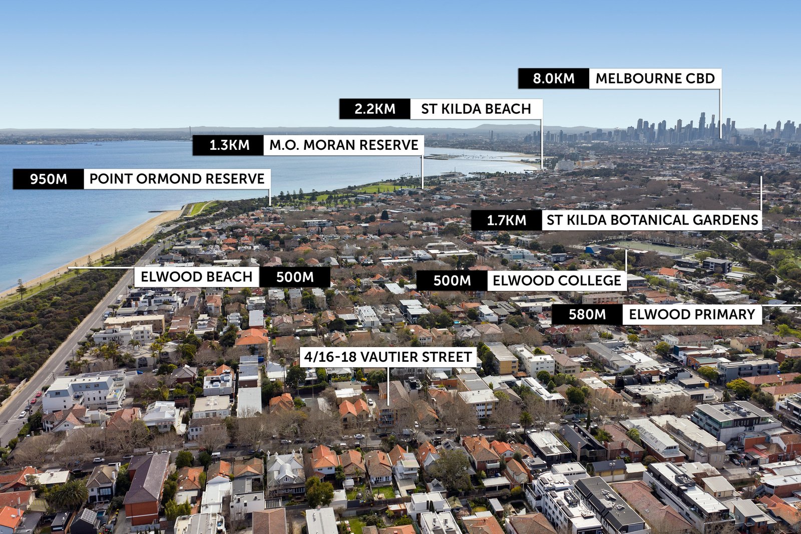 Ideally situated in a quiet, leafy street, it’s hard to believe you are mere metres from the vibrant hub of Elwood. At one end of the street discover the many cafés, restaurants and shops within Elwood Village, while at the other, Elwood Park and foreshore overlook the tranquil waters of the bay, providing a serene sanctuary for outdoor enjoyment. Also within walking distance, Brighton Road trams, Elsternwick train station, Elwood Primary and Elwood College, with St Kilda Beach, Albert Park Lake and the CBD also easily accessed.
