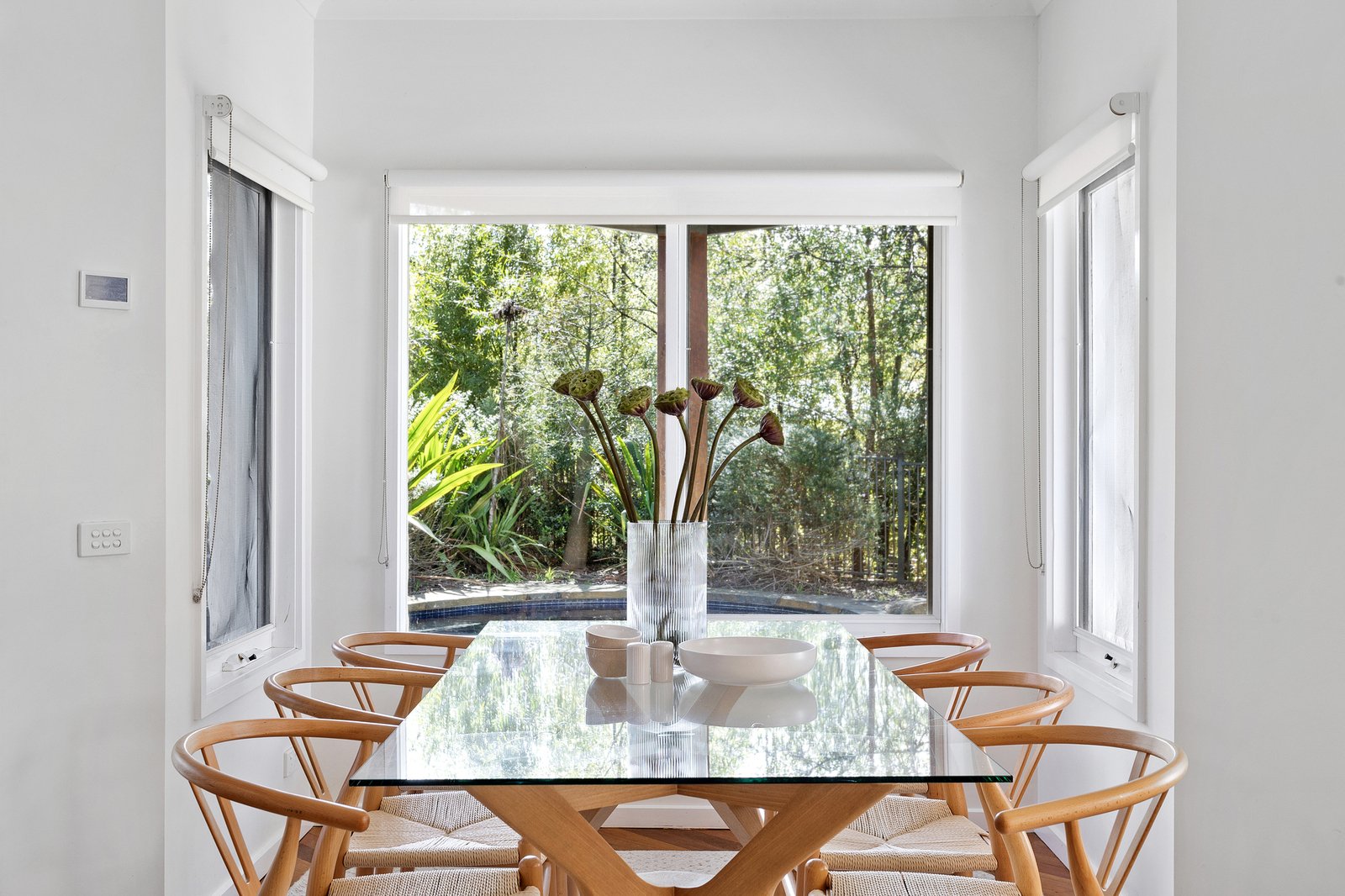A solid timber double door on entry sets a tone of craftsmanship, its warmth foreshadowing dual-level interiors of refined distinction and an earthy palette. Angular clerestory windows and soaring ceilings draw light and landscape into the living room, while hardwood floors and exposed timber detailing add natural richness to a kitchen appointed with a gas cooktop and walk-in pantry, oriented to frame views across the north-facing entertaining deck. A built-in barbecue, firepit, heated pool and spa edged in bluestone crazy paving enhance the idyllic surrounds, with every element of leisure considered for memorable gatherings and family enjoyment.