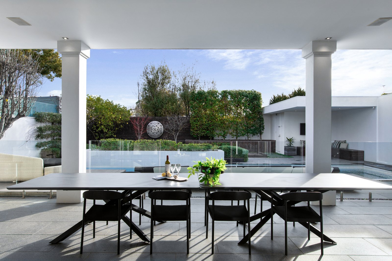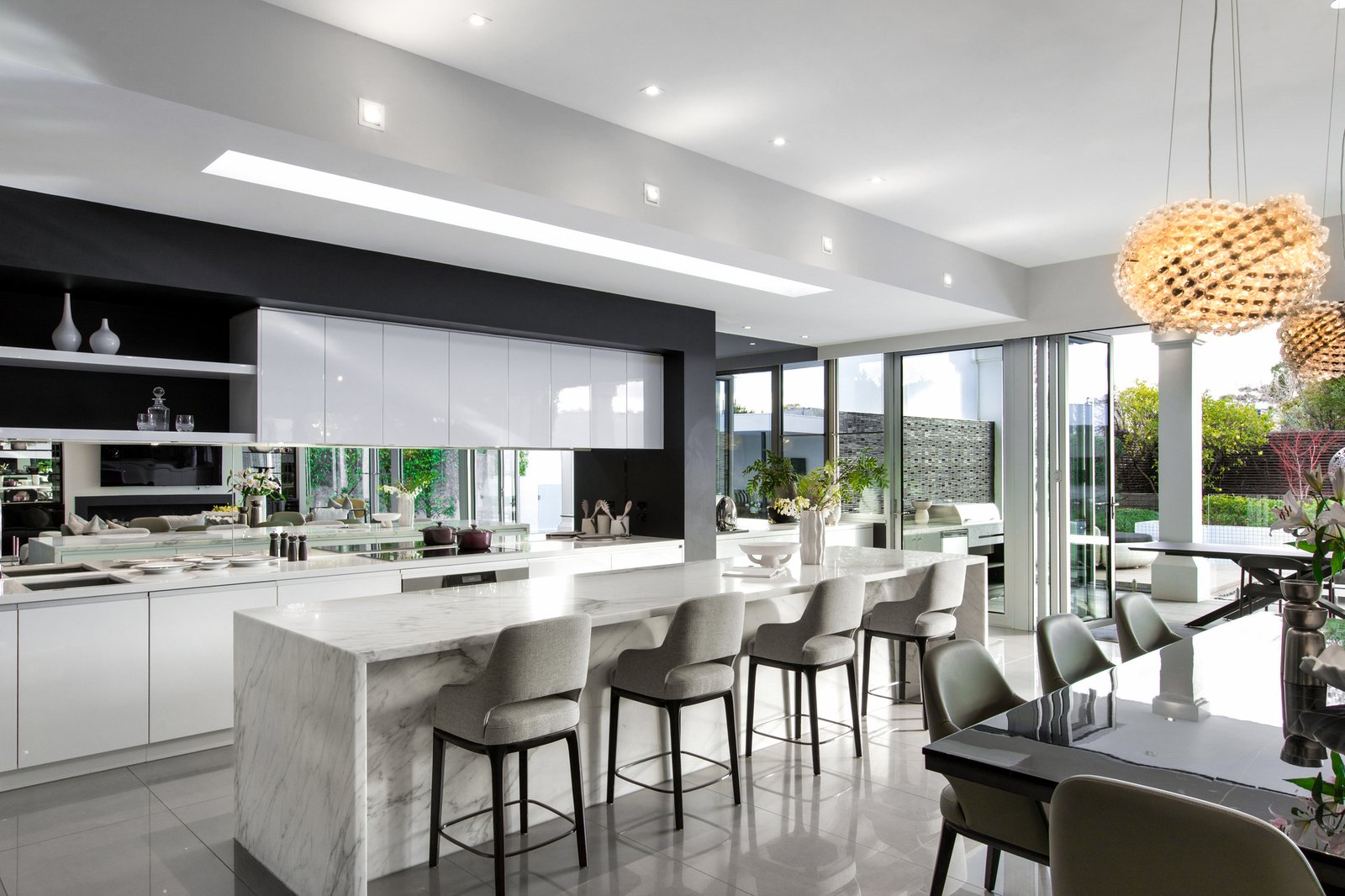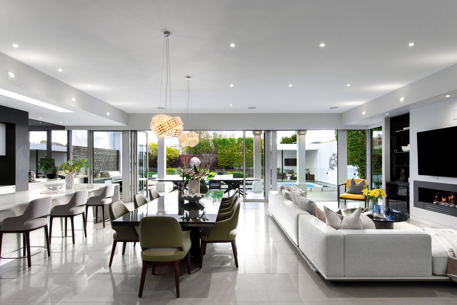 Dedicated to indoor-outdoor entertaining, the open and airy kitchen, dining and family room showcase a gas fireplace, marble island breakfast bench, integrated Liebherr fridge/freezer, Miele appliances (induction stove, oven, steamer, warming drawer, coffee machine and dishwasher) plus a butler’s pantry with Zip tap and concealed bar.