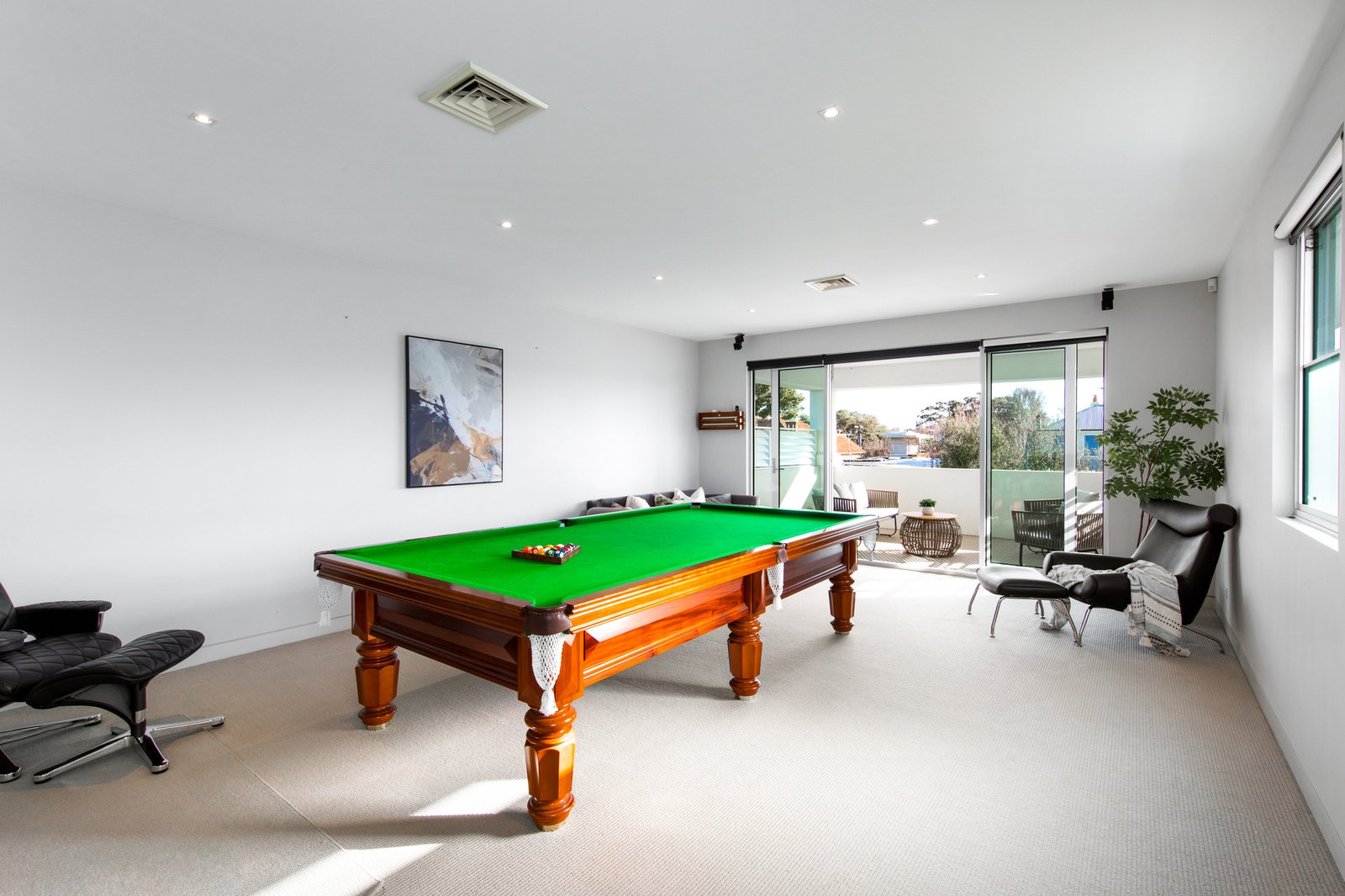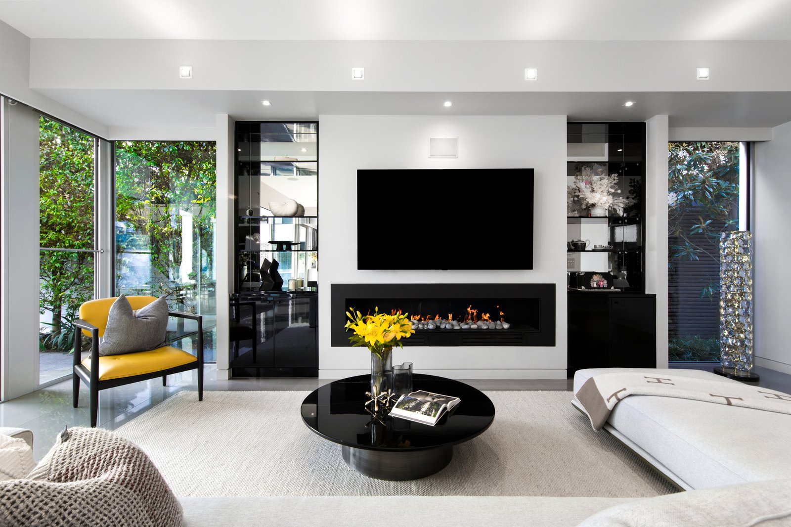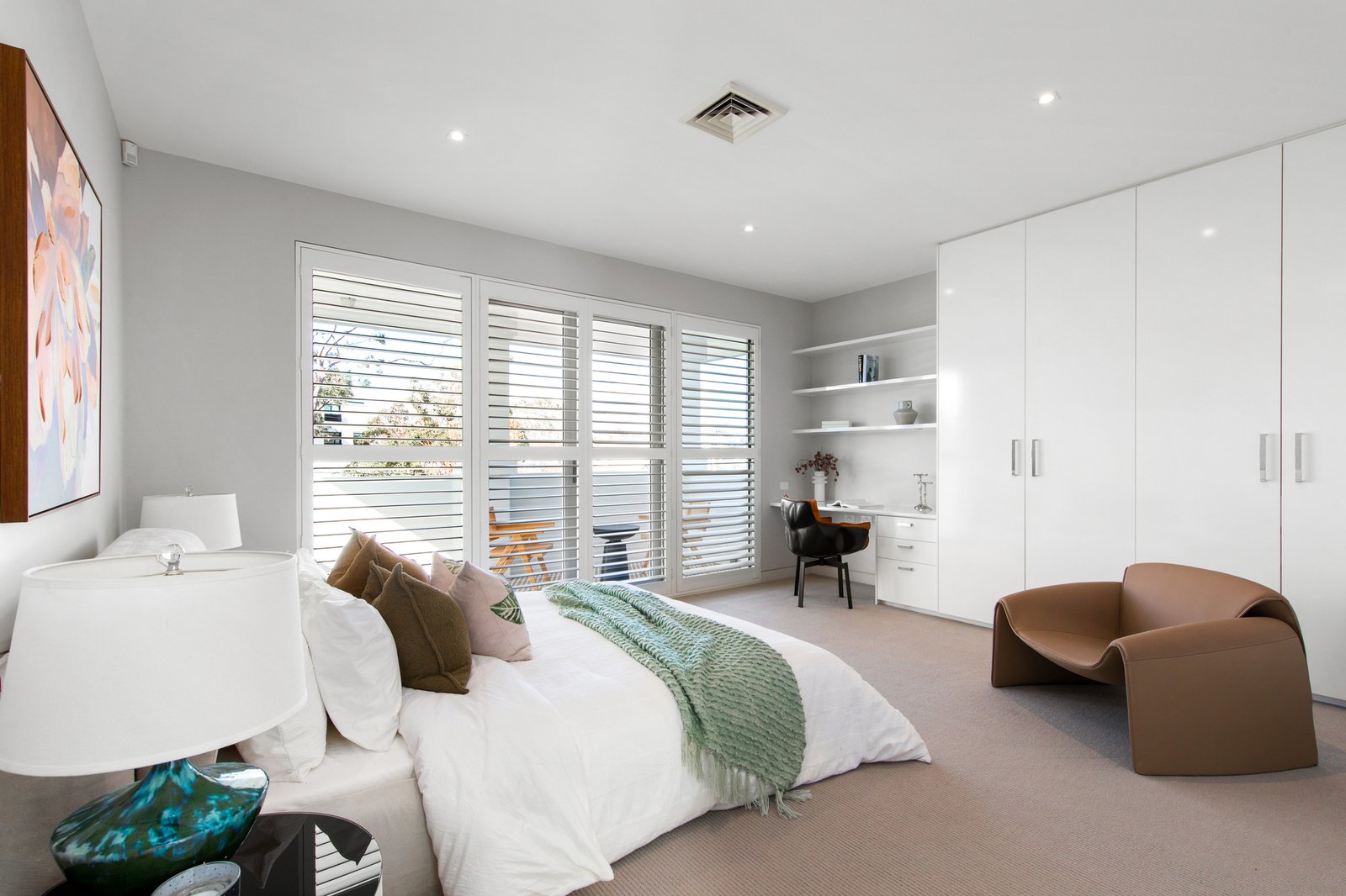 Dedicated to indoor-outdoor entertaining, the open and airy kitchen, dining and family room showcase a gas fireplace, marble island breakfast bench, integrated Liebherr fridge/freezer, Miele appliances (induction stove, oven, steamer, warming drawer, coffee machine and dishwasher) plus a butler’s pantry with Zip tap and concealed bar.