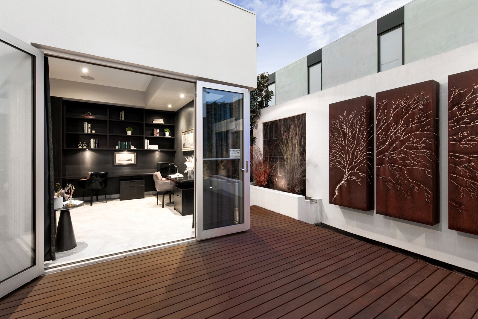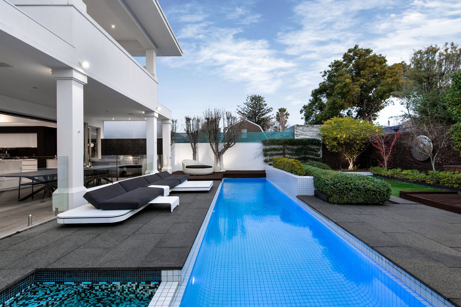 Promoting privacy, the home’s secure entry welcomes with a glamorous garden design before unfolding to reveal a sumptuous formal lounge boasting a gas log fire and direct access onto a north-facing deck with water feature.
