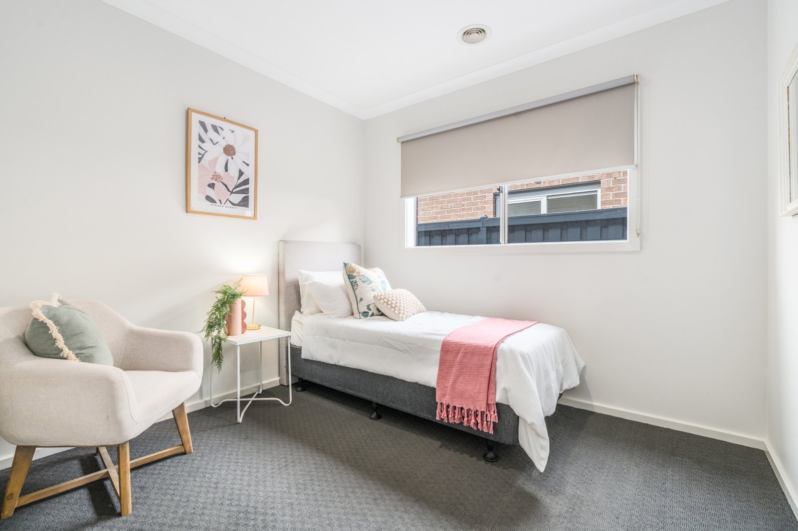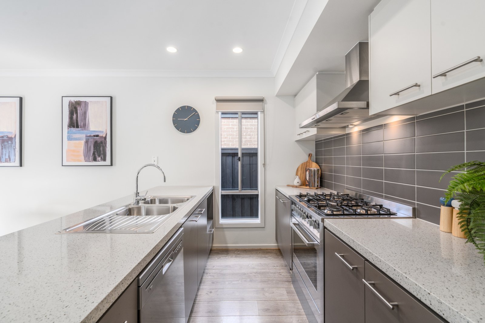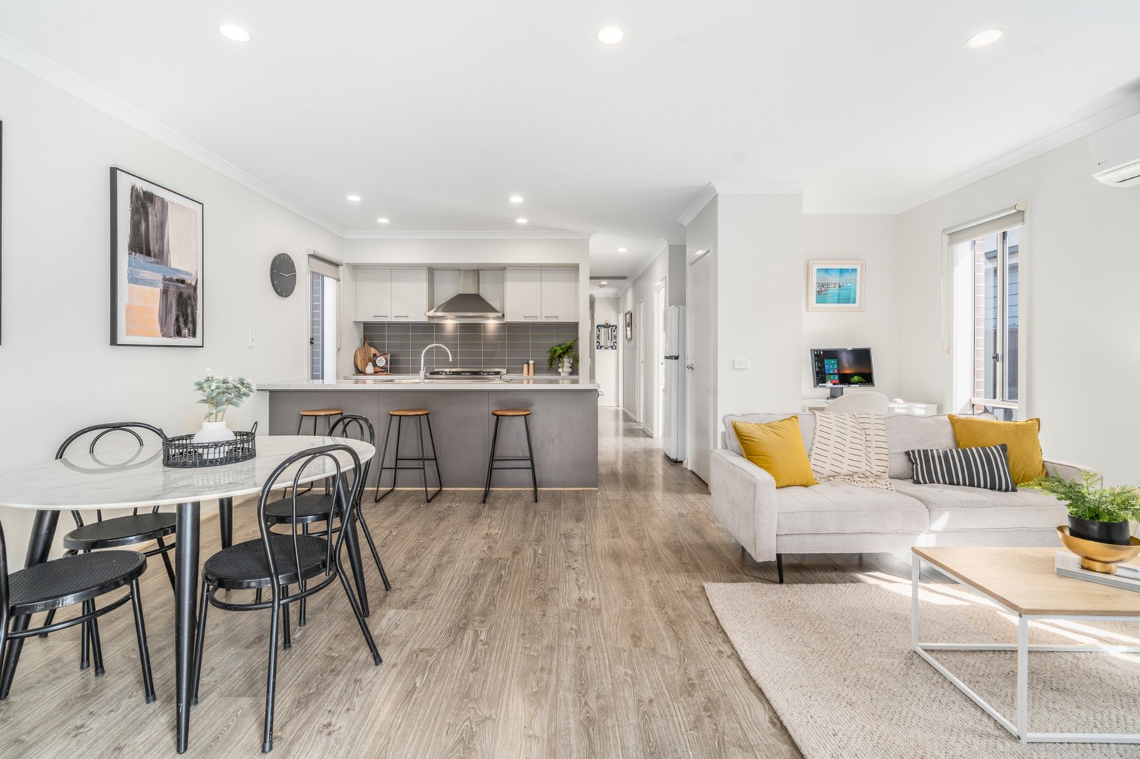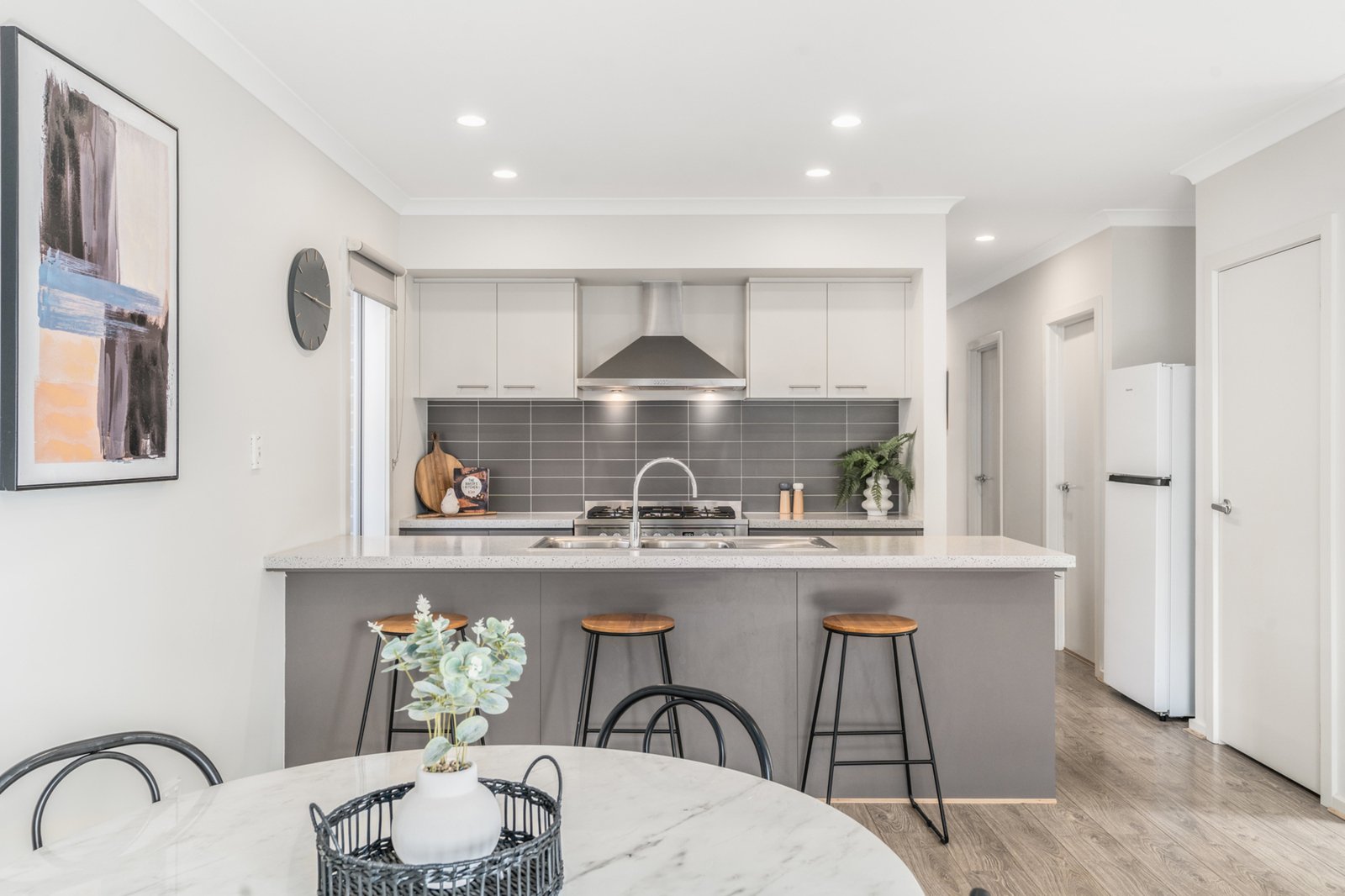 Featuring 3 bedrooms, 2 bathrooms and a single car garage with internal access on a 261m² block, this home offers effortless modern living. The well-appointed kitchen showcases subway tiles, stone benches, plumbing for the fridge, stainless steel appliances including a 900mm freestanding oven with 5-burner gas cooktop, range hood and dishwasher. Flowing seamlessly from the kitchen, the open-plan living and dining area extends through sliding doors to an undercover alfresco with café blinds – the perfect space for year-round entertaining.